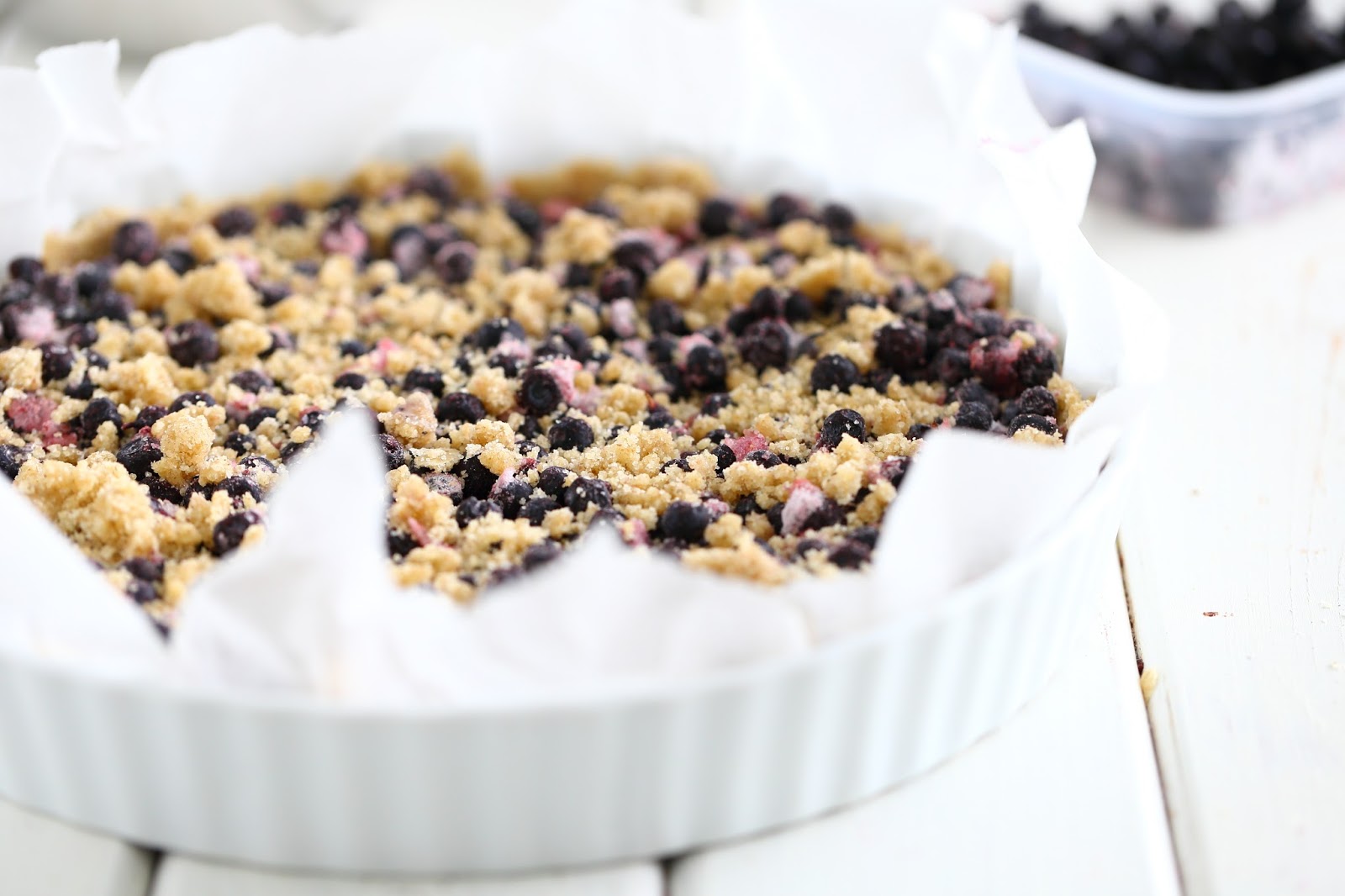 Ota talteen muruseoksesta eri kippoon n. 1 dl. Tämä muruseos lisätään mustikoiden päälle aivan lopuksi. Levitä loput muruseoksesta kevyesti voideltuun tai leivinpaperilla vuorattuun uunivuokaan. Nostele taikinaa vuoan reunoille ja painele muualtakin tasaisemmaksi.