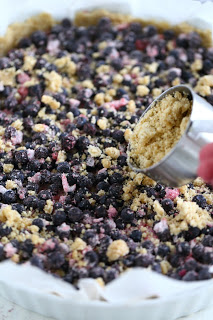 Lisää mustikoiden joukkoon perunajauhot ja hillosokeri. Kaada pohjan päälle. Ripottele pinnalle vielä erikseen otettu muruseos.