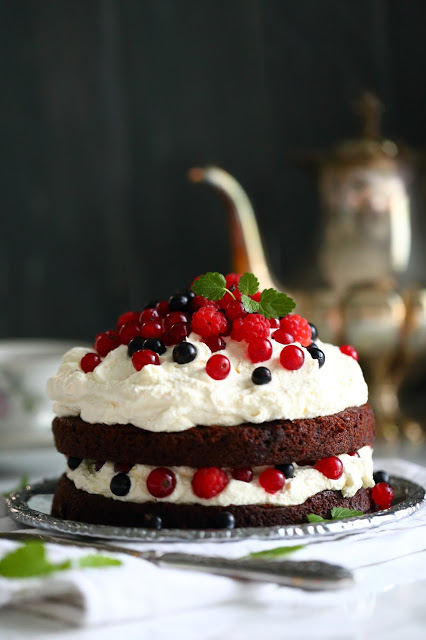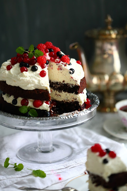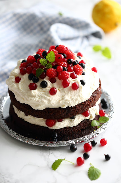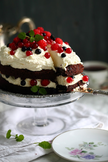 Tein kakun löydettyäni pakkasen kätköistä kaksi mielettömän mehevän suklaakakkupohjan palaa. Aikaa kakun väsäämiseen oli hintsusti, joten väliin päätyi helppo ja nopea valkosuklaamousse sekä reilusti pihapensaista poimittuja herukoita ja vadelmia.