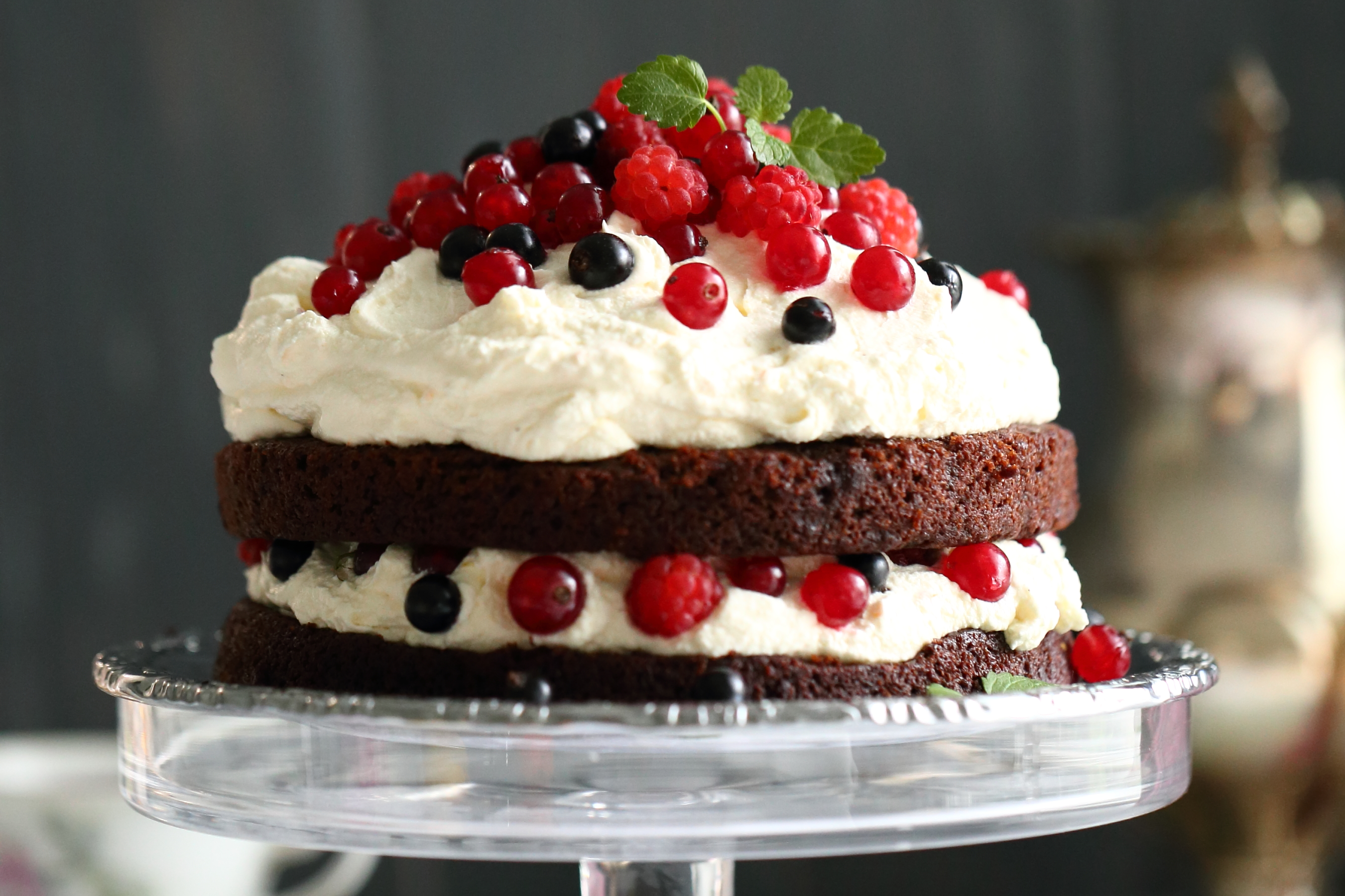 Helppo valkosuklaamoussetäytteinen kakku suklaakakkupohjalla ja tuoreillla marjoilla