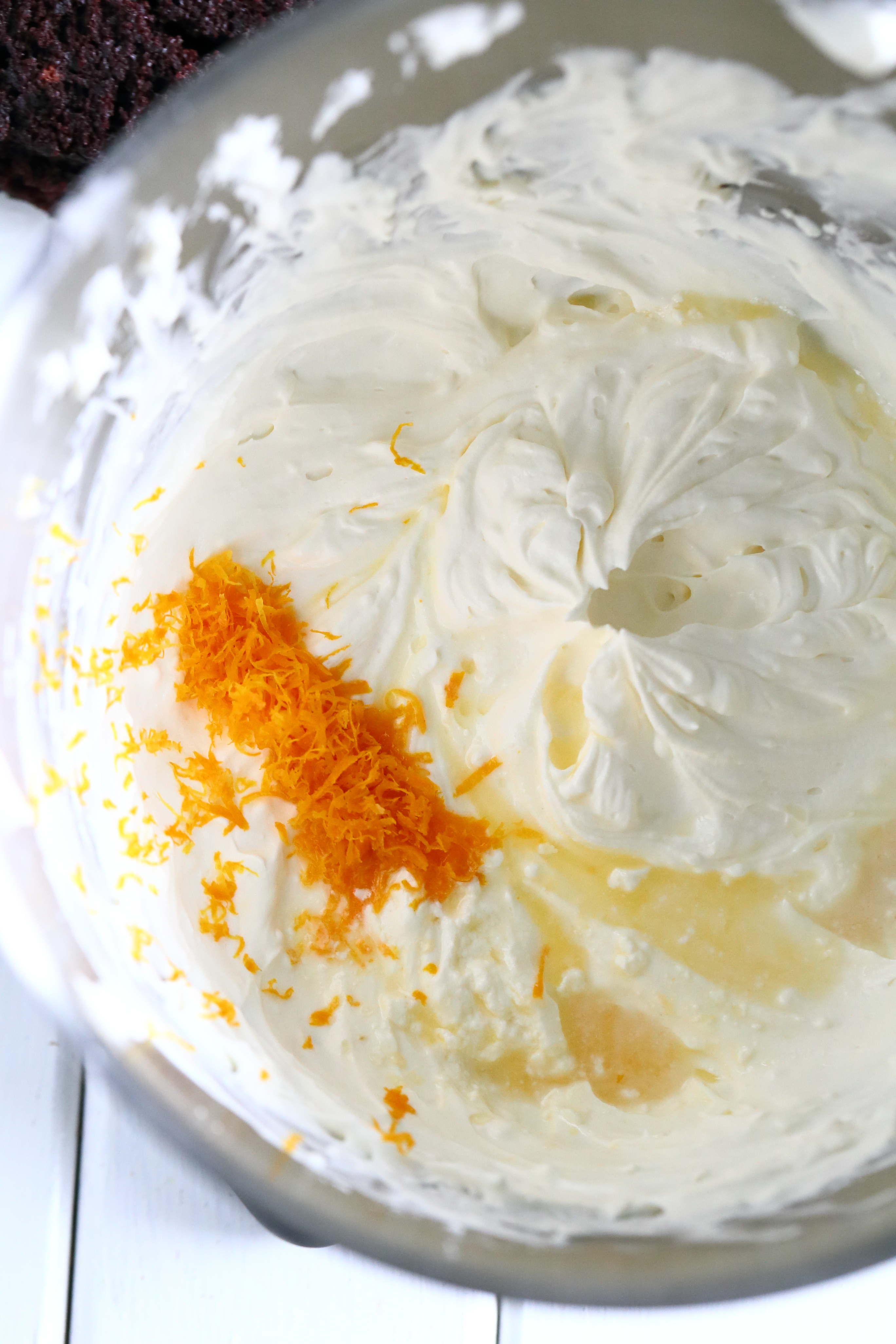 Sulata suklaa mikrossa varovasti n. 15 sekunnin välein sekoitellen, kunnes suklaa on kokonaan sulanut. Jätä odottamaan. Vatkaa kerma löysähköksi vaahdoksi. Vatkaa joukkoon notkistetut tuorejuustot. Tässä vaiheessa vaahto hieman paksenee lisää. Pese appelsiinin kuori kunnolla ja raasta hienolla terällä. Lisää kuoriraaste sekä n. 1.5 rkl appelsiinin mehua kerma-tuorejuustoseokseen.