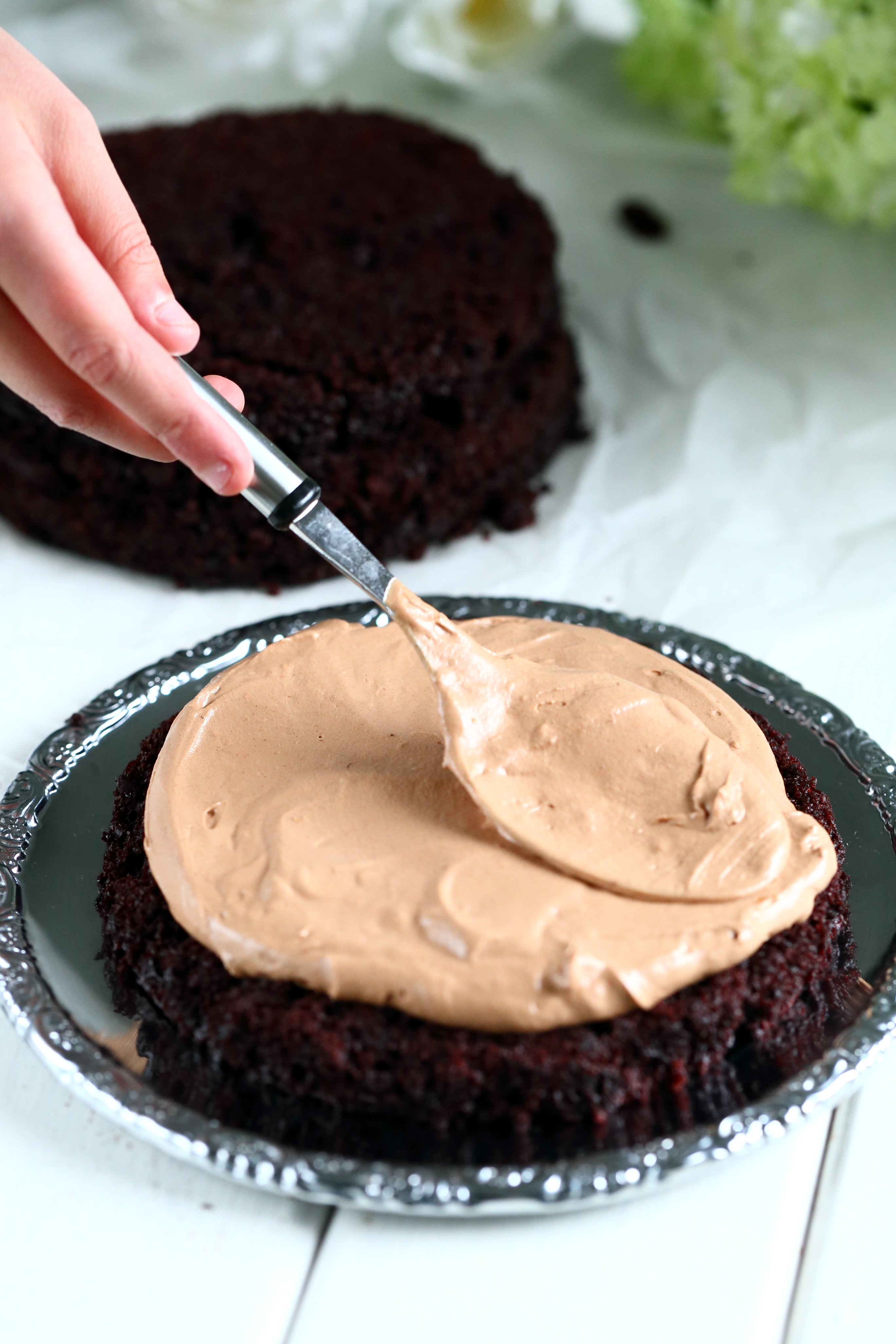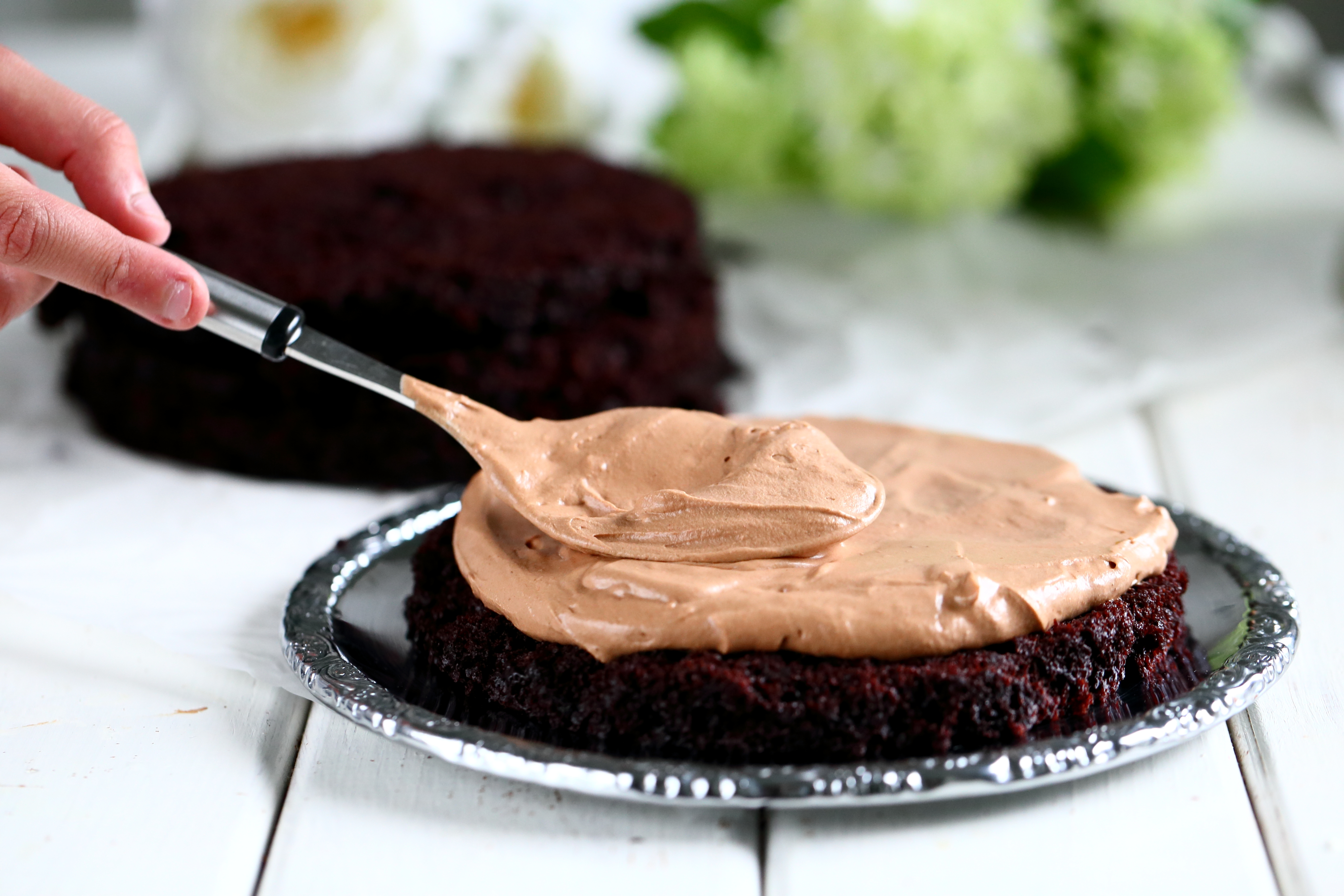 Vatkaa, kunnes seos hieman paksenee. Lisää sulanut (EI KUUMA!) suklaa täytteen joukkoon ja vatkaa kunnolla sekaisin.