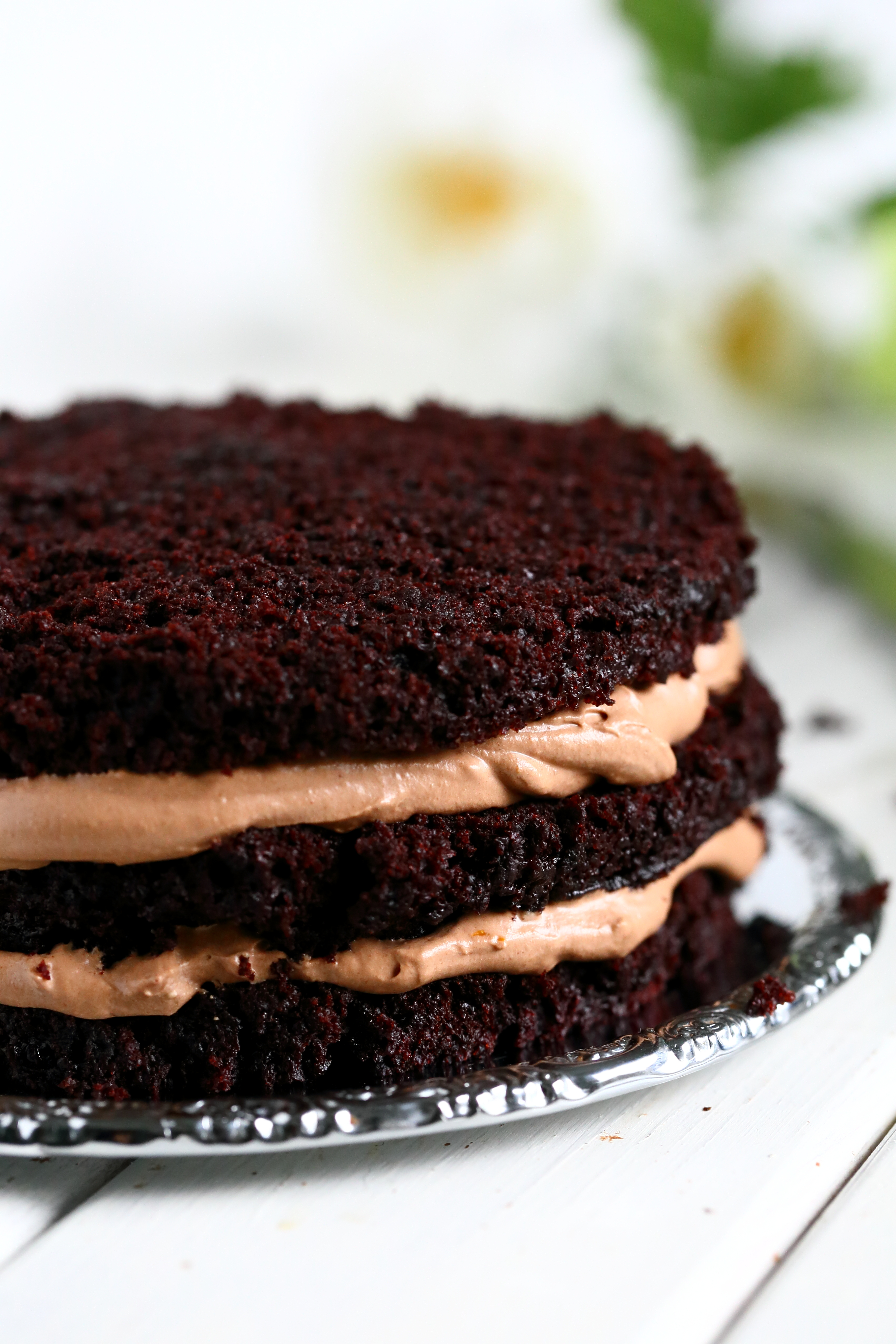 Olen niin tykästynyt tällaisiin liivatteettomiin täytteisiin. Ne ovat aina hieman helpompia ja nopeampia tehdä, ja myös koostumus on pehmoinen. Ja sopivat myös heille, jotka karttavat liivatetta syystä tai toisesta. Täytteen hyytyminen tapahtuu tässä suklaan voimin. Hyytyminen saattaa näyttää epätoivoiselta useamman tunnin ajan, joten anna täytetyn kakun olla rauhassa jääkaapissa vaikkapa yön yli. Itse pelkäsin hyytymistä, kun menin sörkkimään kakkua jo 5 tunnin jälkeen ja se oli edelleen liian pehmeää. Meni useampi tunti, mutta sitten, yhtäkkiä se jämähti. Jämähtämisellä tarkoitan sitä, että täytteestä tuli tarpeeksi tukeva, jotta kakku pysyi hyvin koossa. Täyte ei kuitenkaan ole mitään tiukkaa tavaraa vaan se on jämähtämisestä huolimatta pehmeää ja suussasulavaa. Ja makukin on todella herkullinen. Mikäli tykkää Fazerinasta, tykkää luultavammin myös tästä täytteestä. Ja vaikkei olisikaan Fazerinan ylimpiä ystäviä, tämä täyte saattaa yllättää positiivisesti!