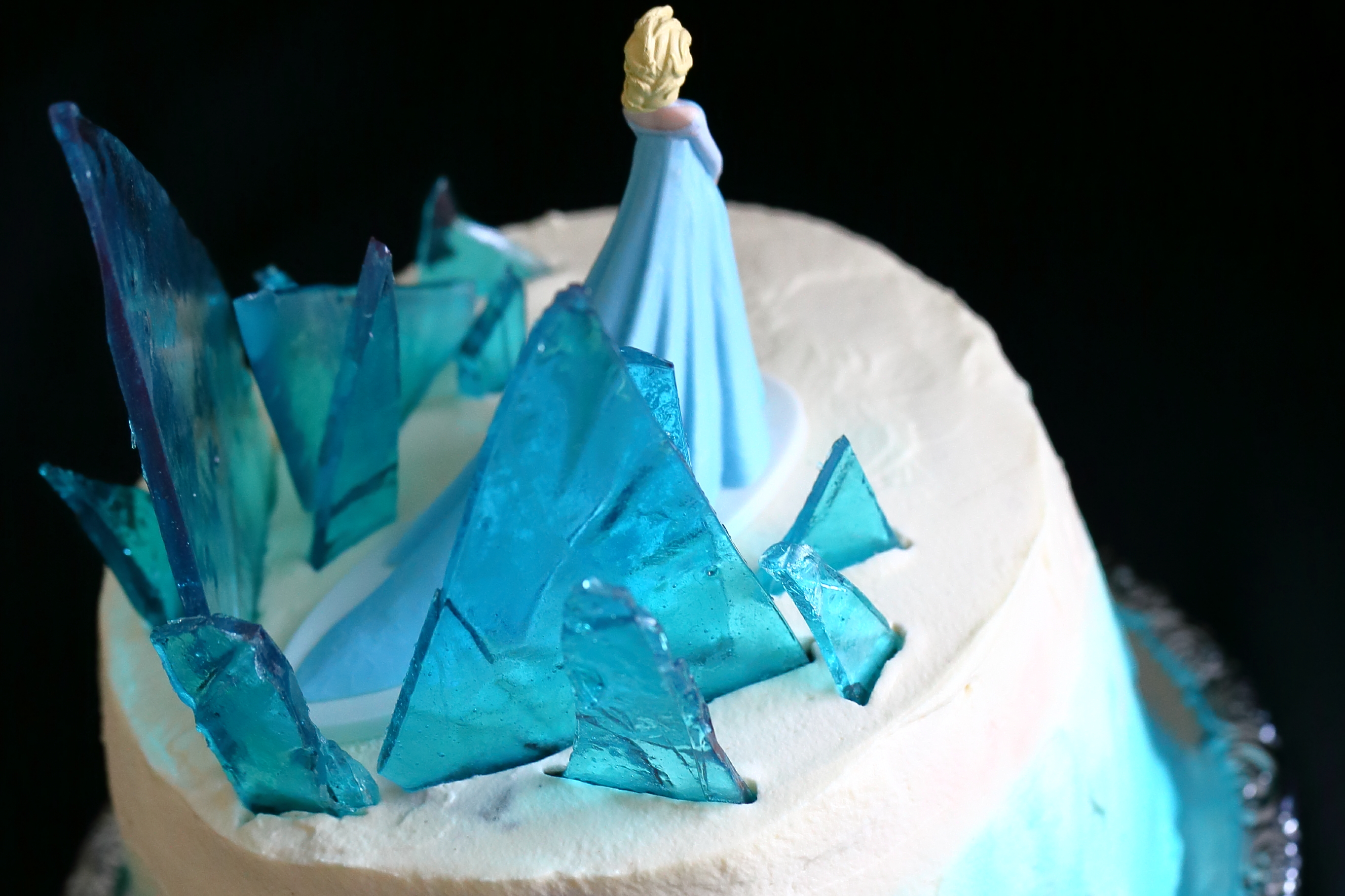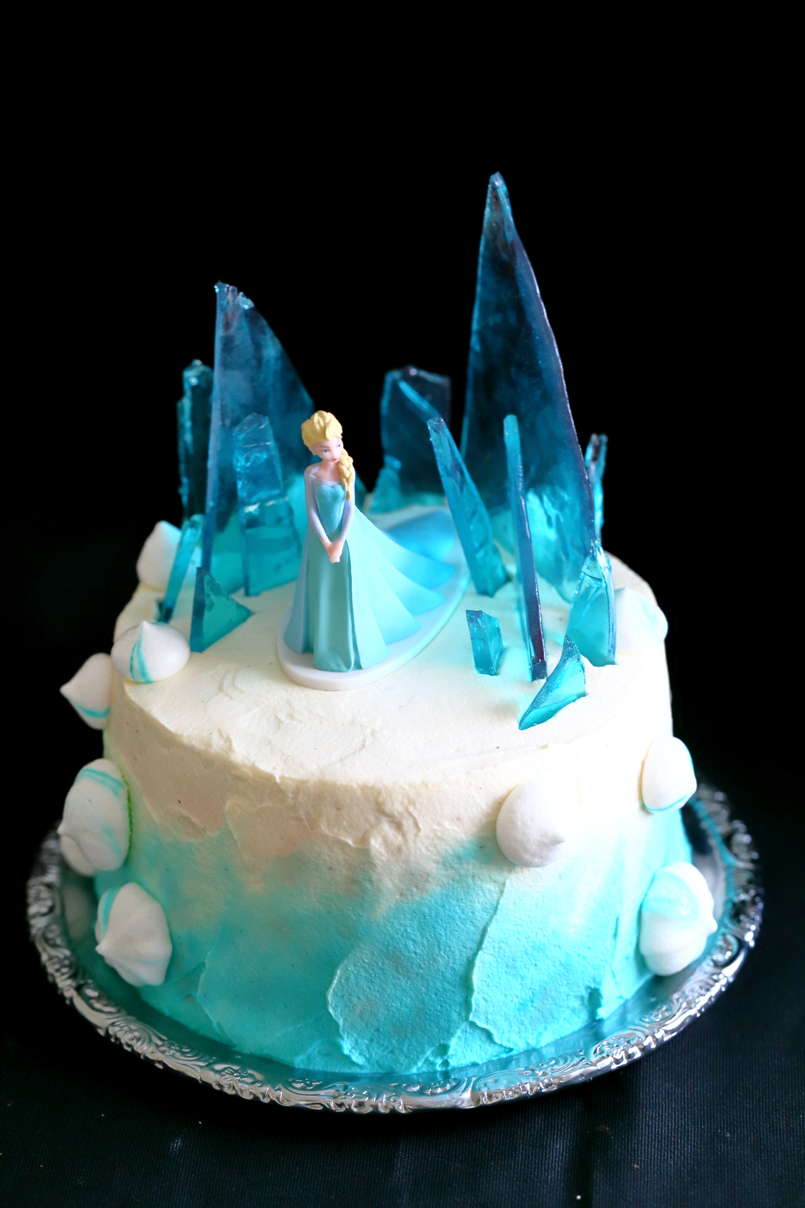 Mein 5-vuotiaan Frozen-fanitus jatkuu tänäkin vuonna. Hän halusi kuukausi sitten vietetyille synttäreilleen jälleen Elsa-aiheisen kakun. Kakun päälle päätyikin viime vuoden Frozen-kakkua koristanut Elsa-koriste, mutta tällä kertaa vuorasin kakun itsetehdyn valkosuklaamassan sijasta kermavaahdolla ja laitoin koristeeksi Elsan lisäksi turkoosiksi värjättyjä kiiltäviä jääkarkkeja.