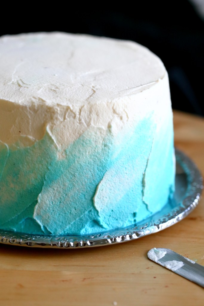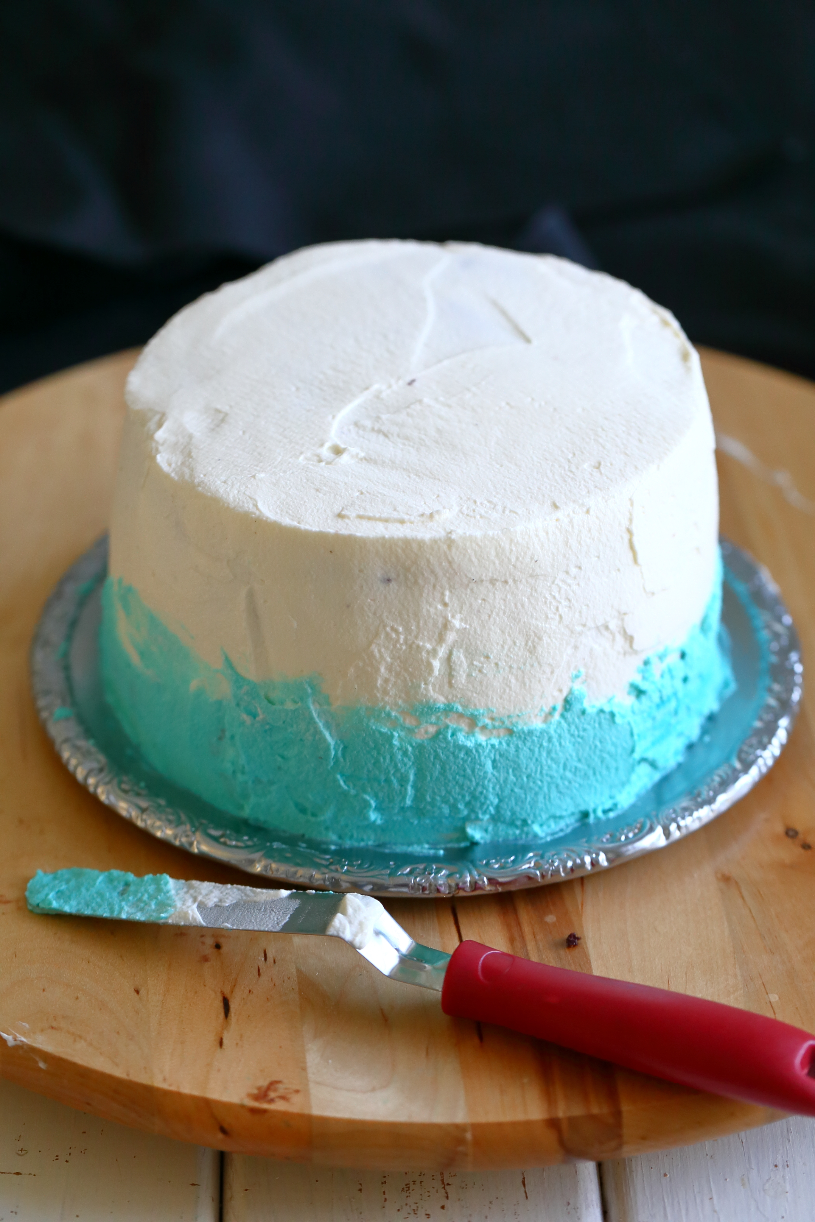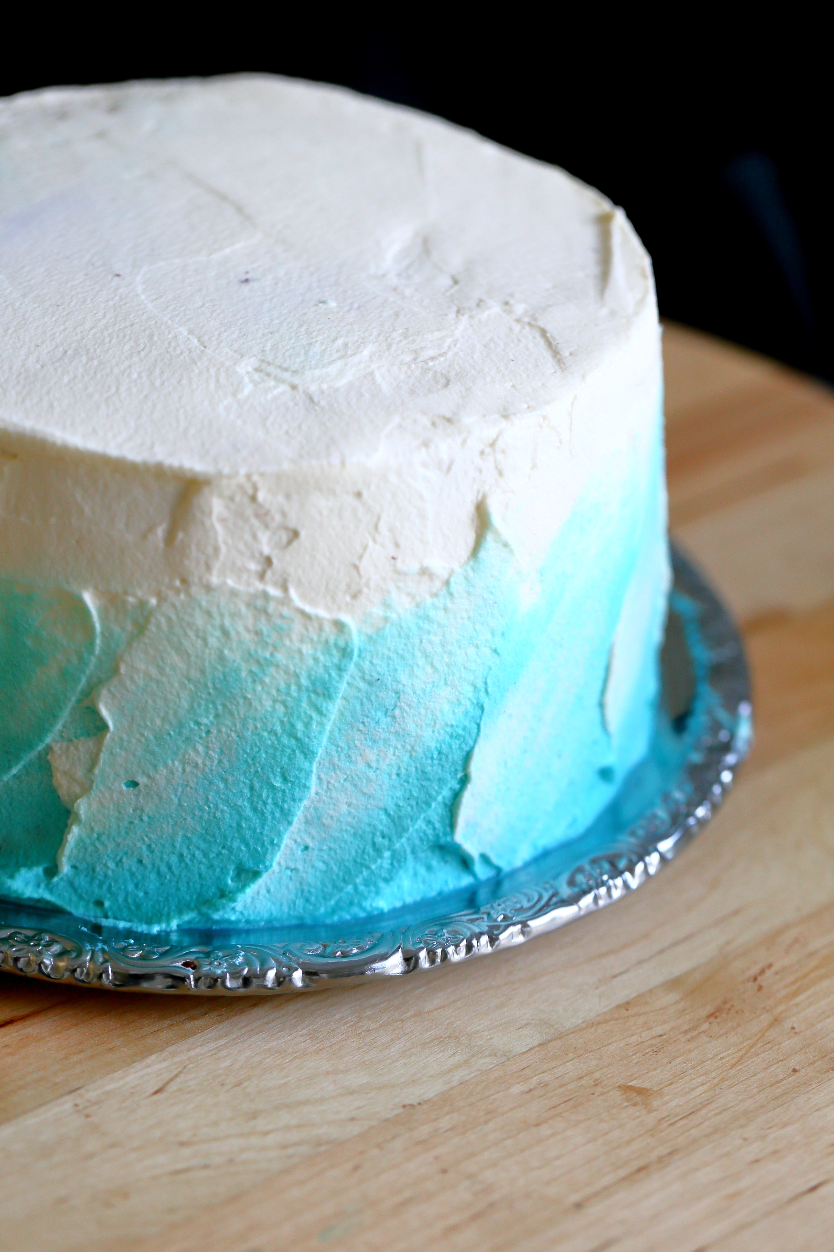 Kerman käyttö kakuissa on mulle melko uutta. Eseimmiten olen käyttänyt kakkujen päällä ihanan makuista valkosuklaamassaa. Päätin kuitenkin harjoitella kermavaahdon käyttämistä ja kuorrutin kakun jo päivää ennen tarjoilua. Pläästein kakun päälle sekä valkoista että turkoosilla ja sinisellä pastavärillä värjättyjä kermavaahtoja ja olin lopputulokseen tosi tyytyväinen. Mutta mutta. Ja voi kääk! Kuten varmaan huomaattekin, yön aikana kakun päällä oleva kermakerros hävisi johonkin ja sen alta paistoi kakun pinta läpi. Aikaa ei kuitenkaan tuossa vaiheessa kermapinnan korjaamiseen enää ollut, joten räpsin kuvat nopsaan tuosta ei-niin-nätistä pinnasta.