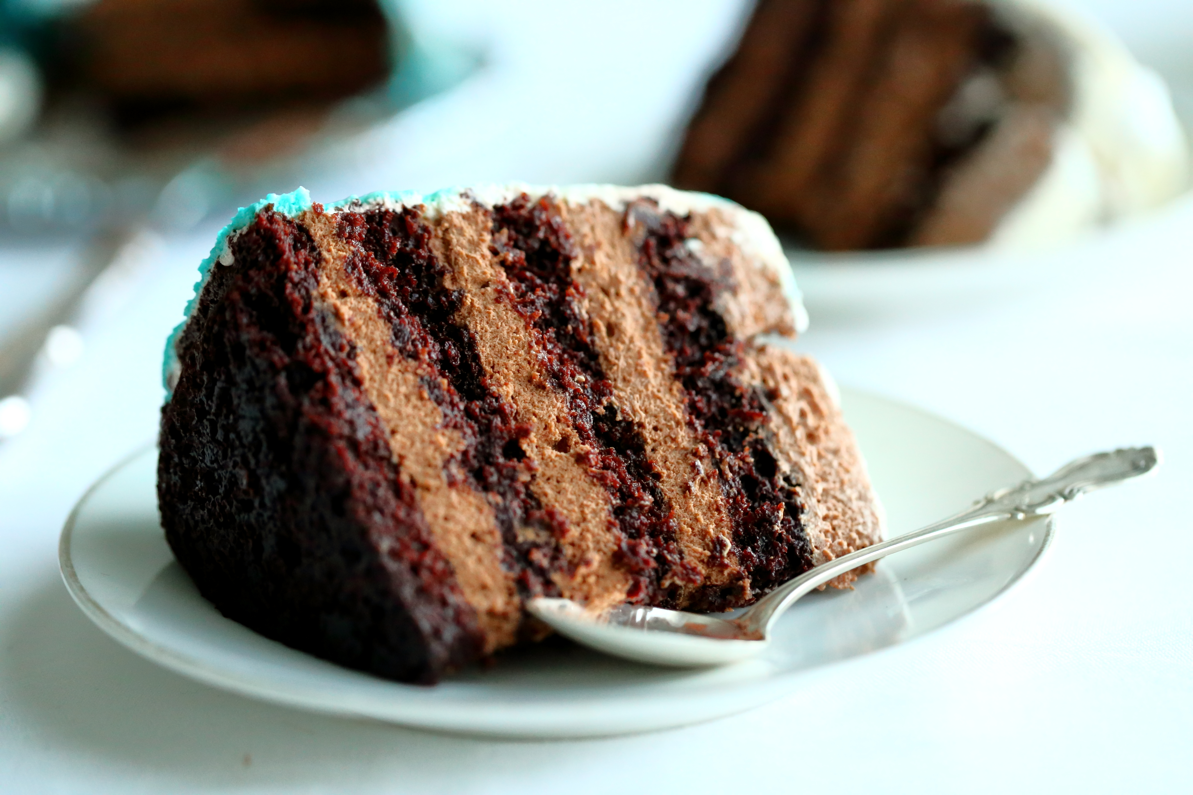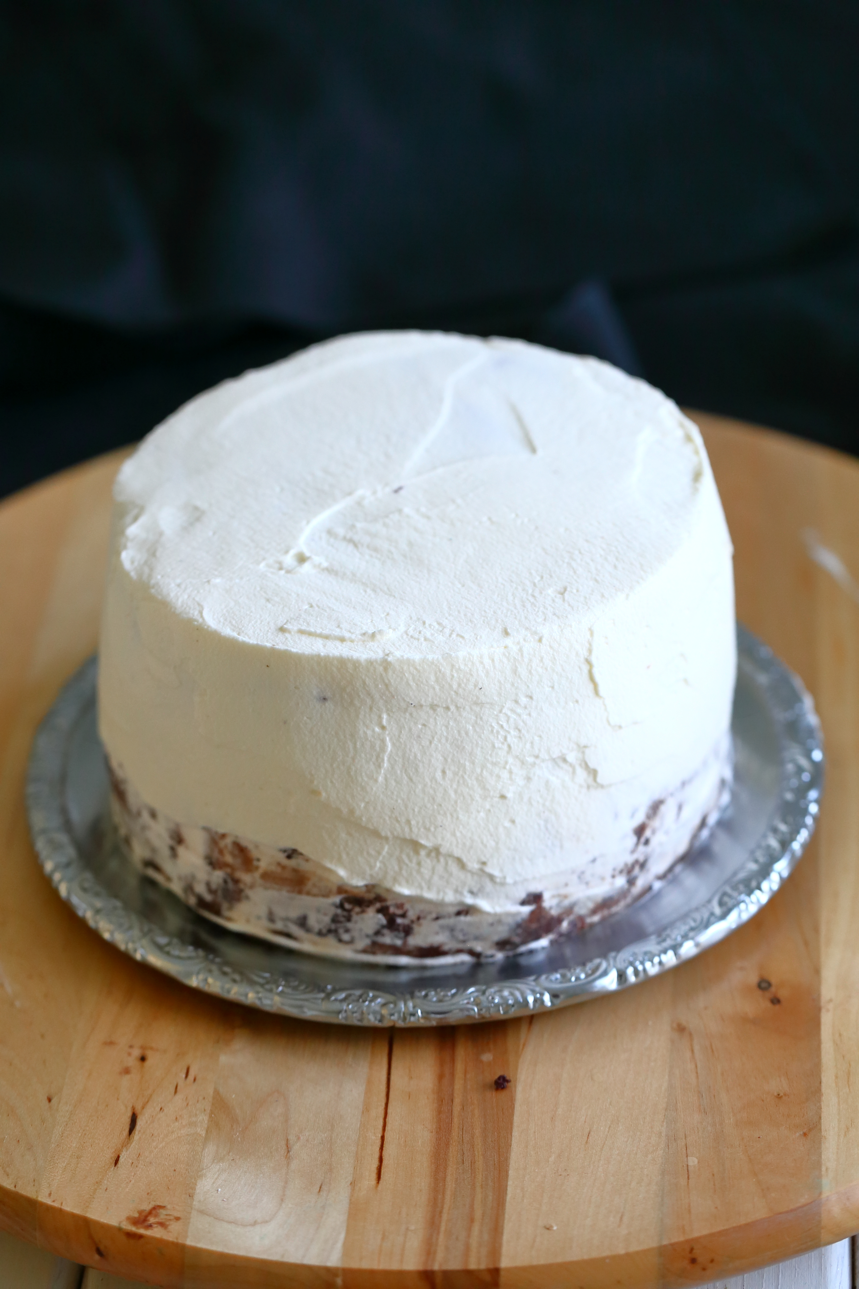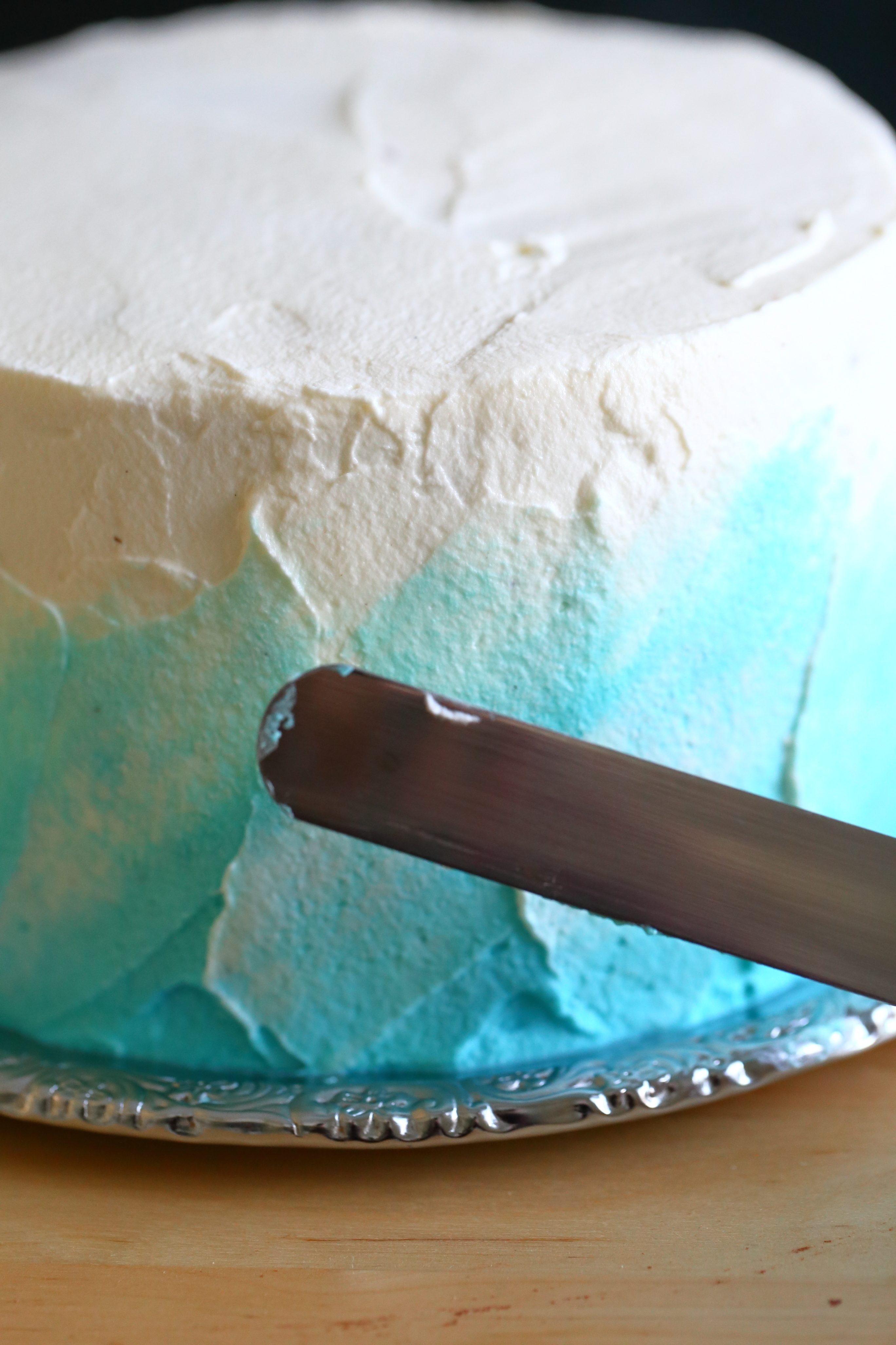Kerman käyttö kakuissa on mulle melko uutta. Eseimmiten olen käyttänyt kakkujen päällä ihanan makuista valkosuklaamassaa. Päätin kuitenkin harjoitella kermavaahdon käyttämistä ja kuorrutin kakun jo päivää ennen tarjoilua. Pläästein kakun päälle sekä valkoista että turkoosilla ja sinisellä pastavärillä värjättyjä kermavaahtoja ja olin lopputulokseen tosi tyytyväinen. Mutta mutta. Ja voi kääk! Kuten varmaan huomaattekin, yön aikana kakun päällä oleva kermakerros hävisi johonkin ja sen alta paistoi kakun pinta läpi. Aikaa ei kuitenkaan tuossa vaiheessa kermapinnan korjaamiseen enää ollut, joten räpsin kuvat nopsaan tuosta ei-niin-nätistä pinnasta.