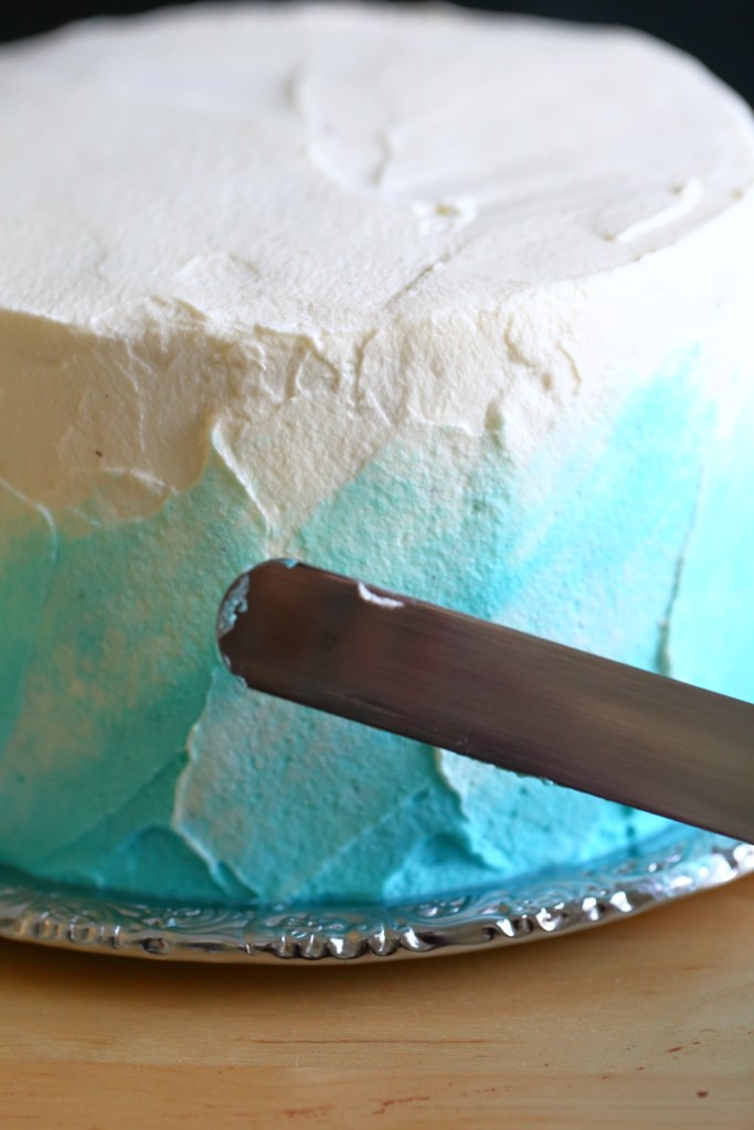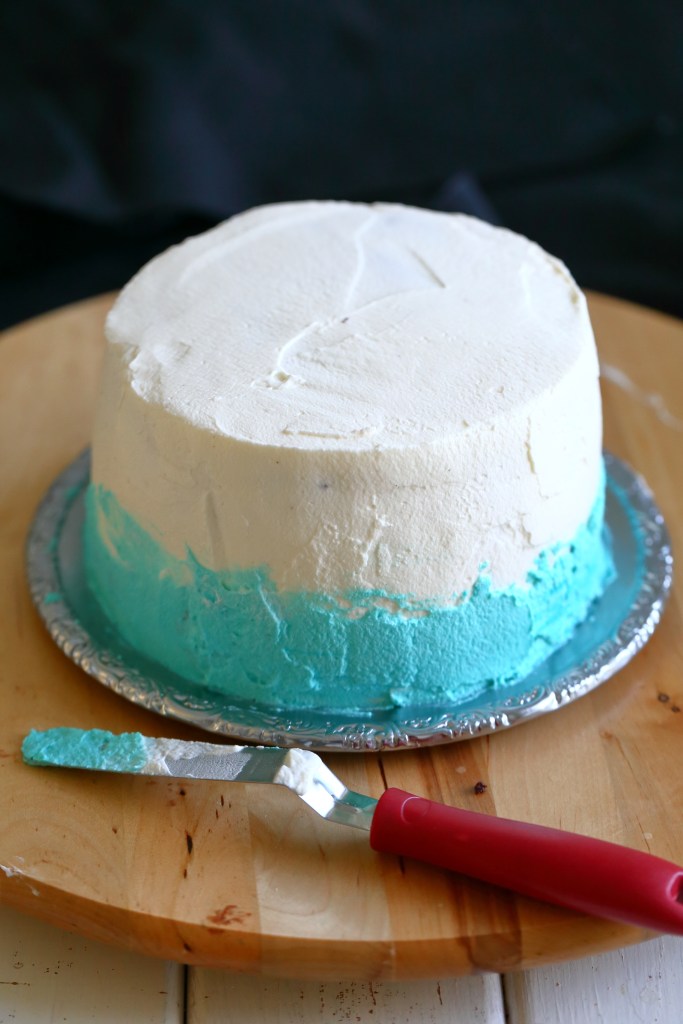 Levitä kakun alaosaan sinistä/turkoosia kermavaahtoa.