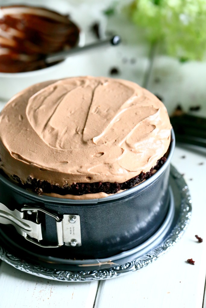 Tee suklaakakkupohja ohjeen mukaan ja paista kahdessa n. 16 cm irtopohjavuoassa. Jäähdytä pohjat kokonaan. Leikkaa kumpikin kakku kahteen osaan.
