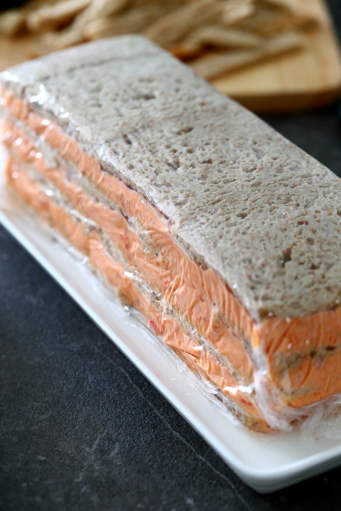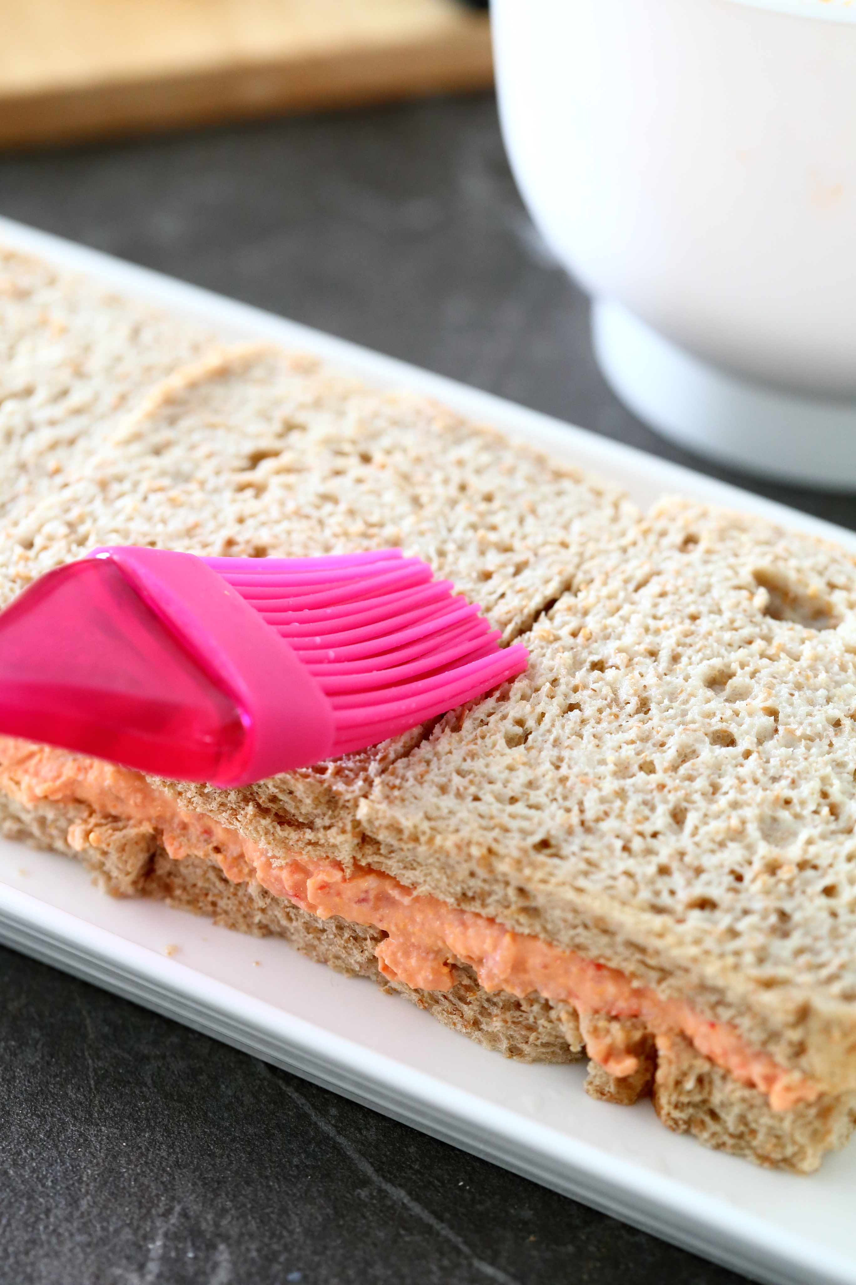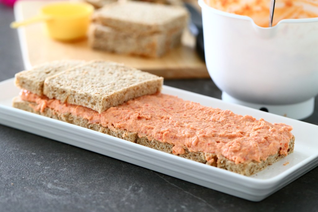 Leikkaa leivistä ohuelti reunat pois. Reunoja ei tarvitse heittää pois vaan voit säästää ne myöhempää käyttöä varten (ks. vinkki alempaa). Laita 3 kokonaista ja puolika leivänpalaa tarjoilulautaselle. Kostuta kevyesti maidolla. Levitä päälle kolmannes täytteestä. Laita päälle uusi leipäkerros niin, että saumat menevät eri kohtiin. Jos siis laitoit ensimmäiseen kerrokseen ensimmäiseksi kokonaisen leivän ja viimeiseksi puolikkaan leivän, laita nyt ensimmäiseksi puolikas ja viimeiseksi kokonainen leivänsiivu.
