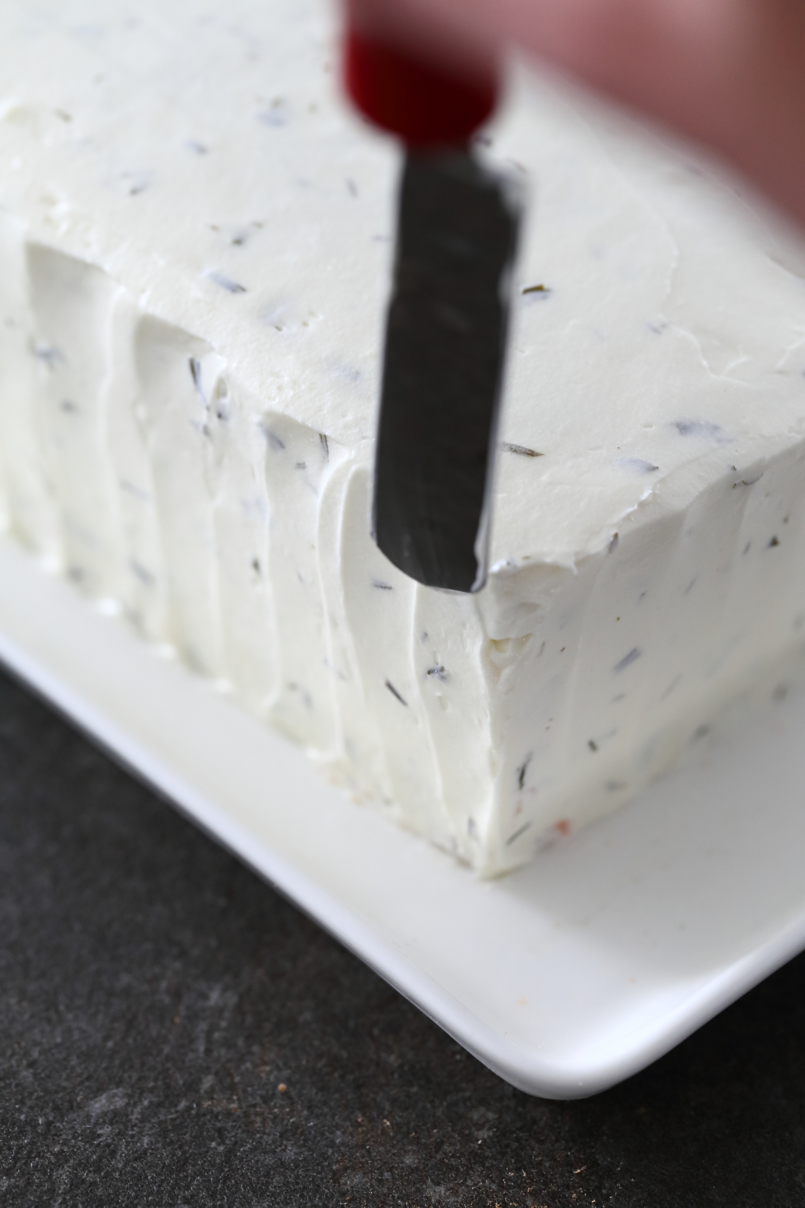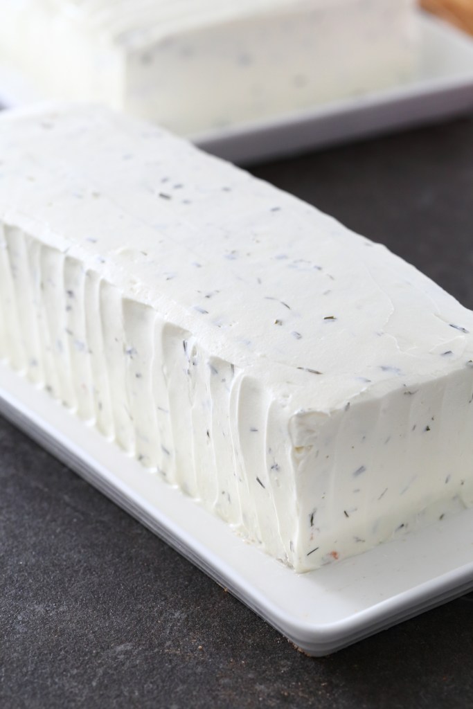 Poista kelmut. Leikkaa reunoja tarvittaessa hieman suoremmiksi. Vatkaa kuorrutteen kerma vaahdoksi. Vatkaa joukkoon myös notkistettu tuorejuusto. Levitä kerma-tuorejuustoseos kakun päälle ja reunoille. Koristele halutessasi kakun reunat vetämällä niihin pystysuoria viivoja esim. pienellä palettiveitsellä tai leveäkärkisen veitsen kärjellä.