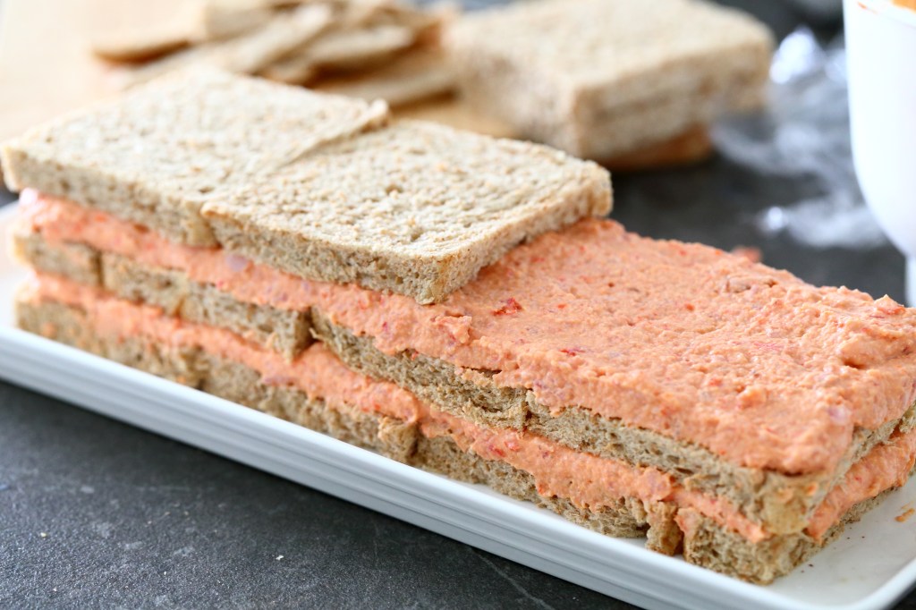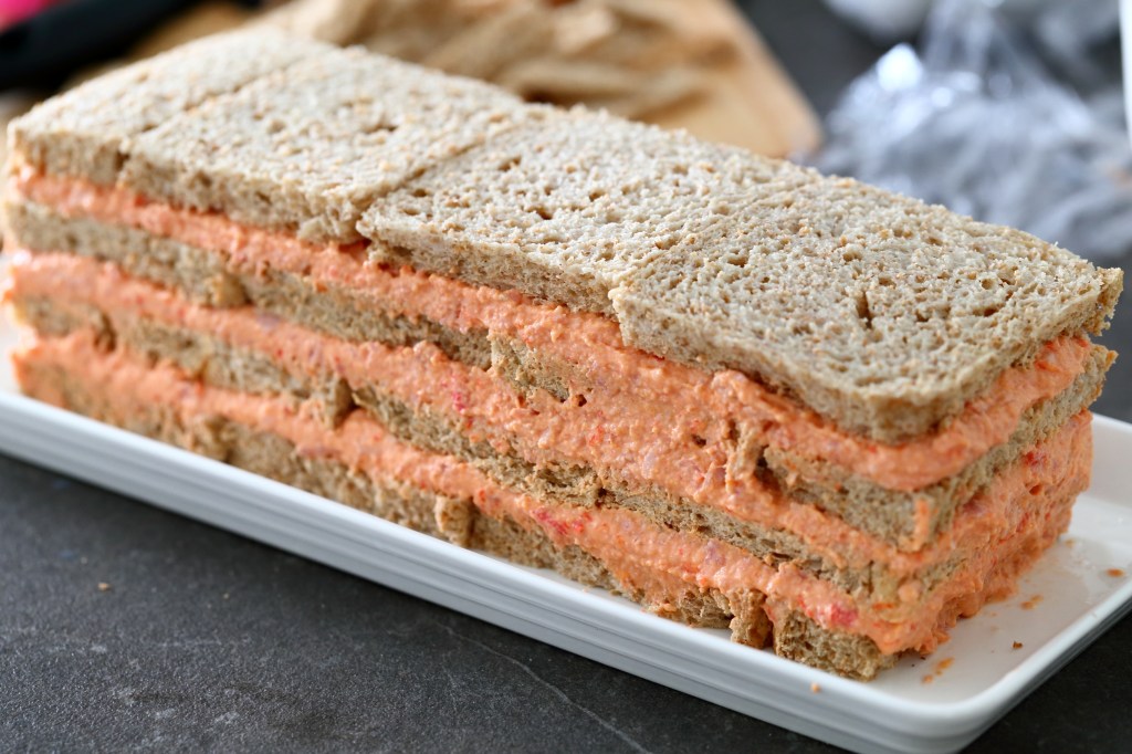 Laita uusi leipäkerros taas niin, että saumakohta jää kokonaisen leivän alle. Jos saumat ovat aina samassa kohdassa, voi valmis voileipäkakku sortua.