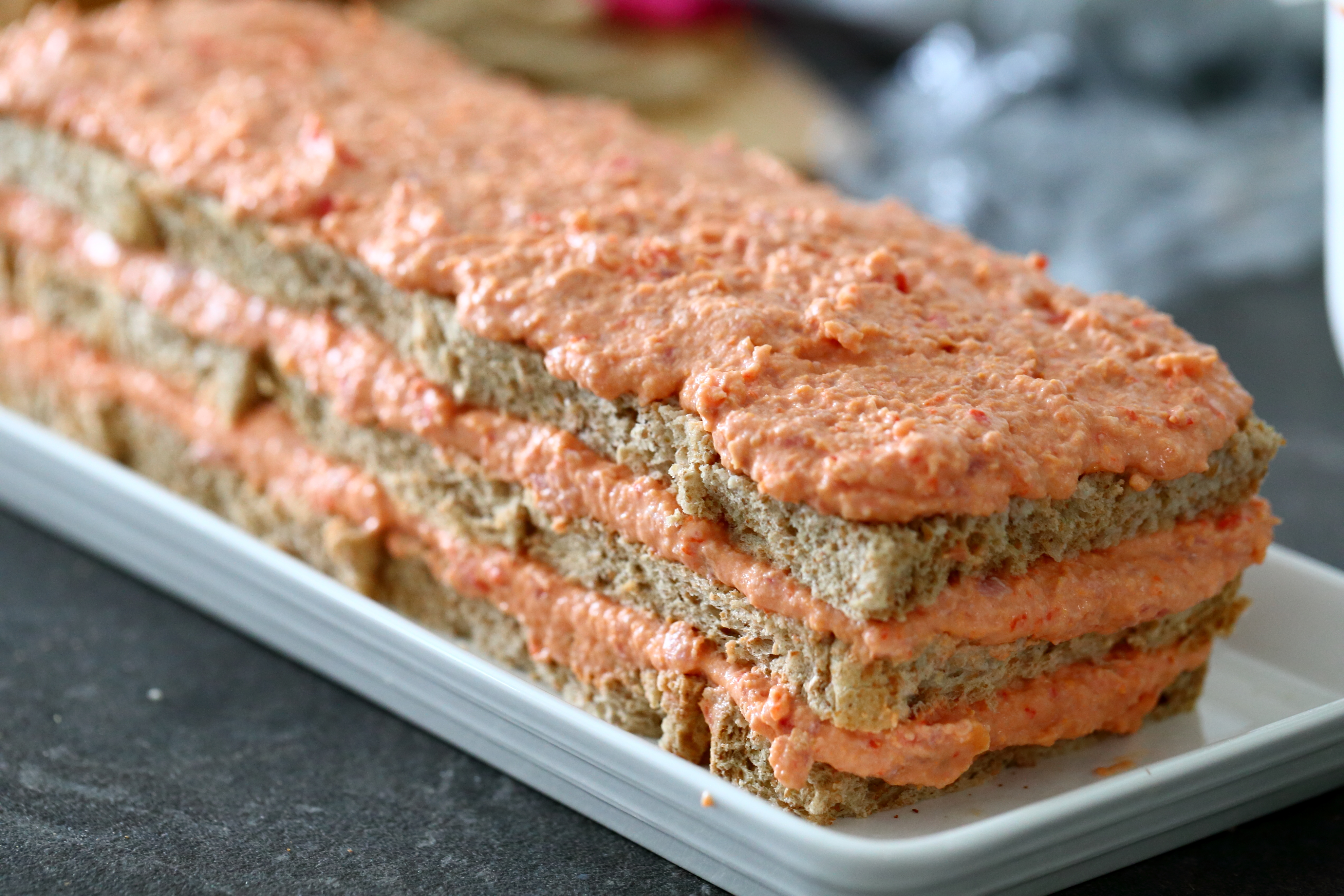 Kakku kannattaa täyttää vähintään vuorokausi ennen tarjoamista, jotta maut ehtivät tasoittua ja kakku mehevöityä. Tee ensin täyte. Hurauta kinkku ja meetvursti hienoksi soseeksi esim. tehosekoittimessa tai vaikka sauvasekoittimella. Jos ne eivät millään meinaa soseutua, laita joukkoon tuorejuusto ja hurauta nyt uudestaan. Lisää myös ranskankerma ja hurauta vielä kunnolla sekaisin. Itse soseutin joukkoon myös paprikan. Paprika maistuu täytteessä todella voimakkaasti, jos se soseutetaan. Ja haluat vähemmän paprikaisen lopputuloksen, leikkaa paprika käsin pieniksi paloiksi ja sekoita lopuksi joukkoon. Maista täytettä ja lisää makusi mukaan mausteita esim. pippuria.