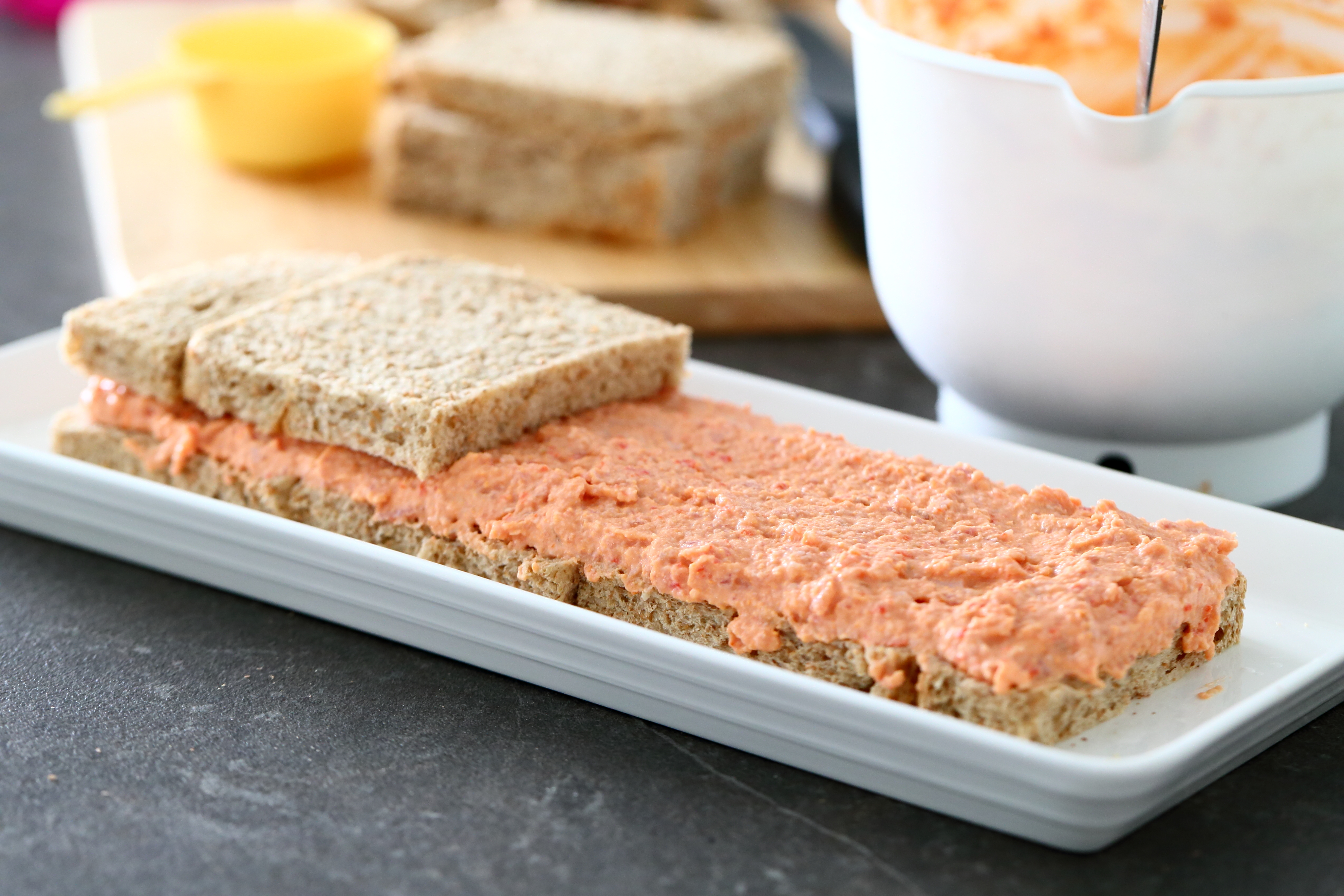 Tällaisia täytteitä tehdessä kannattaa täyte maistella aina omaan makuun sopivaksi. Tässä maistuu melko voimakkaasti meetvursti.. Ja myös se paprika, mikäli sen soseuttaa joukkoon.. Meetvurstin ja kinkun suhdetta voikin muutella oman maun mukaiseksi. Myös tuorejuustoilla saa erilaista makua täytteisiin, joten jos pidät enemmän esim. ruohosipulin makuisesta tuorejuustosta kuin paprika-chilin makuisesta, käytä sitä rohkeasti. Voit myös tehdä pari päivää ennen virallisen kakun tekemistä pienen testiannoksen täytettä ja maistella sen iltapalaksi leipien päällä. Näin pääset jyvälle sen makumaailmasta ja ehdit vielä muokkaamaan sitä.