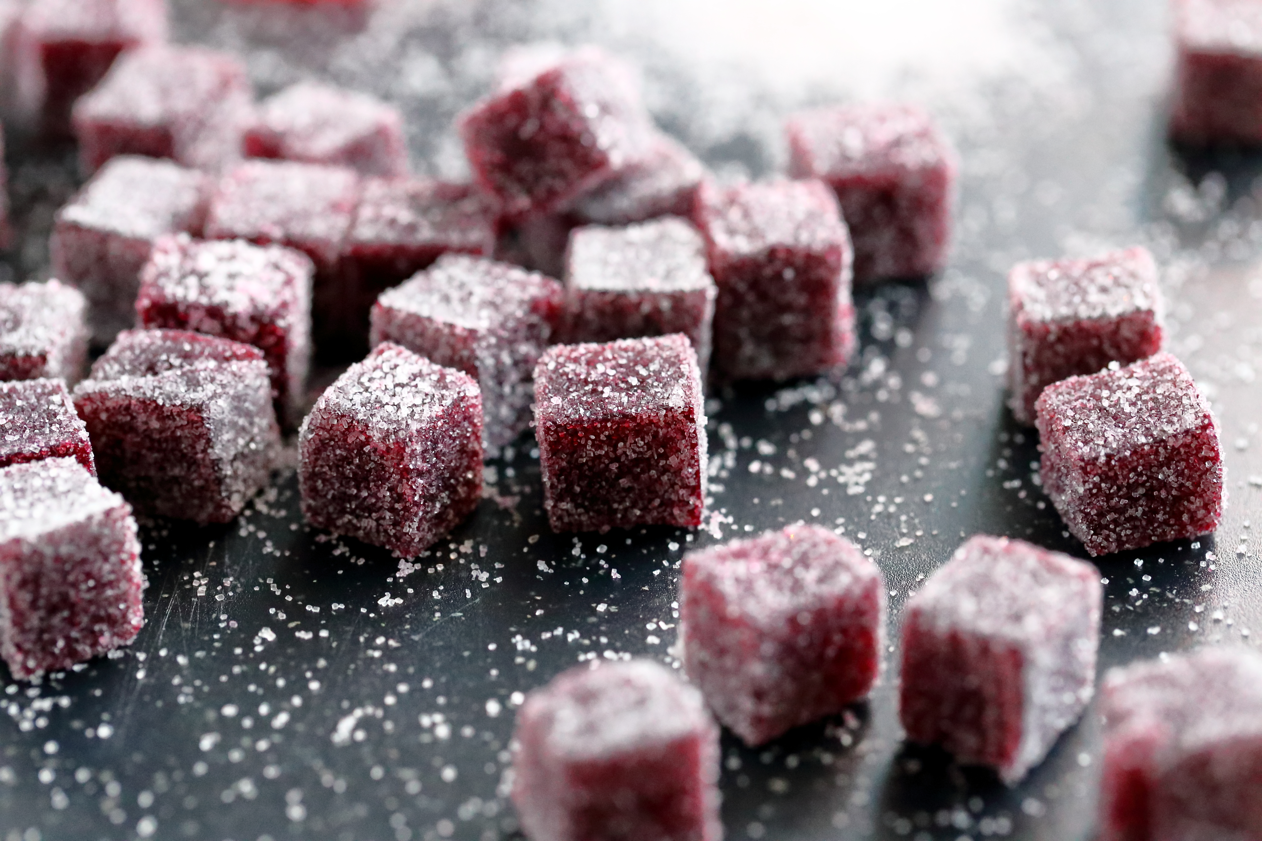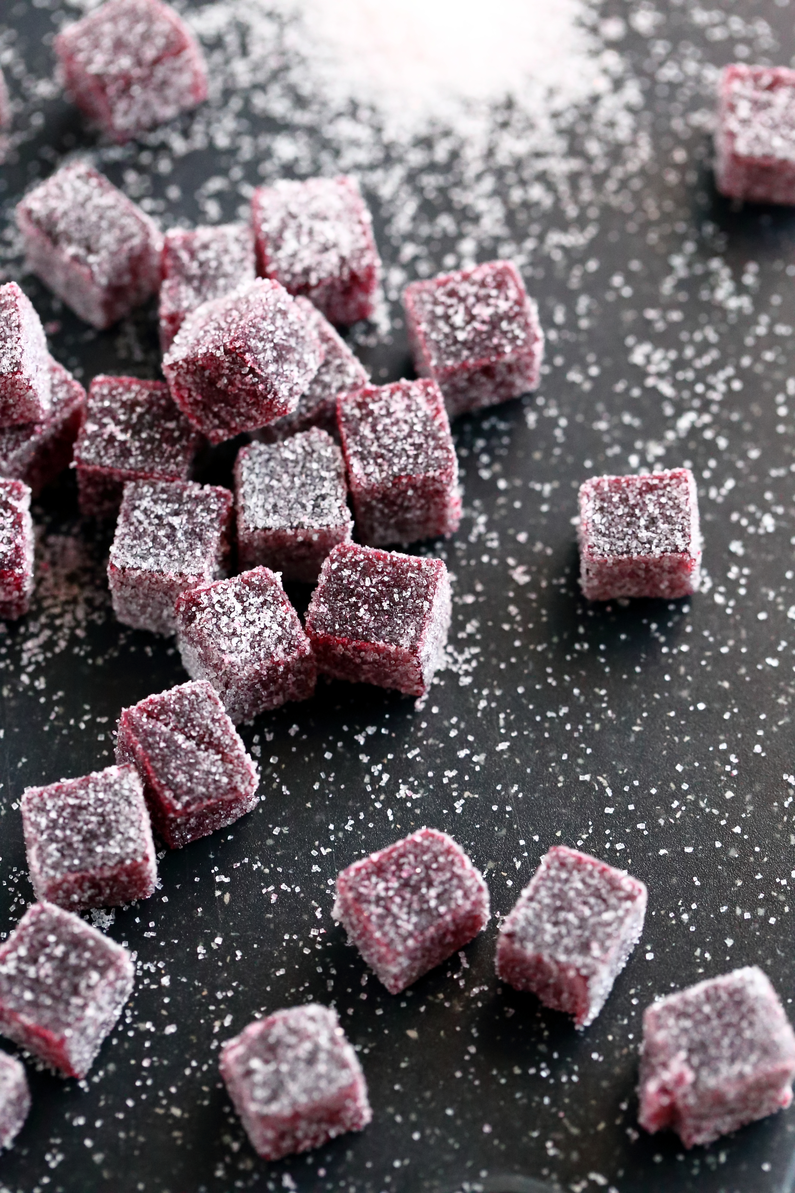 Marmeladit saattavat olla heti tuoreeltaan maisteltuna kumimaisia ja lohkeavia. Ainakin, jos käyttää agar agaria reippaammmin, kuten itse tein punaherukkaisten kohdalla. Ne eivät siis ole lainkaan marmeladimaisia. Tästä ei kannata huolestua, sillä koostumus paranee seuraavien päivien kuluessa. Marmeladit kannattaakin tehdä valmiiksi jo muutama päivä ennen tarjoamista, jotta ne ovat parhaimmillaan syömishetkellä. Vähemmällä agar agar -määrällä (kuten nämä mustaherukkaiset herkkupalat) saattavat olla hyvinkin pehmeitä, mutta kosteutensa ja pehmeytensä vuoksi ne vaativat pidemmän kuivumisajan kuin kovemmat kaverinsa. Molemmat on siis hyvä tehdä ajoissa, jotta ehtivät tekeytyä kunnon makeiksi suupaloiksi. Eli nyt on sopiva hetki tehdä marmeladit jouluksi. Tässä ohjeet, olkaa hyvät 🙂