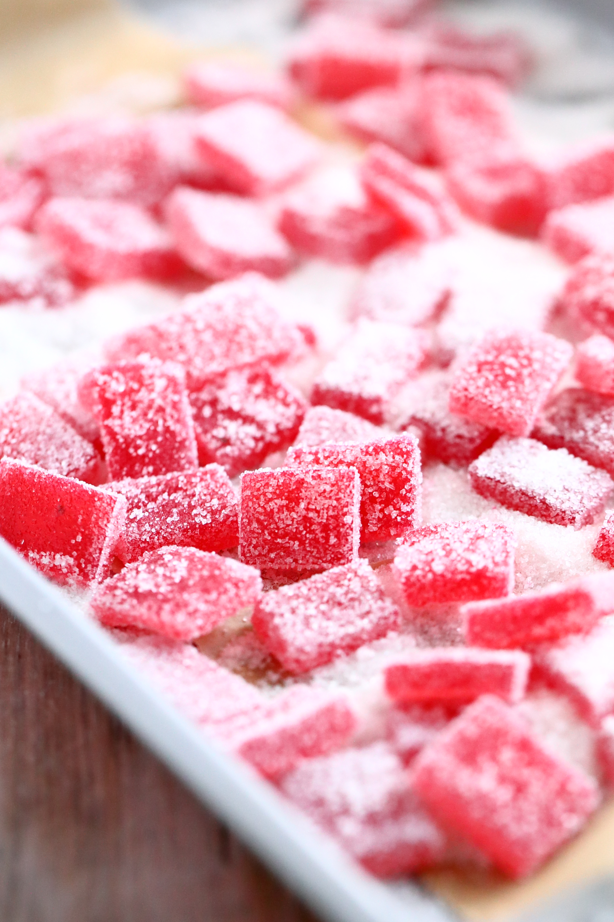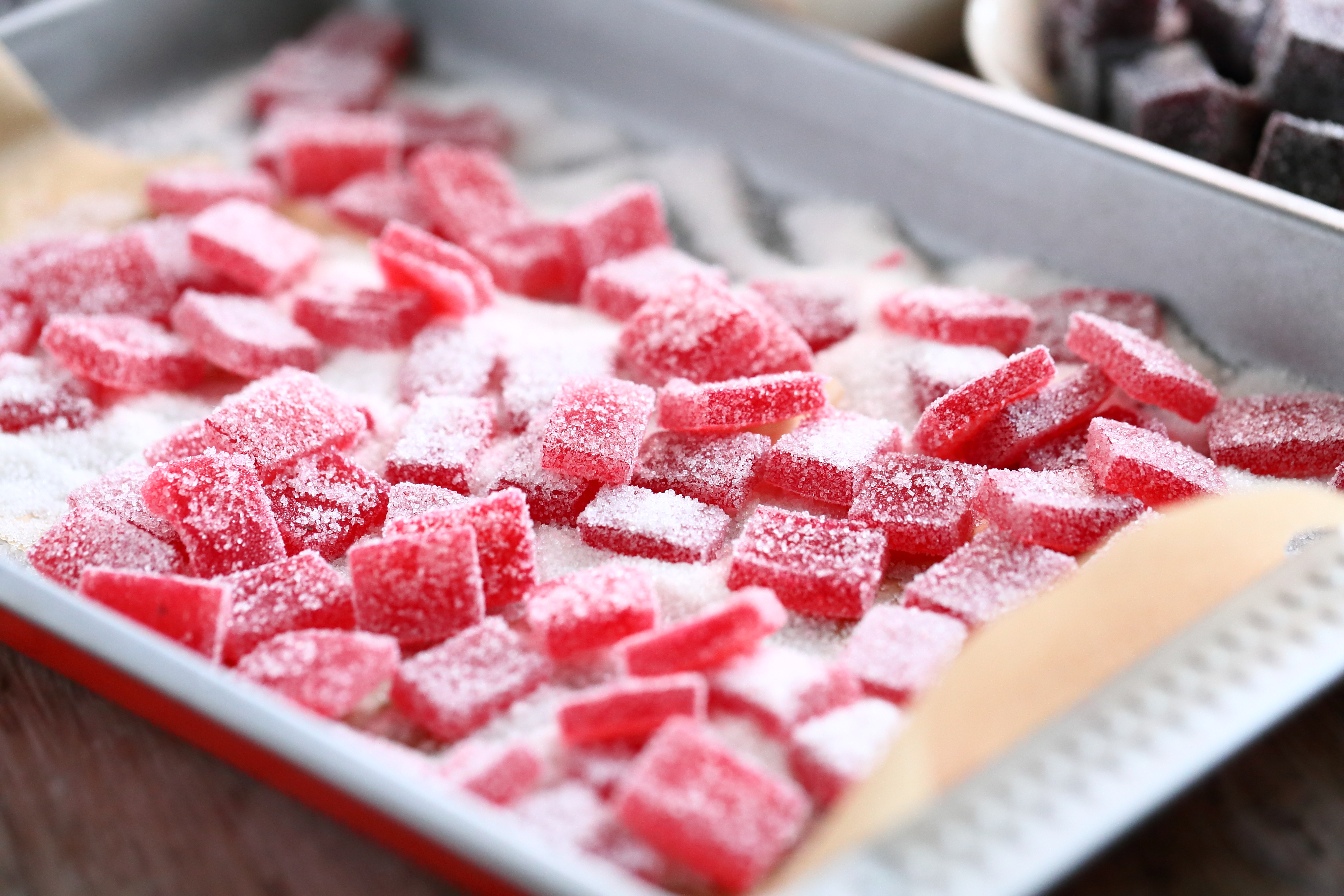 Kuivata paloja välillä käännellen n. 1-2 vuorokautta. Kun pinta on kuiva (saattaa olla aavistuksen tahmainen), sokeroi palat. Itse pidin sokeroidut palat vielä seuraavan vuorokauden sekaisin sokerin seassa. Tein näin ihan vain varmistaakseni, etteivät palat vahingossakaan ota toisiinsa kiinni, jos marmeladin pinnalla oleva sokeri alkaa sulaa pois. Niin ei käynytkään kuin ihan vain parin marmeladin kohdalla. Sokeri siis suli niiden pinnalle, mutta ne olivatkin hieman kosteampia kuin muut palat.