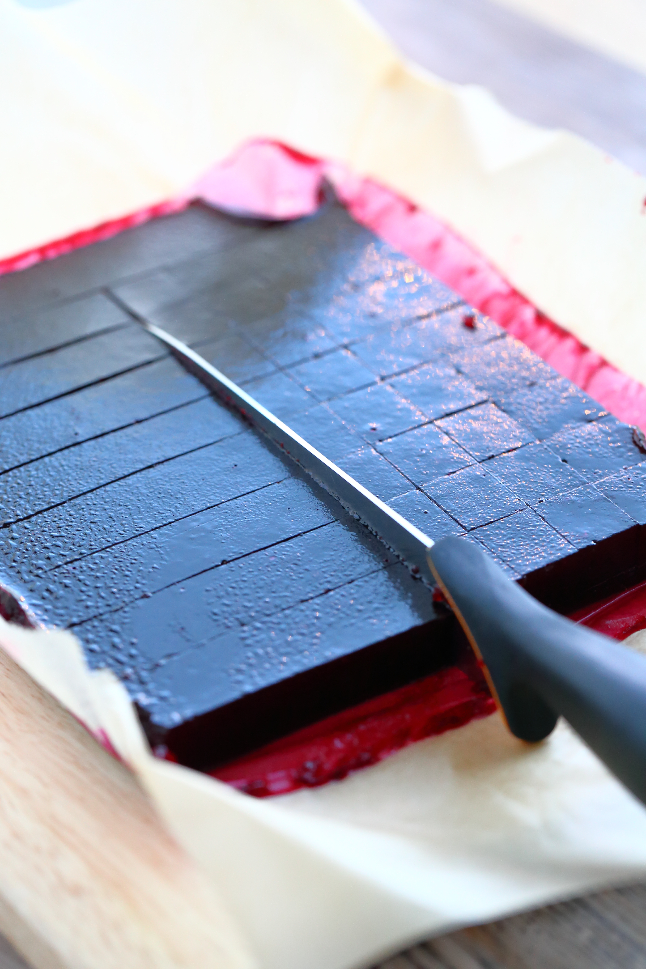 Vuoraa pieni uunivuoka leivinpaperilla ja kaada mustaherukkaseos siihen. Anna marmeladin jähmettyä huoneenlämmössä muutama tunti tai n. 1 vuorokausi. Leikkaa sopivan kokoisiksi paloiksi.