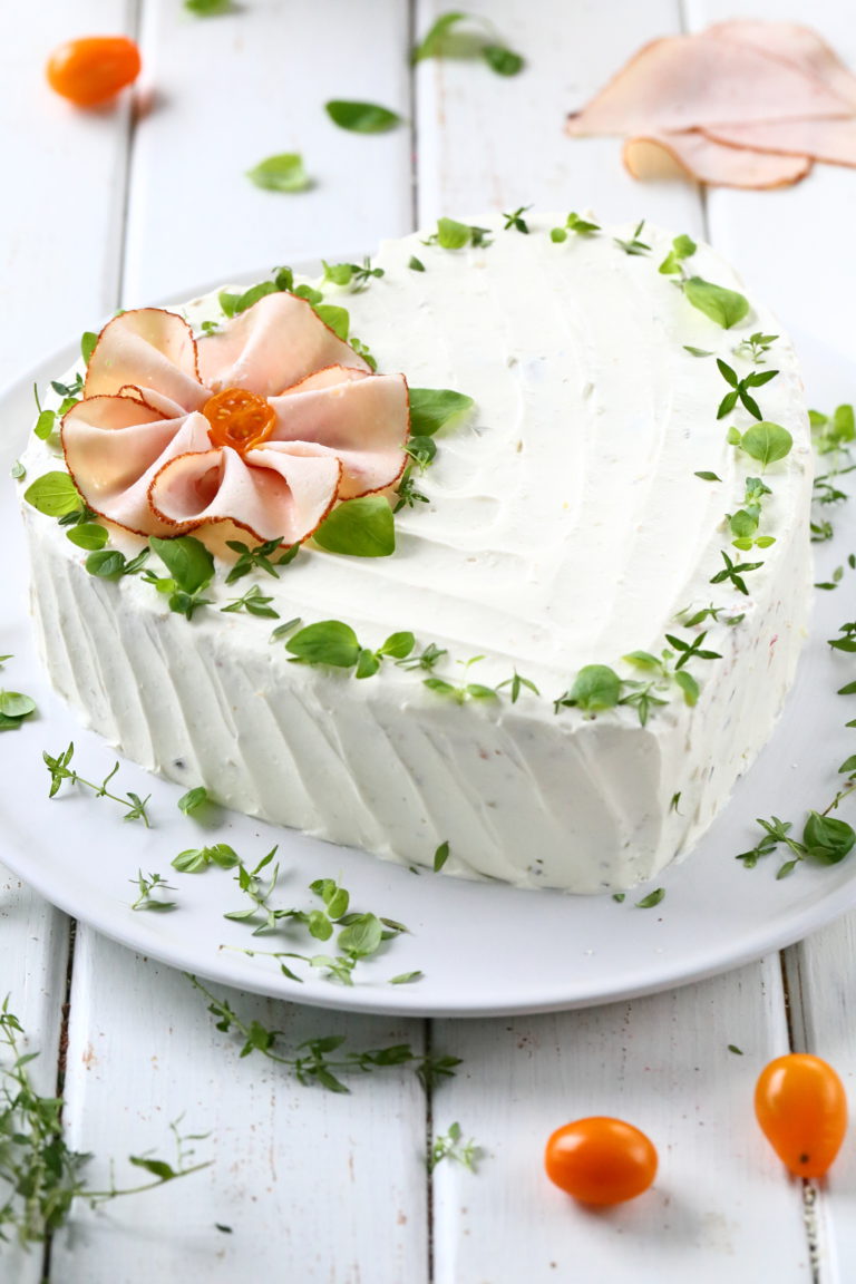 Lohivoileipäkakku, jossa koristeena kaunis sipulista tehty kukka (sipulista tehty kukka koristaa suolaisen kakun):