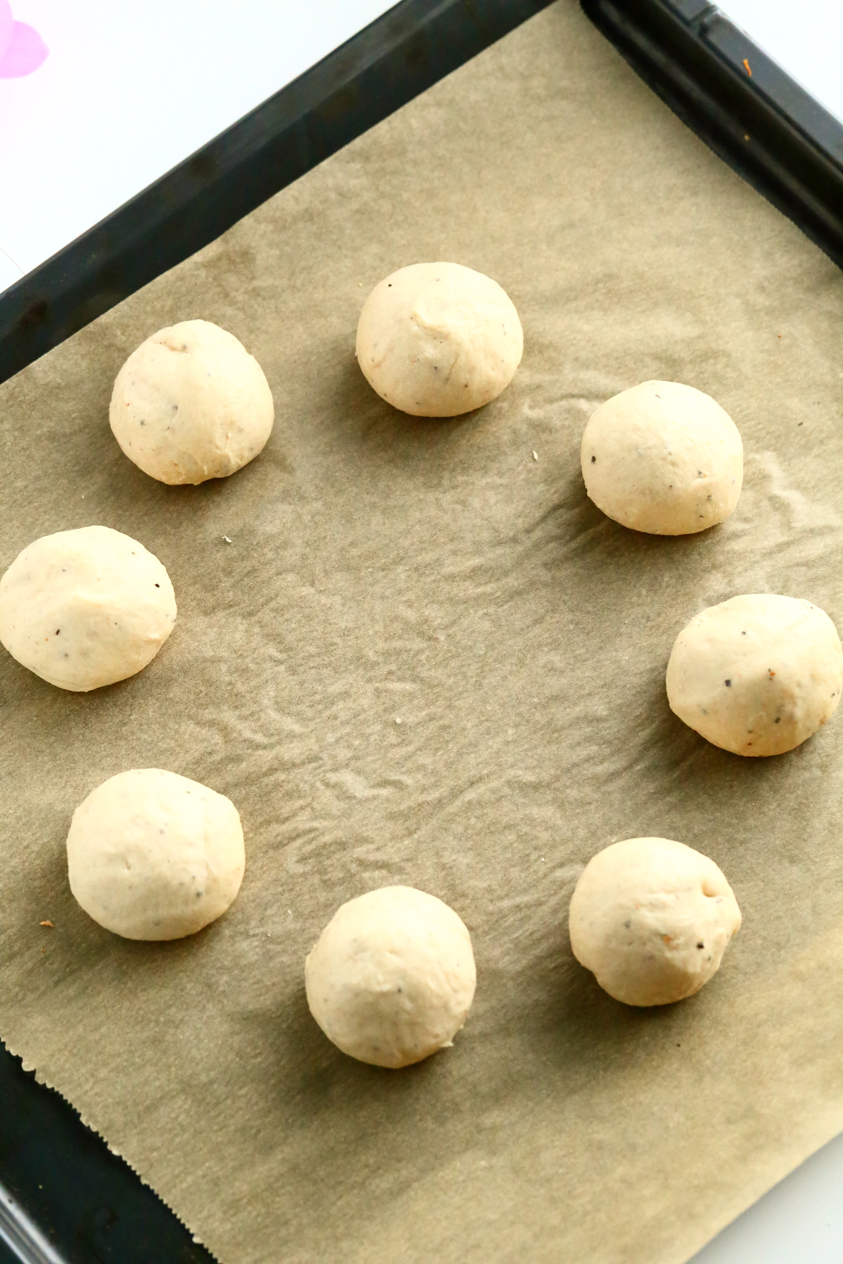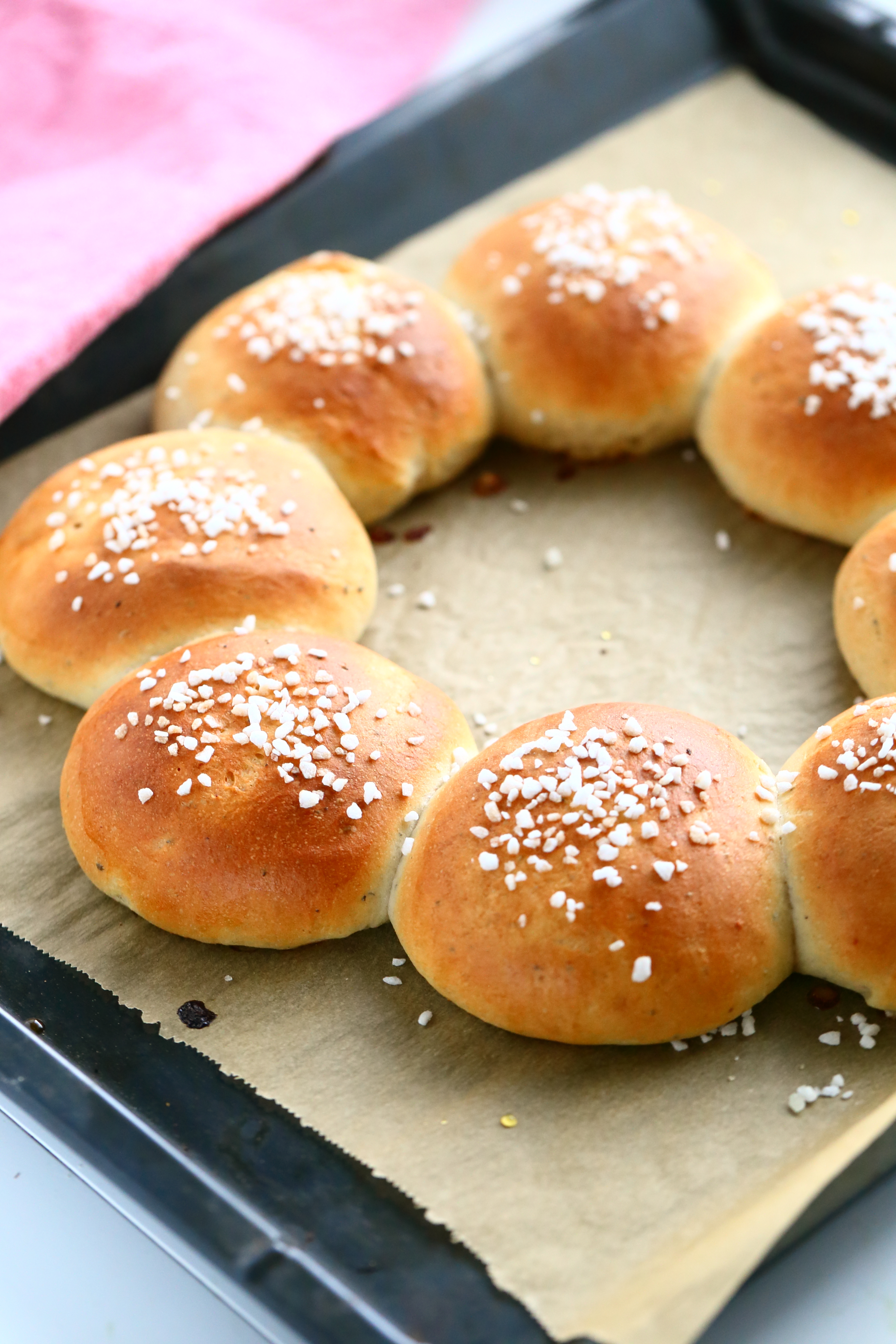 Seuraavana päivänä: Jaa taikina kahteen osaan. Laita toinen taikinanpala takaisin jääkaappiin kelmun ja leivinliinan alle odottamaan vuoroaan. Jaa pöydälle jäänyt taikinan 12 yhtä suureen osaan. Pyörittele kukin osa palloksi. Asettele 6-8 palaa (riippuen kuinka ison kranssin haluat tehdä) leivinpaperoidun pellin päälle ympyrän muotoon. Jätä pallojen väliin nousemisvaraa reilusti, mutta vain sen verran, että pallot kuitenkin ottavat toisiinsa kiinni viimeistään uunissa kypsyessään.