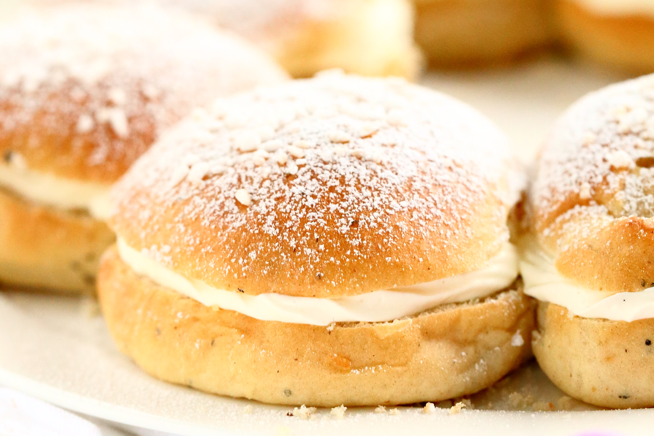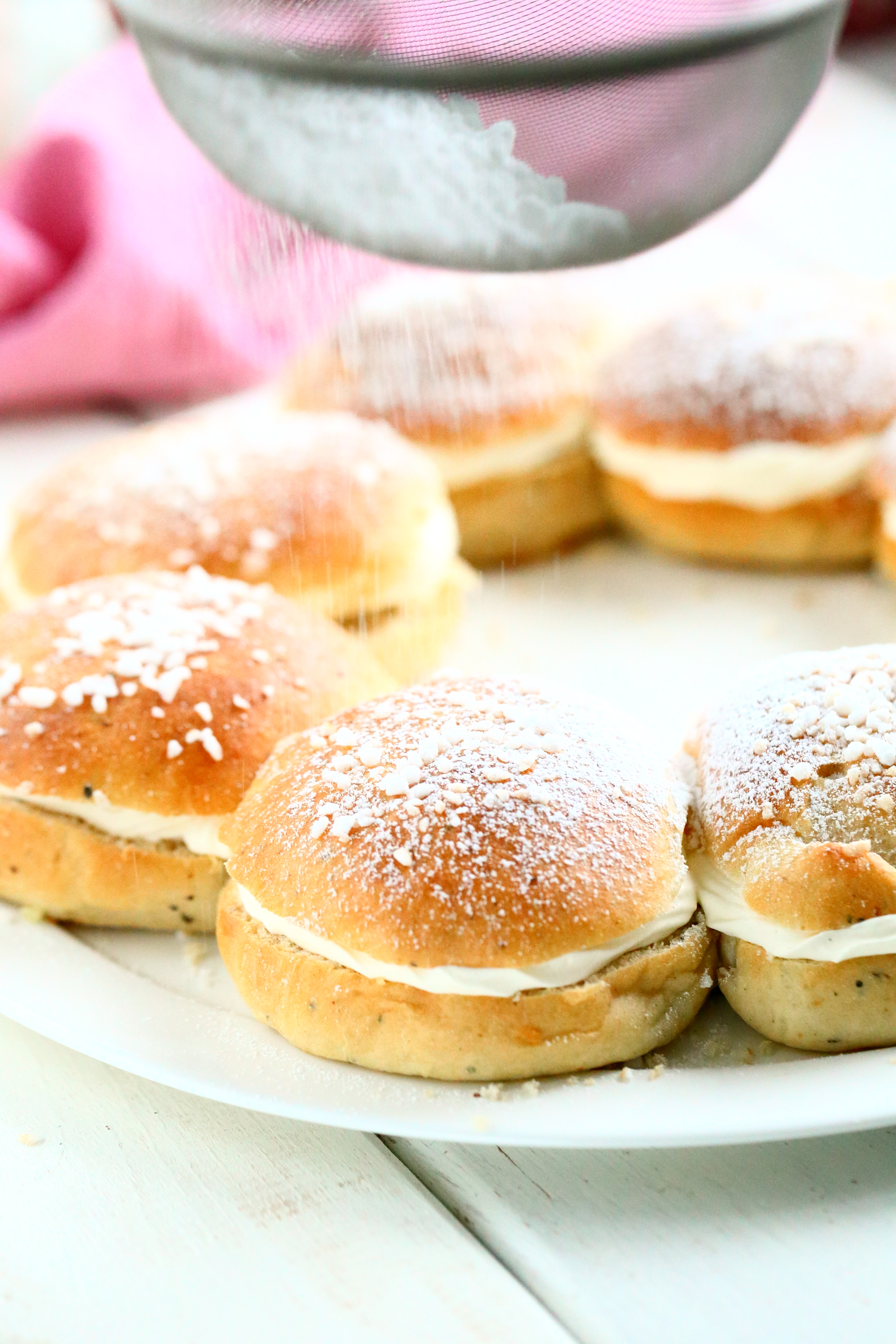 Levitä kermavaahtorinkulan keskelle oman makusi mukaan hilloa, mantelimassaa tai vaikka Nutellaa. Nosta hatut takaisin pullien päälle. Koristele vielä tomusokerilla ja eikun kimppuun!