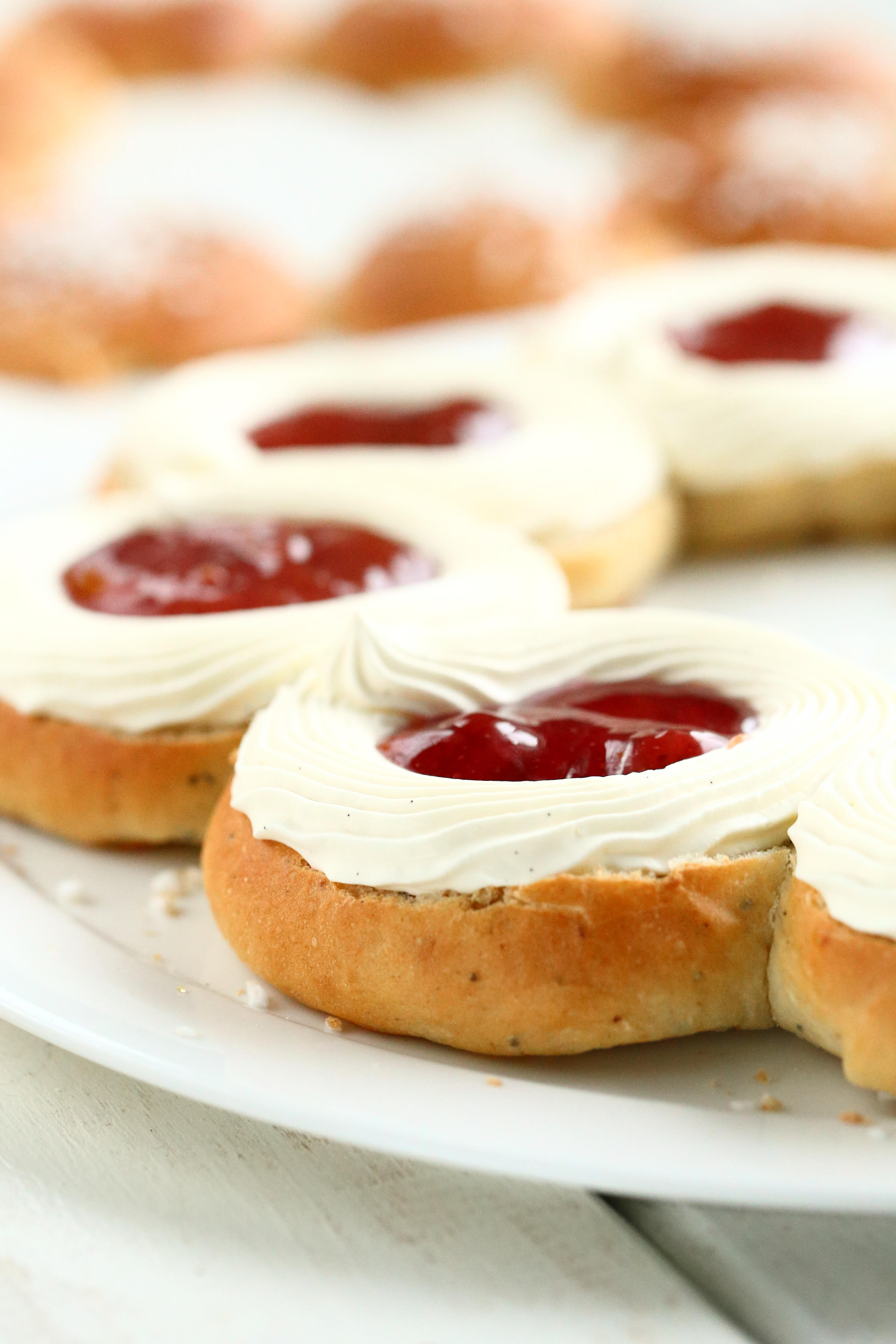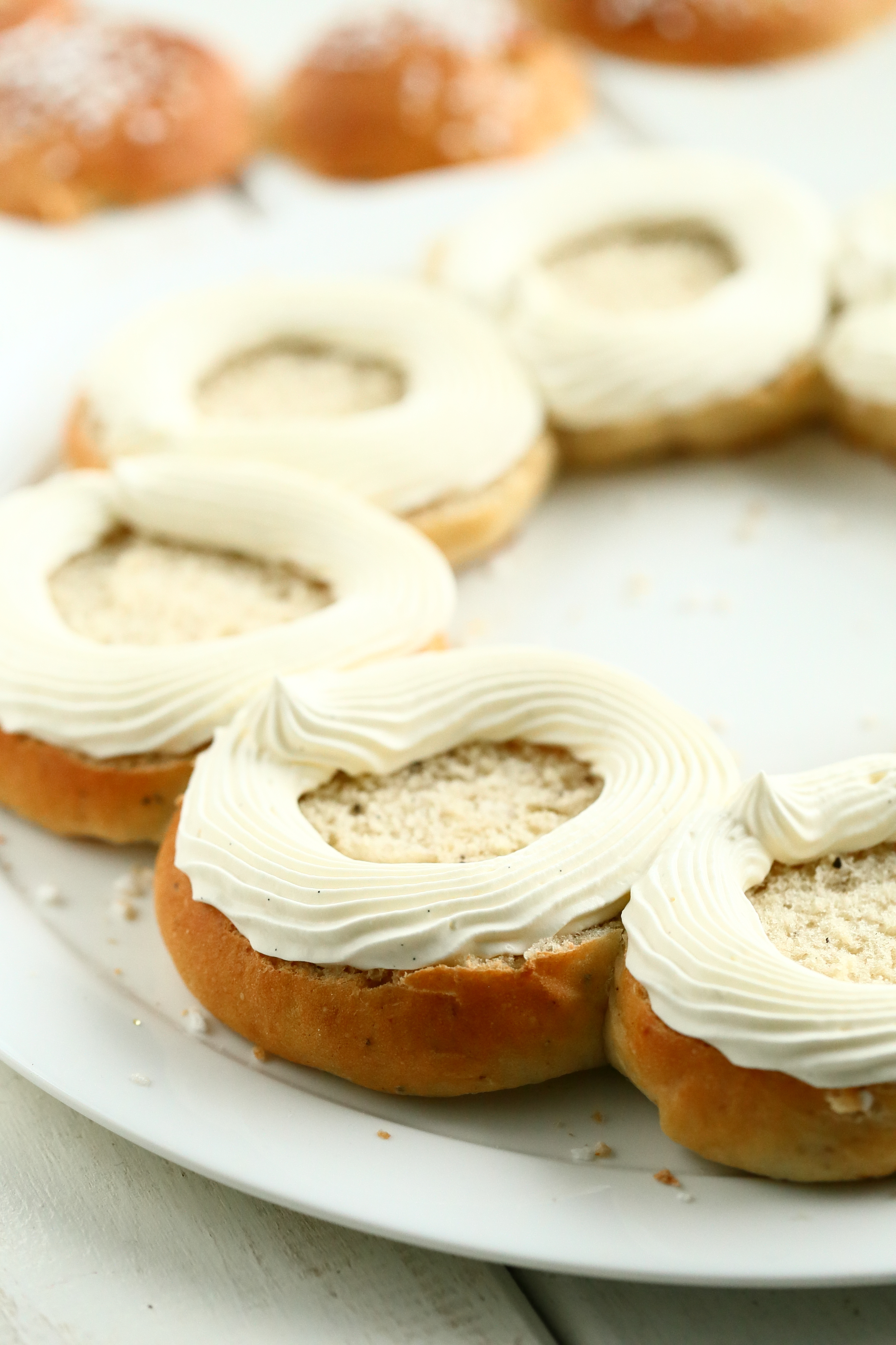 Vatkaa vispikerma vaahdoksi ja mausta vaniljasokerilla. Leikkaa jäähtyneen pullakranssin päältä ”hatut” pois. Pursottele kermavaahto pullarinkuloiden reunoille.