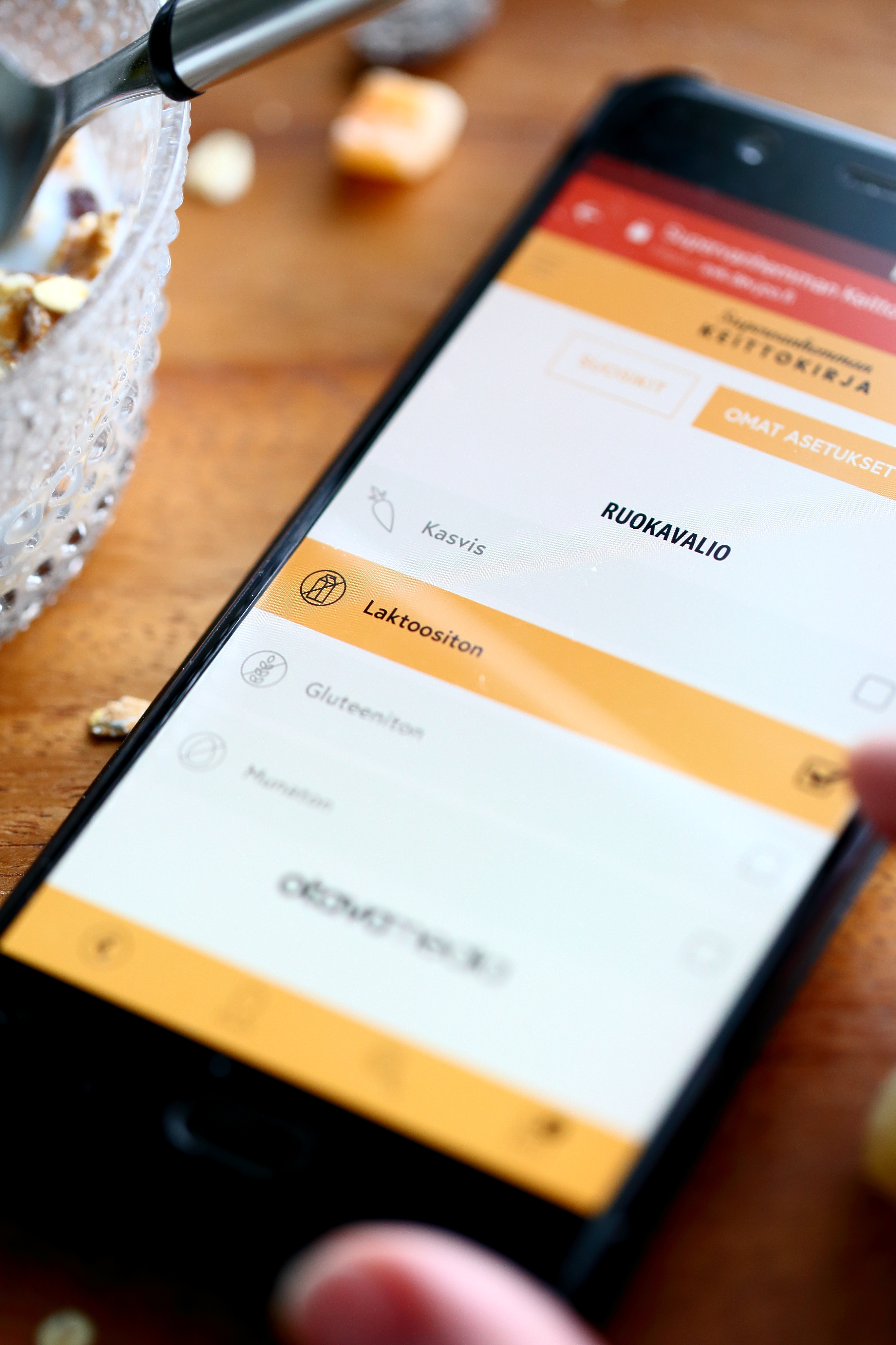 Omat asetukset -valikon alta löytyy myös mahdollisuus kertoa omat ruokavalioon liittyvät rajoitukset. Mein perheessä on tarvetta laktoosittomalle ja joskus myös munattomalle ruokavaliolle ja molemmat vaihtoehdot saakin ruksittua siitä vain helposti. Näissä kolmessa suosikkiohjeessani en kuitenkaan huomioi kumpaakaan ruokavaliota, sillä haluan käyttää kaikki mahdolliset reseptit hyödykseni. Kaikista suosikkiohjeistani saa kuitenkin helposti muovattua laktoosittomia.