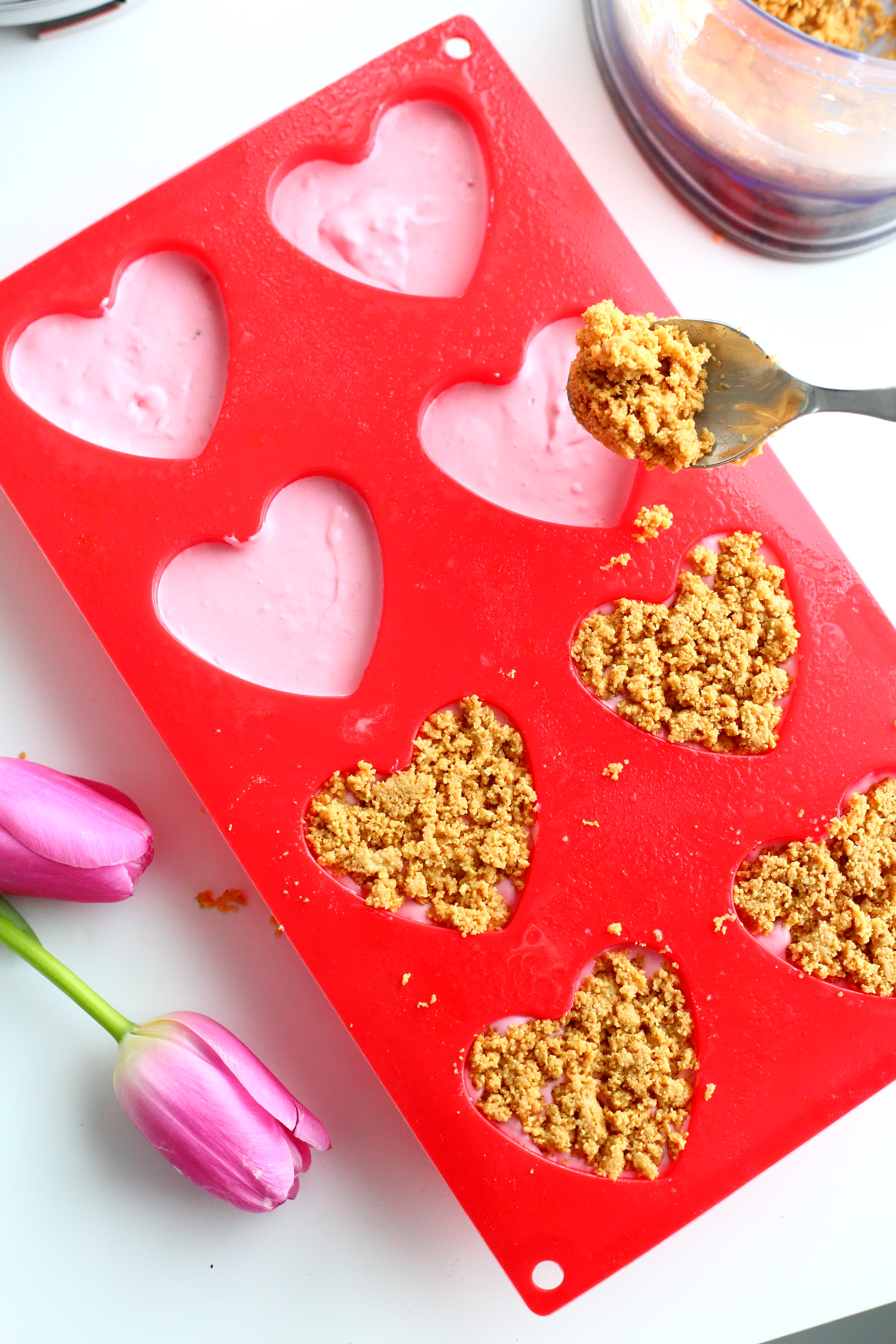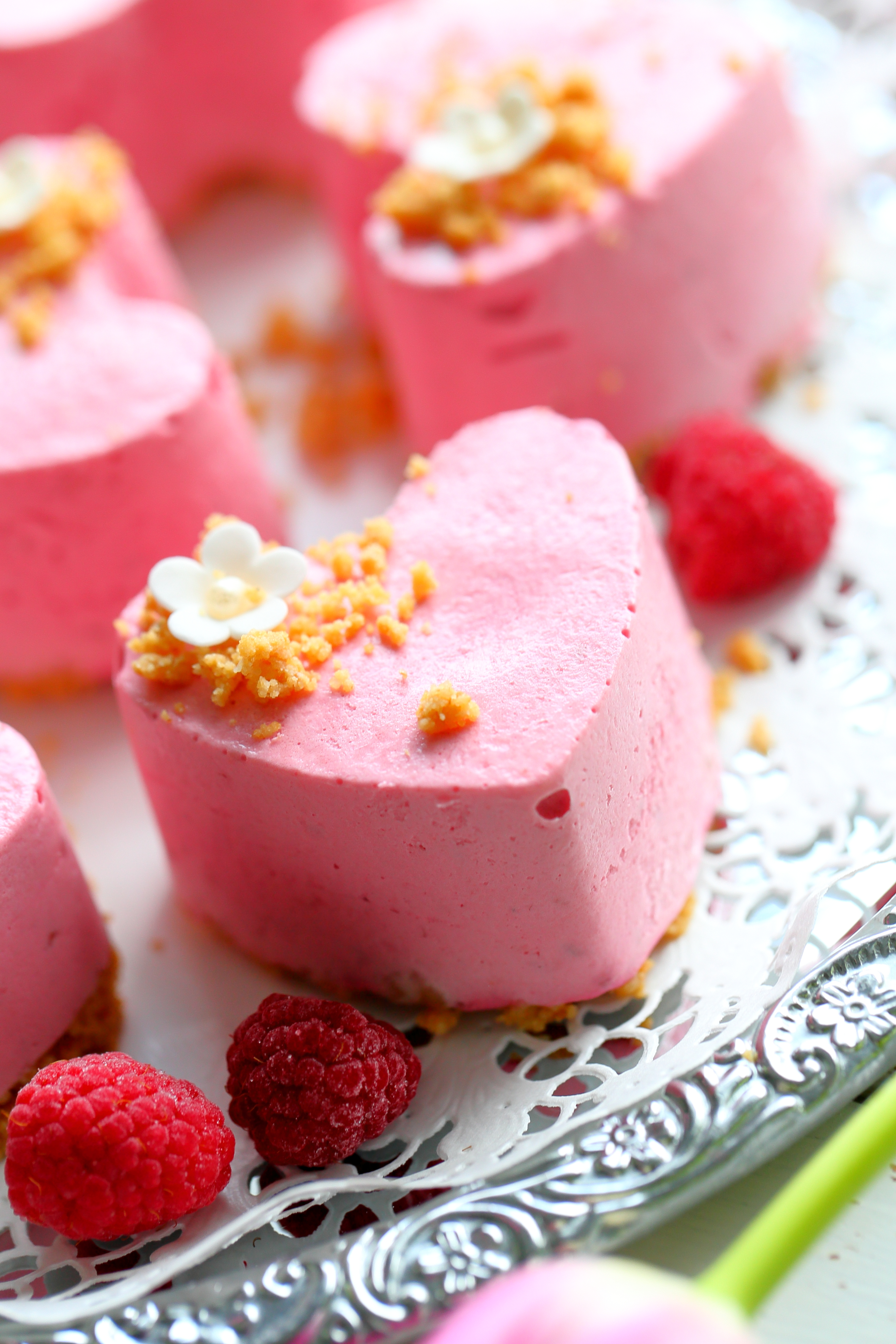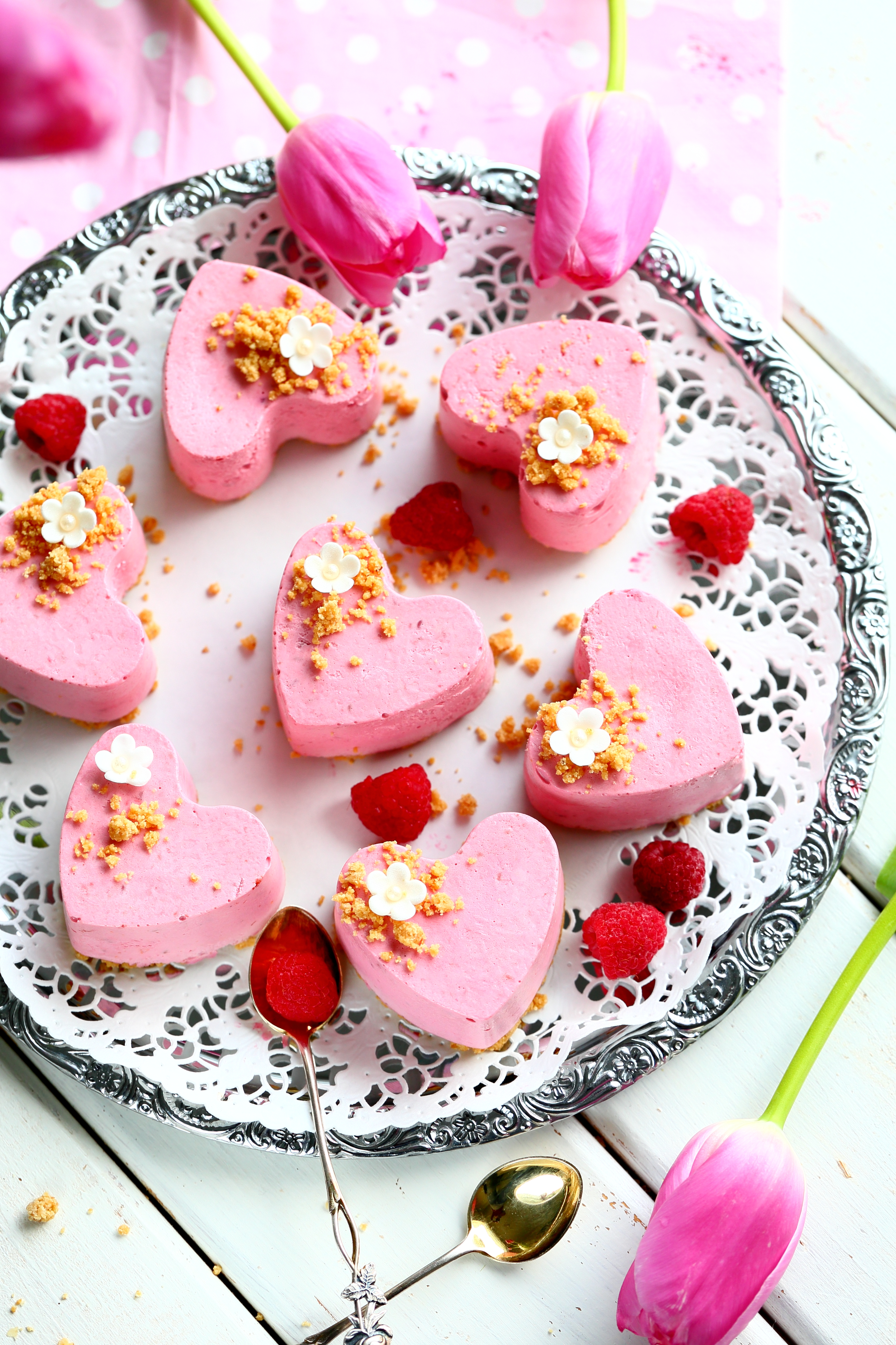 Mein ystävänpäivä meni tänä vuonna sairastellessa ja samalla myös ystävänpäivän leipomiset jäivät väliin. Onneksi ystävänpäiväleivonnaisia voi leivoskella myös muulloin, sillä virallisen ystävänpäivän lisäksi ystävänpäivää voi viettää vaikka joka päivä ❤ Teinkin heti sairasteluiden jälkeen tällaisia pieniä vadelmamousseleivoksia, jotka kokosin suoraan silikonisiin sydämen mallisiin muffinssivuokiin. Nuo vuoat ovat käytössä tosi harvoin, mutta sopivat ystävänpäivään tai ystävälle tarjottavaan leivonnaiseen paremmin kuin hyvin. Olen tehnyt niissä mm. näitä donitsin makuisia muffinssejakin. No mutta eipä tuosta vuoasta tällä kertaa sen enempää. Mutta nuo vadelmaleivokset. Kyllä olivat hyviä. Kuohkeita ja vadelmaisia. Leivosten pohjana oli valkosuklaasta ja keksimuruista tehty rapea seos, joka sopii tosi kivasti yhteen hippasen raikkaamman vadelmamoussen kanssa.