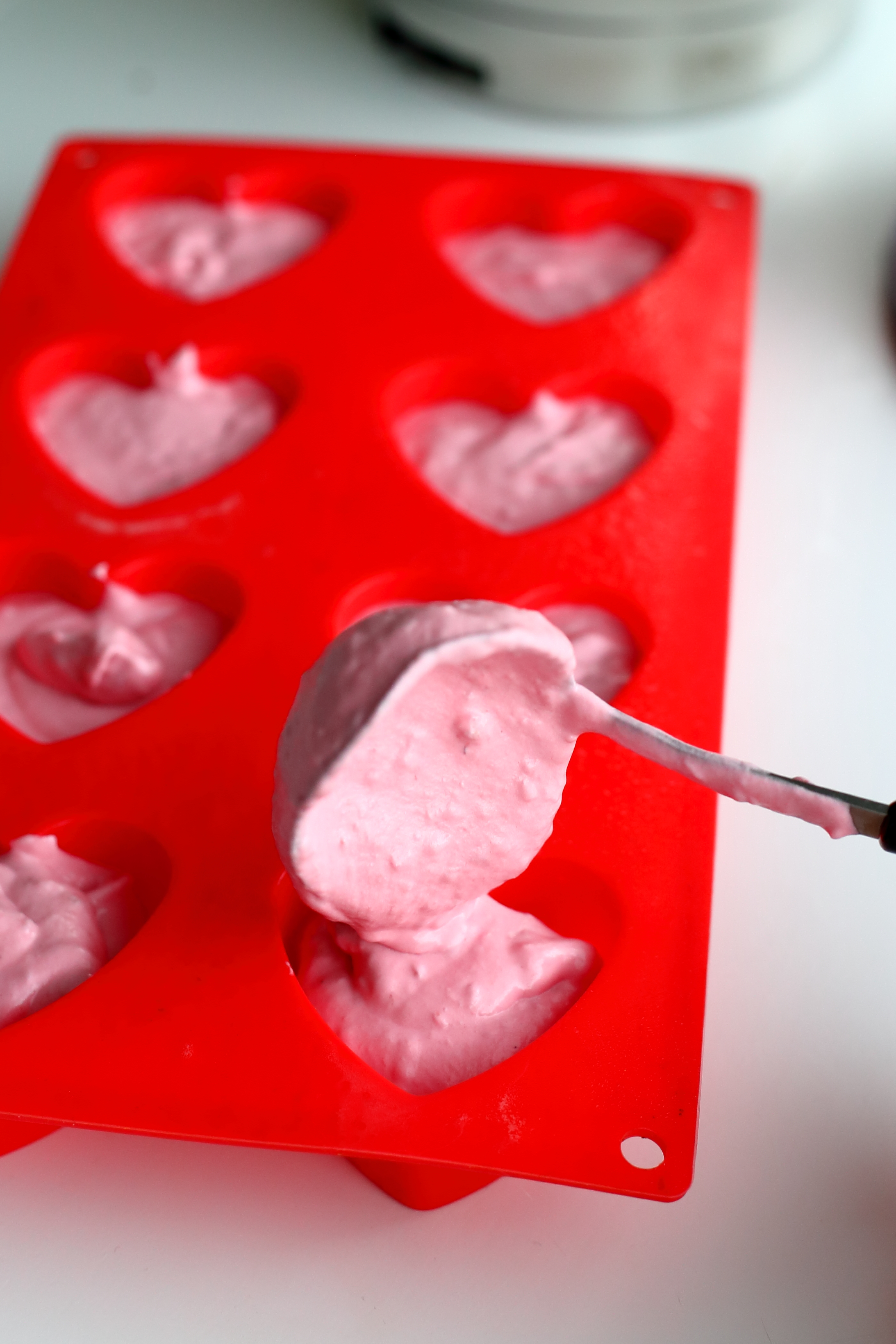 Koska leivoksen vadelmamousse on todella pehmoinen ja kuohkea, onnistuu niiden vuoasta poistaminen näppärästi, kun leivokset käyttää pakkasessa. Kun leivos on jäätynyt miltei kokonaan, se on helppo plumpsauttaa pois vuoasta. Leivosten tekemiseen kannattaakin ehdottomasti käyttää silikonista vuokaa, jotta poistaminen onnistuu vaivattomasti.