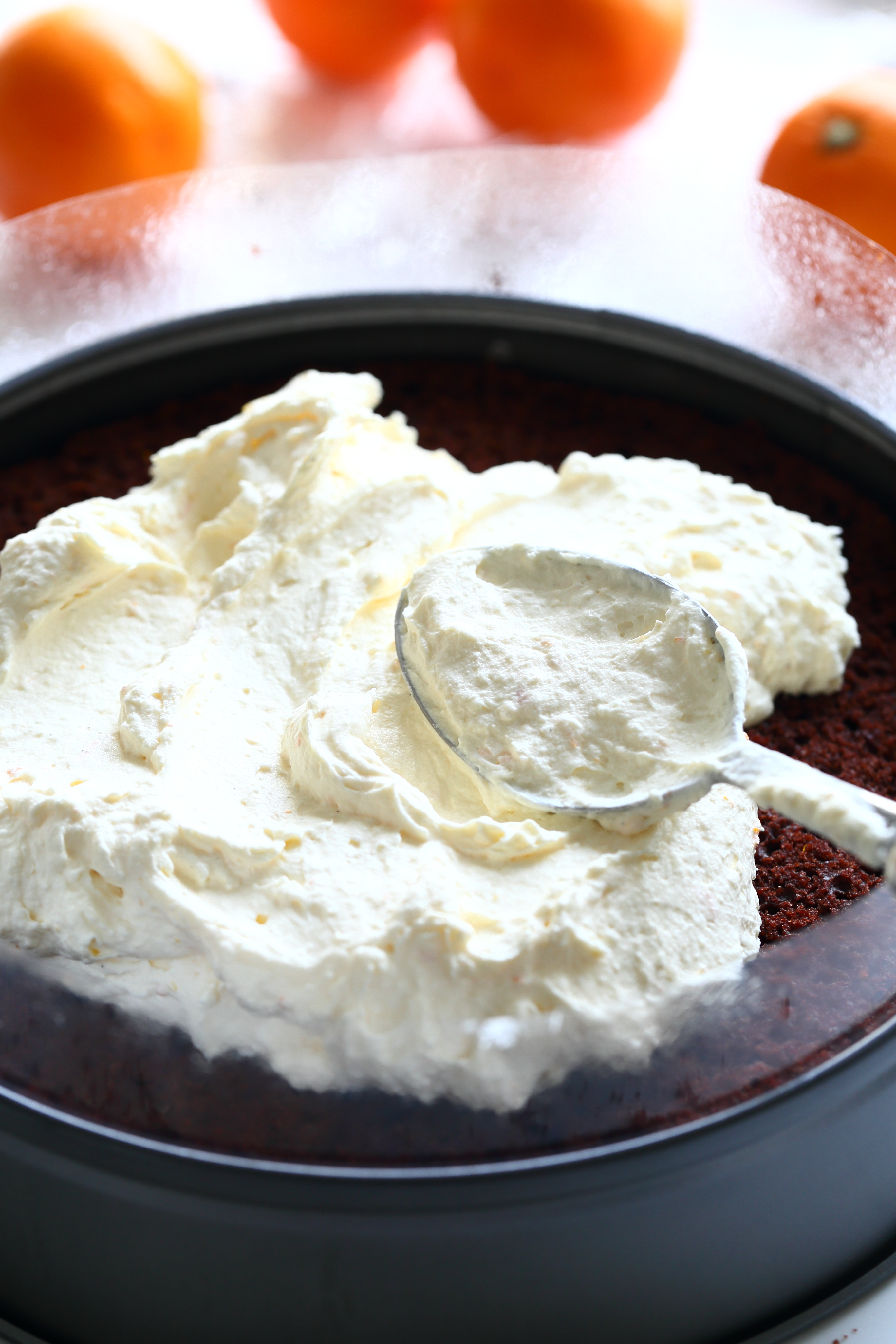 16. Hei! Leivoin mehevän suklaakakkupohjan (joka oli muuten aivan taivaallista ja kypsyi täydellisen tasaisesti…!!!) ja väliin tein tämän appelsiinimoussen. Appelsiinimoussesta tuli jotenkin todella hapanta, epäilen että syy oli mauttoman makuisessa appelsiinissa josta mehut puristin… Yritin korjata tilanteen sokerilla mutta se ei oikein pelastanut tuota hapanta sivumakua. Ehkä seuraavalla kerralla laitan suosiolla valmista tuorepuristettua appelsiinimehua 😀 tai sitten vain vaihdan täytteen johonkin aivan muuhun.
