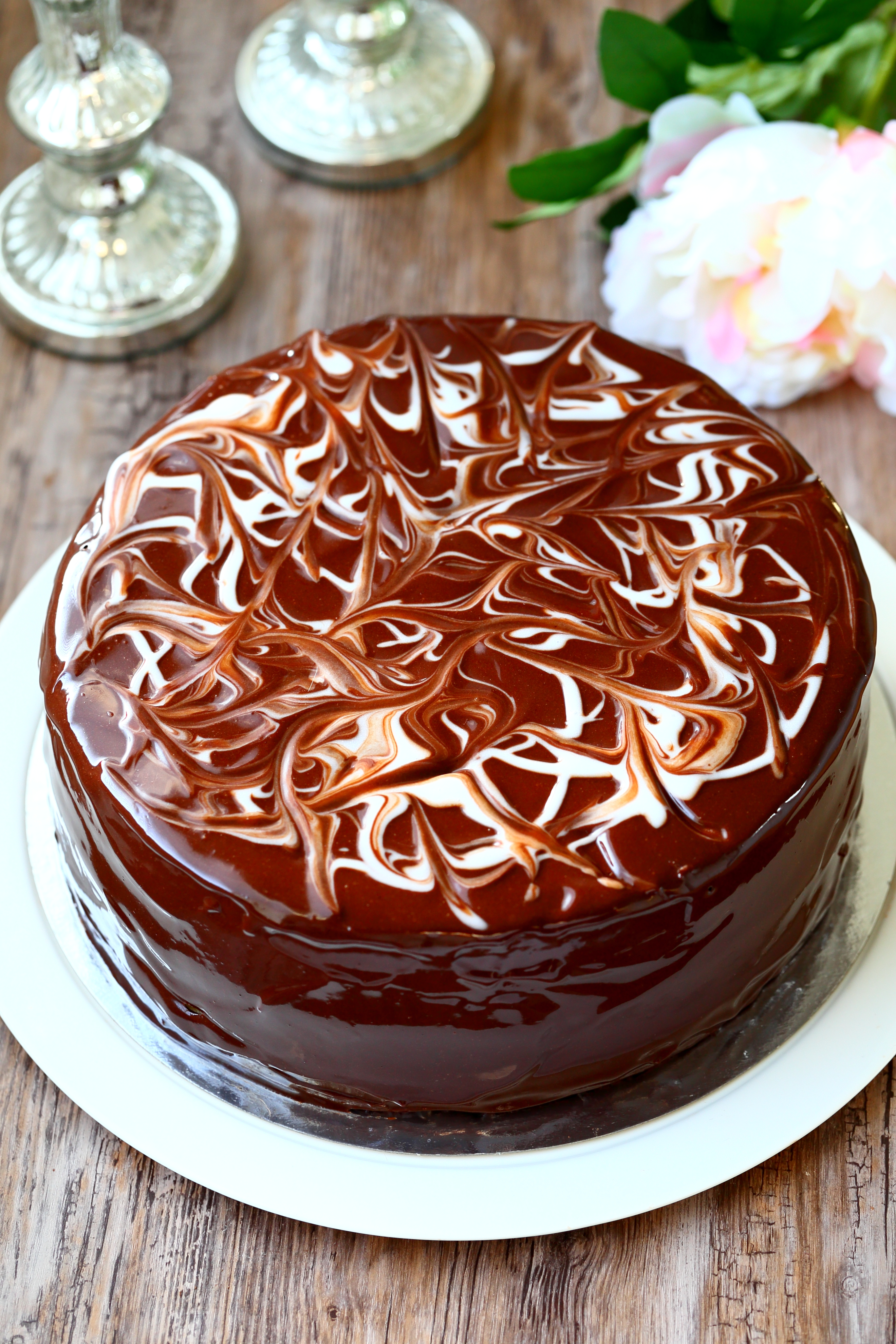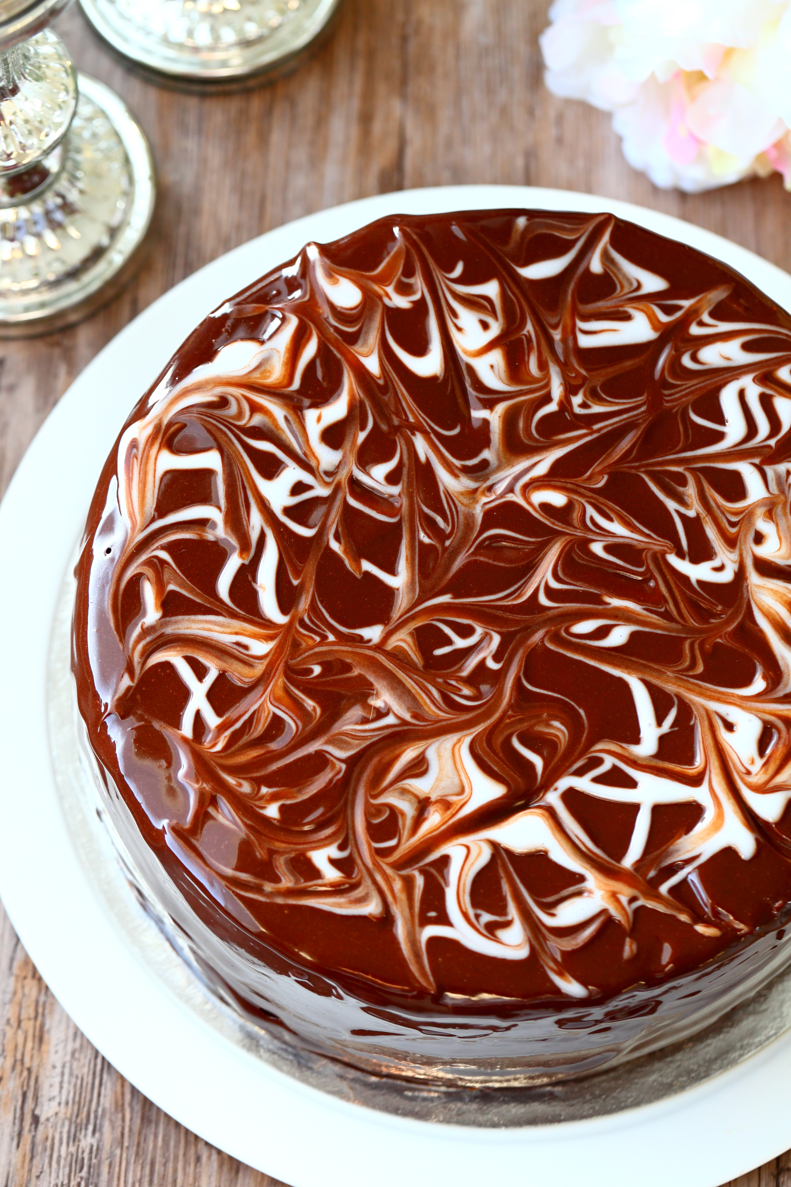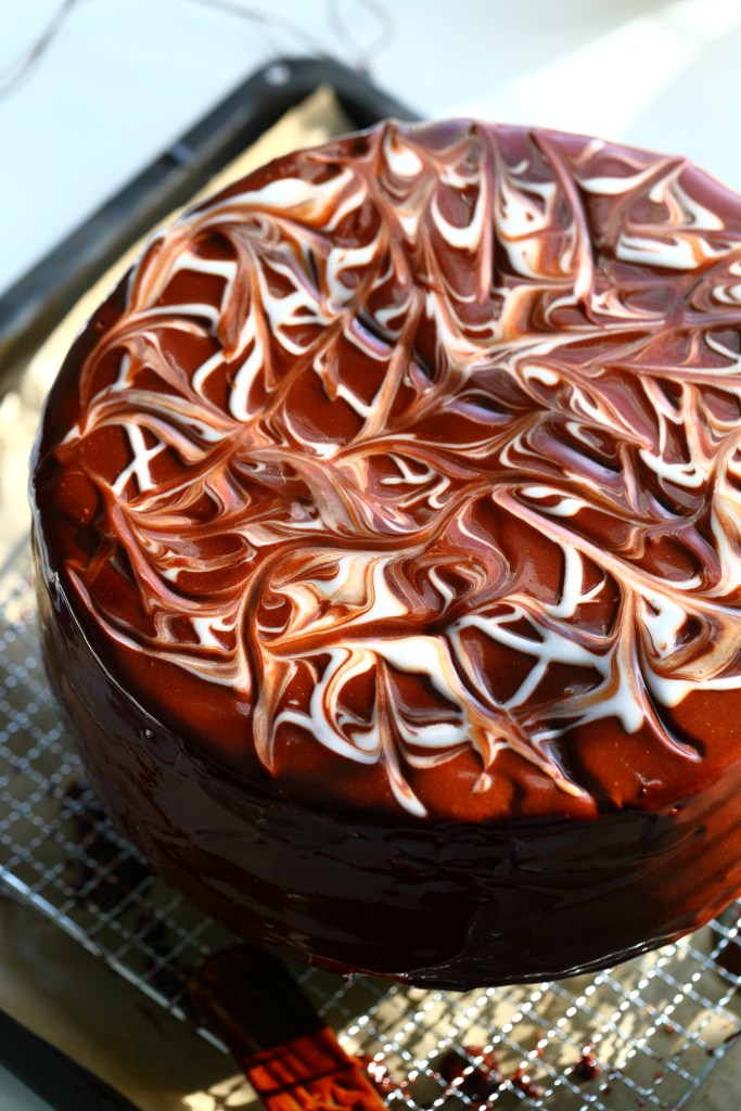 Suklaakakku appelsiinitäytteellä ja marmoroidulla mirror glazella