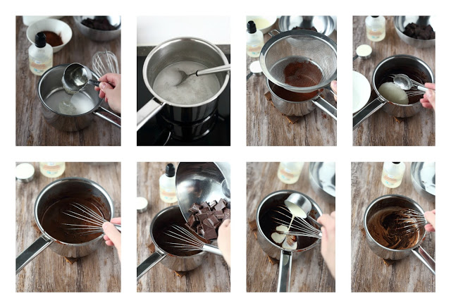 Taisin mainita jo ylempänä, että nappasin tumman mirror glaze-ohjeen aiemmasta appelsiinisuklaajuustokakkuohjeestani. Tätä kakkua varten suurensin ohjetta noin 1.43 -kertaiseksi. Tuo kuorrute on maultaan ihanan voimakkaan kaakaoinen ja sen koostumus muistuttaa hieman vanukasta.  Vähän samaan tyyliin voisikin tehdä vanukasta, hmmm, sitä(kin) pitää kokeilla.