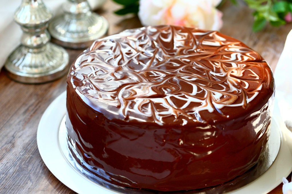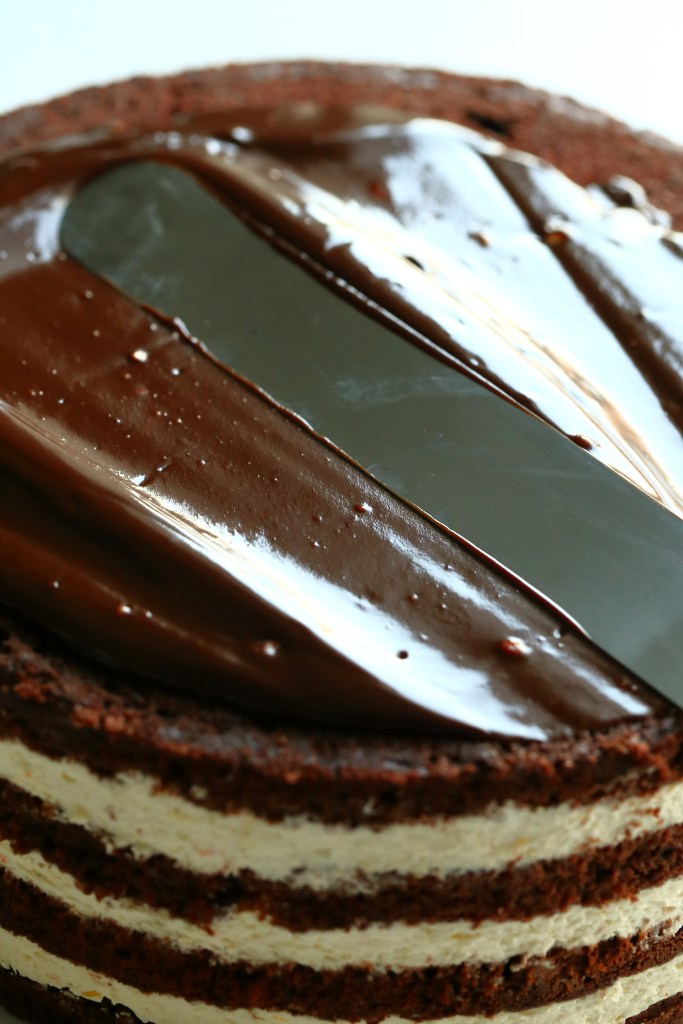 Suklaakakku appelsiinitäytteellä ja mirror glazella