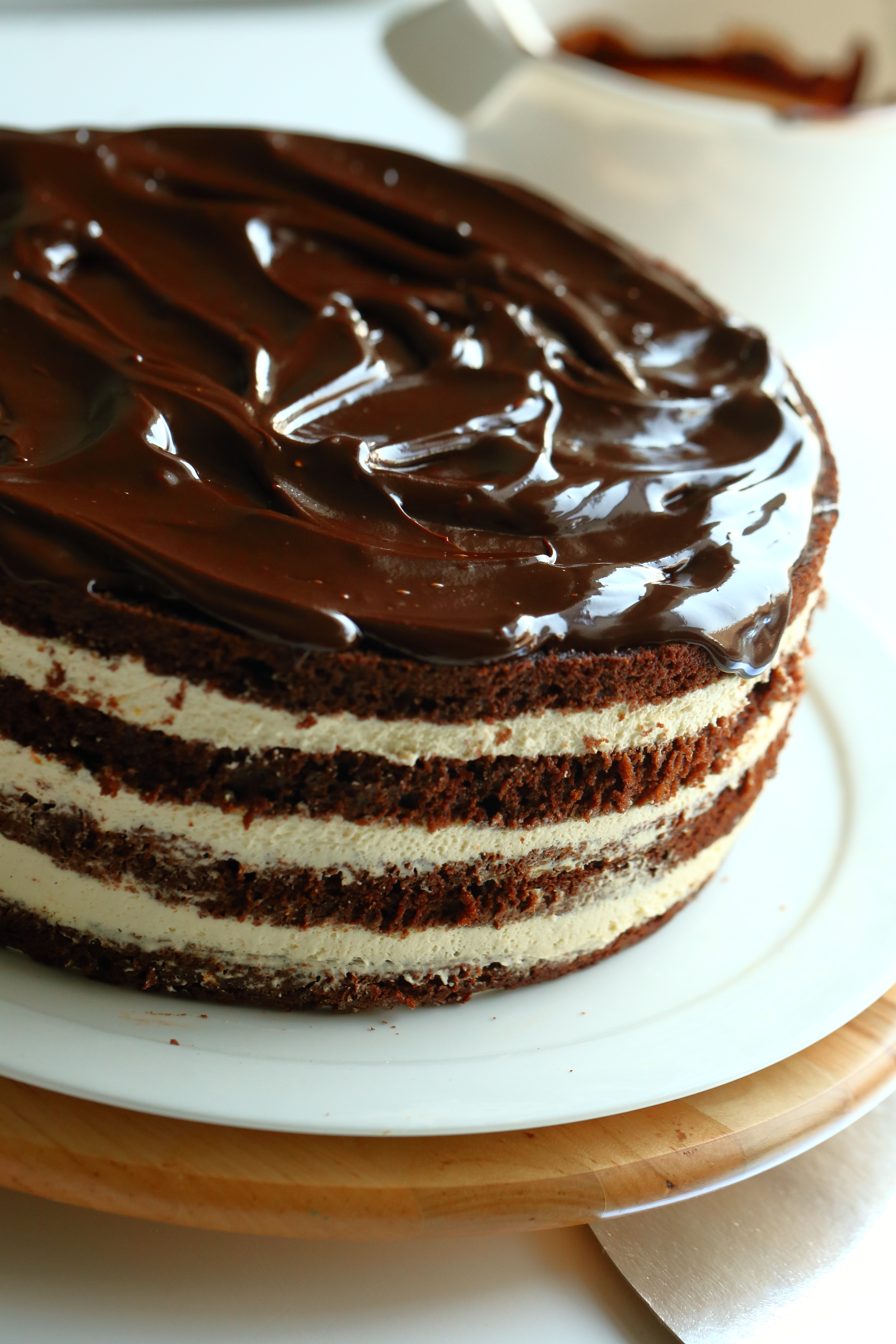 Ennen mirror glazea tasoitin kakun pinnan ohuella kerroksella suklaaganachen tyyppistä suklaakuorrutetta. Levittelin suklaan kakun pintaan heti kun suklaaseos oli hieman kiinteytynyt, mutta edelleen pehmeää. Vielä hieman lämmin suklaa oli tuossa vaiheessa niin kiiltävää ja herkullisen näköistä, että olisi tehnyt mieli lipaista sitä hieman. Maltoin kuitenkin mieleni ja levittelin suklaan kakun päälle ja reunoille. Sen jälkeen annoin mieliteolla vallan ja lusikoin edelleen pehmeää suklaaganachea suoraan kulhosta suuhuni. Oijjoijjoi, kyllä maistui. Sitten jatkettiin nopsaan kakun tekoa. Kuorrutteen levittämisessä ja tasoittamisessa saa olla muuten melko nopsa, sillä kuorrute jämähtää kylmän kakun pintaan kiinni äkkiä. Sillä pinnasta saa kuitenkin tasaisen mirror glazella viimeistelyä varten.
