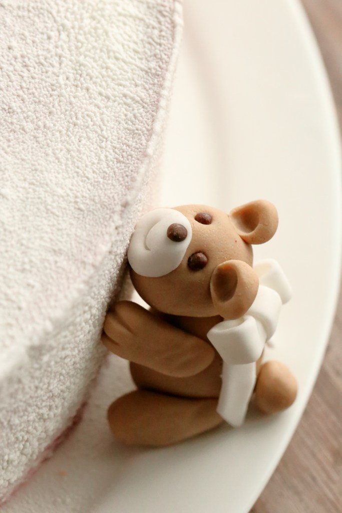 Koristeeksi tulevat nallet tuli tehtyä kahdessa erässä. Ensimmäiset nallet tein jo aiemmin keväällä. Niiden piti päätyä jo saman pojan ristiäiskakun päälle, mutta sairastelu sotki suunnitelmat. Nyt kun kakkuja tuli kaksi, tein nalleja lisää. Nalleista muuten huomaa, kuinka harjoitus tekee mestarin. Tai no ei tuo yhden kerran harjoituskiekka nyt sentään mestaria tehnyt, mutta ainakin hitusen paremman. Mietinkin kehtaanko laittaa ensimmäisiä nalleja lainkaan kakun päälle, kun olivat niin eri maata kuin myöhemmin tehdyt. Aikaa ei kuitenkaan ollut tehdä uusia, joten näillä mentiin. Suklaaspraylla koristeltu kakku sai nallet suoraan päälleen meiltä lähtiessä, mutta suklaaganachekakkua varten pakkasin nallet mukaan erilliseen rasiaan, jotta pysyivät hyvänä tarjoiluhetkeen asti.
