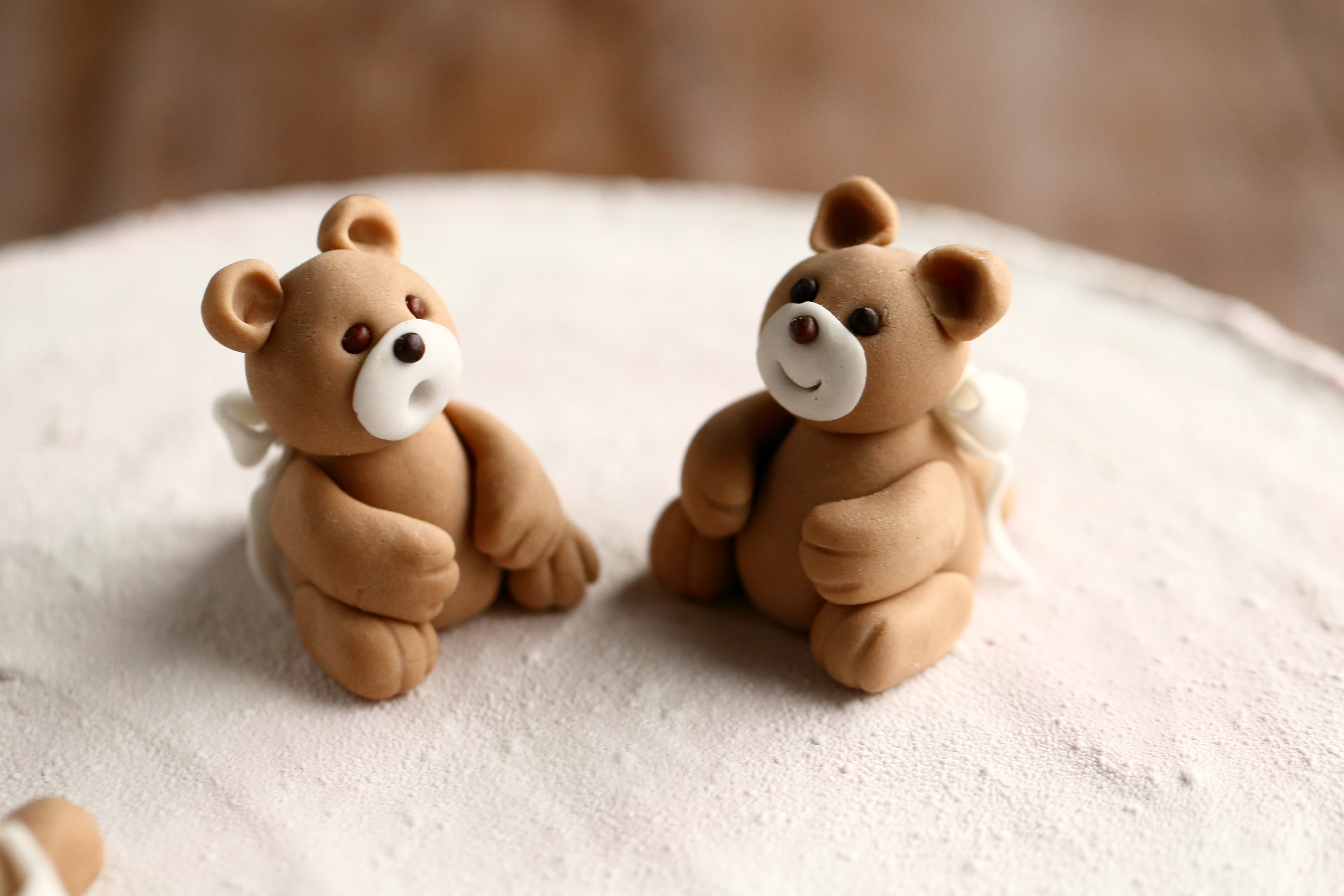 Koristeeksi tulevat nallet tuli tehtyä kahdessa erässä. Ensimmäiset nallet tein jo aiemmin keväällä. Niiden piti päätyä jo saman pojan ristiäiskakun päälle, mutta sairastelu sotki suunnitelmat. Nyt kun kakkuja tuli kaksi, tein nalleja lisää. Nalleista muuten huomaa, kuinka harjoitus tekee mestarin. Tai no ei tuo yhden kerran harjoituskiekka nyt sentään mestaria tehnyt, mutta ainakin hitusen paremman. Mietinkin kehtaanko laittaa ensimmäisiä nalleja lainkaan kakun päälle, kun olivat niin eri maata kuin myöhemmin tehdyt. Aikaa ei kuitenkaan ollut tehdä uusia, joten näillä mentiin. Suklaaspraylla koristeltu kakku sai nallet suoraan päälleen meiltä lähtiessä, mutta suklaaganachekakkua varten pakkasin nallet mukaan erilliseen rasiaan, jotta pysyivät hyvänä tarjoiluhetkeen asti.
