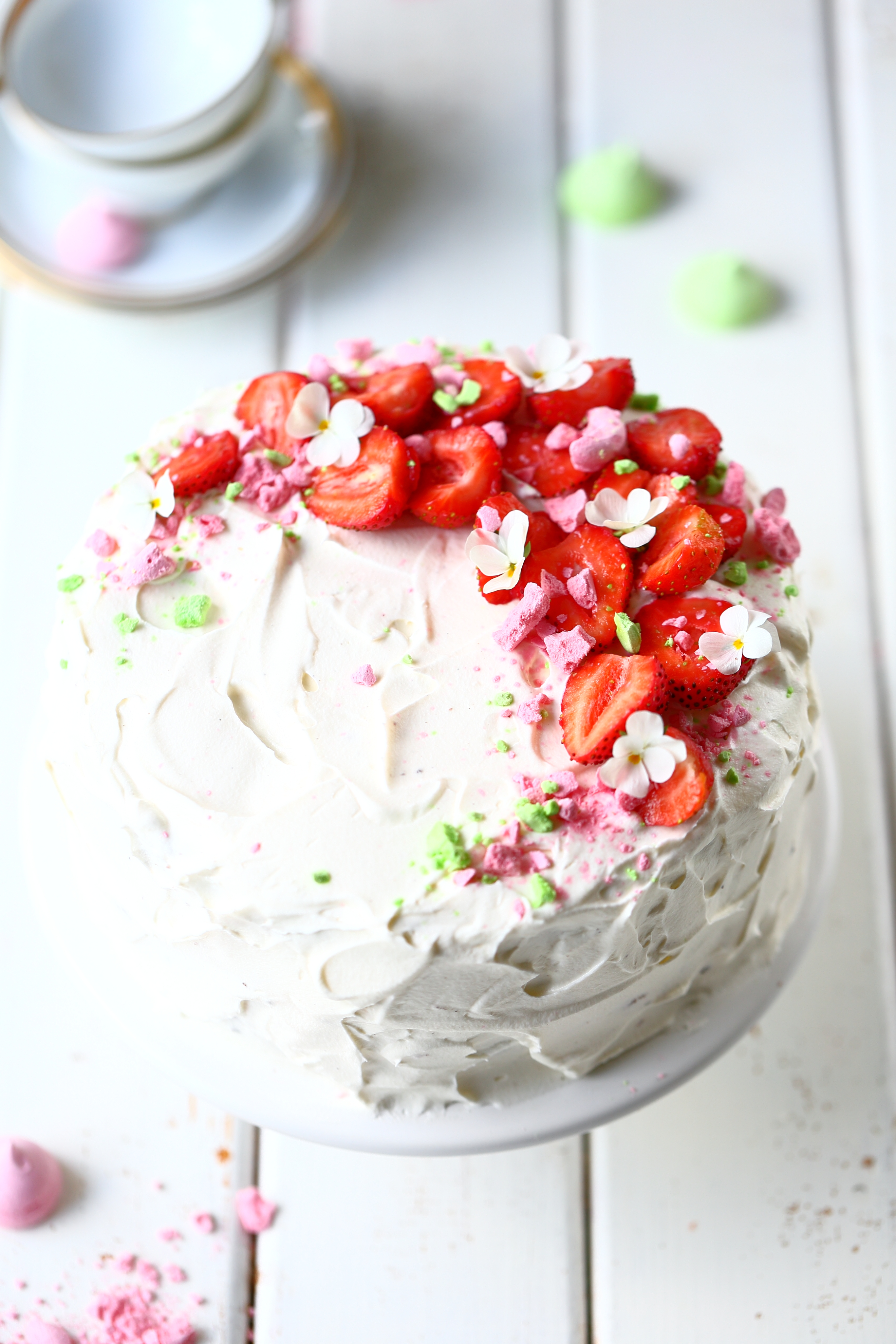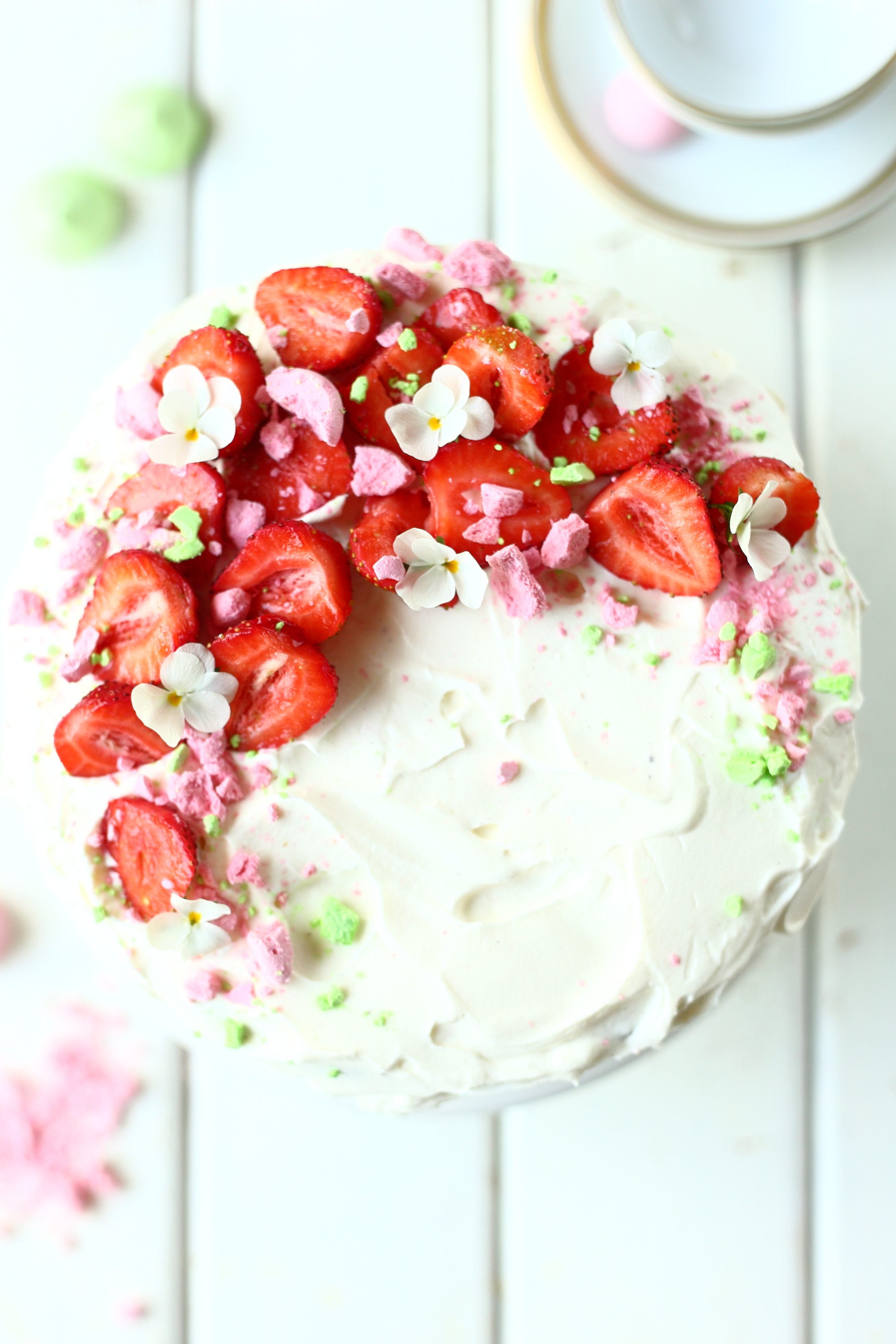 Vatkaa vispikerma vaahdoksi. Vatkaa joukkoon myös notkistettu tuorejuusto sekä vaniljasokeria. Levitä kerma-tuorejuustoseos kakun pintaan rennoin ottein. Koristele mansikoilla ja esim. marengille ja syötävillä kukilla.