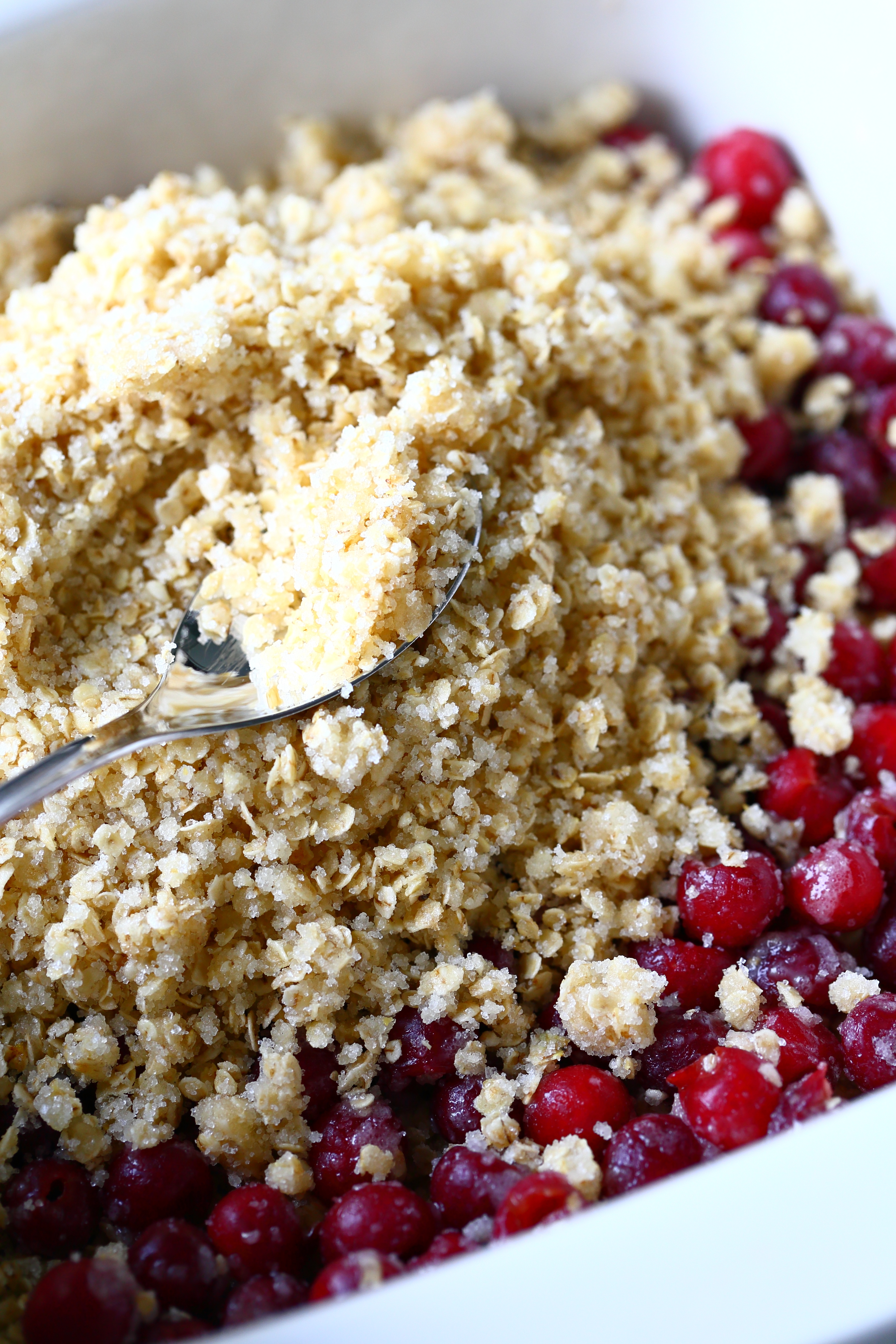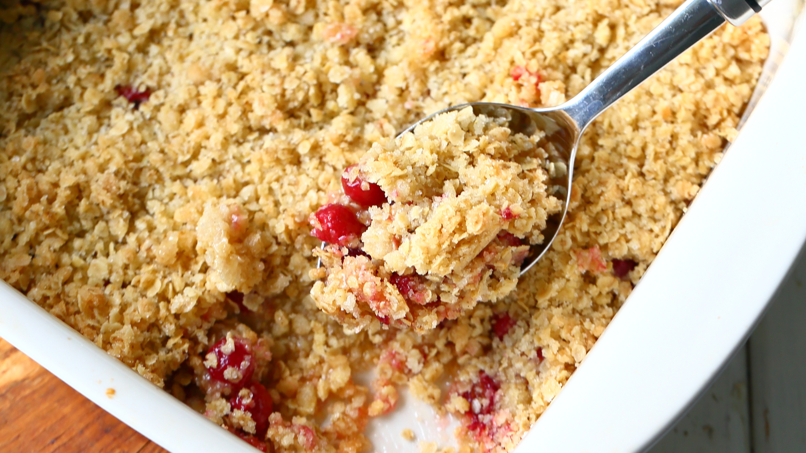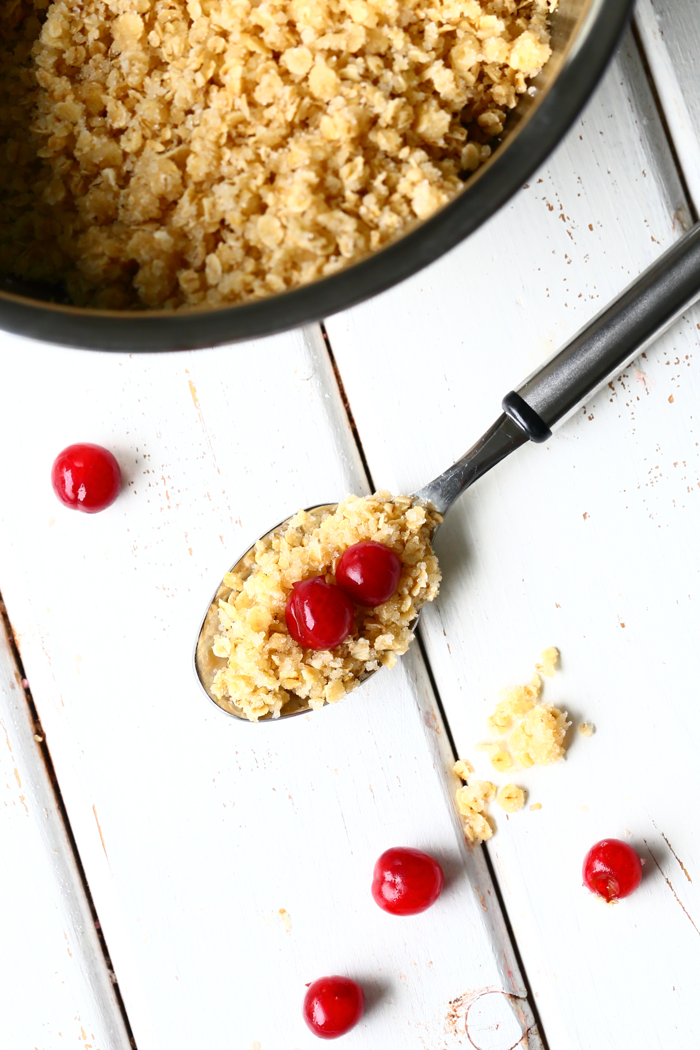 Varmista, ettei hapankirsikoissa ole siemeniä. Itse poimin kirsikat puusta niin, että siemenet jäivät puuhun. Jos siällä on siemeniä, niin poista ne. Voit myös halkaista kirsikat siemenen poistoa varten. Laita kirsikat vuokaan. Lusikoi päälle kauramuru.