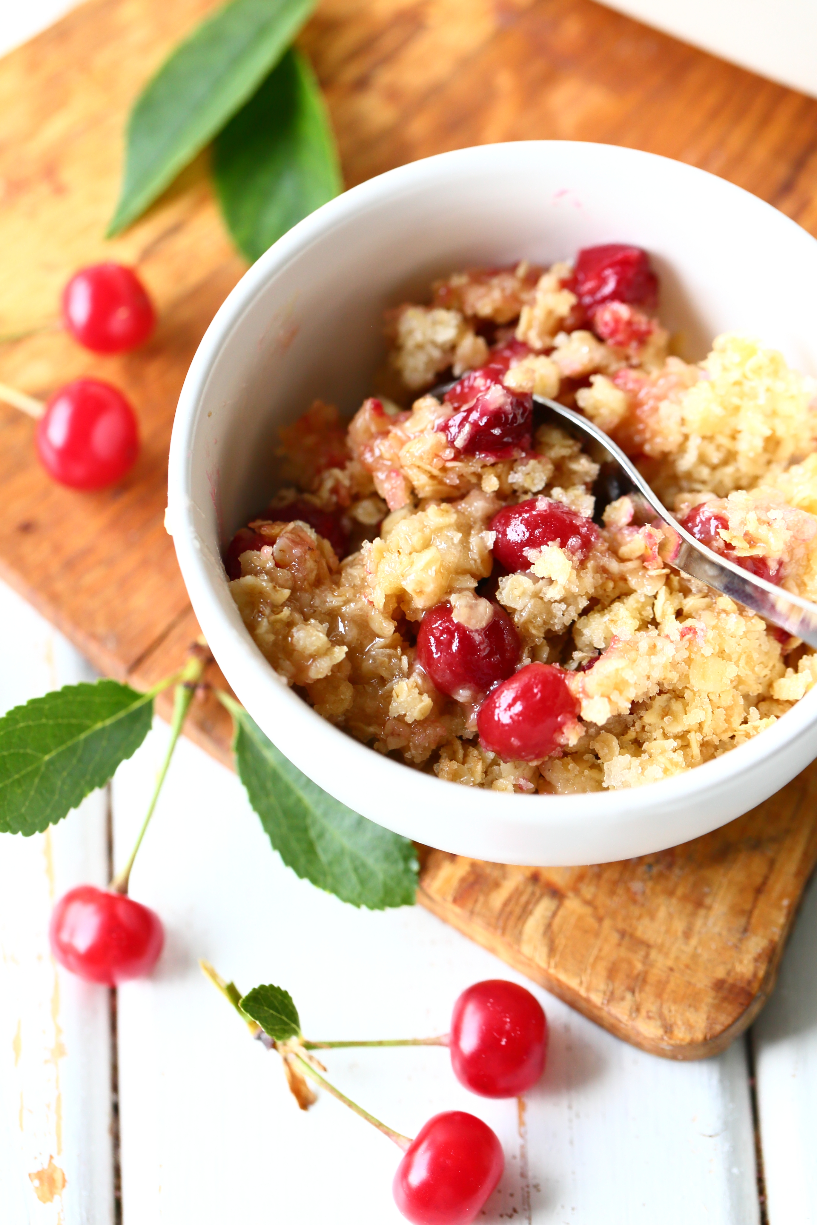 Vai voiko kauramurupaistosta leivonnaiseksi sanoakaan? Joka tapauksessa, on se leivontaa tai ei, niin älyttömän hyvää se on! Meillä tätä kirsikka-kaurapaistoksesta tykkäsivät kaikki. Myös vanhempi tytöistä, jolle tällaiset hieman happamammat marjat eivät juurikaan maistui. Ja myös nuoremmalle tytölle, joka on vedellyt kirsikoita suoraan puusta suuhunsa varmaan jopa isommat määrät kuin itse olen jaksanut. Myös pojalle maistui. Jopa niin paljon, että meinasi itku päästä, kun paistos loppui. Ja se loppui äkkiä. Niin äkkiä, että tein heti seuraavana päivänä uuden satsin, pienin muutoksin. Eikä aikaakaan, kun kaurapaistos oli taas tehnyt katoamistemppunsa.