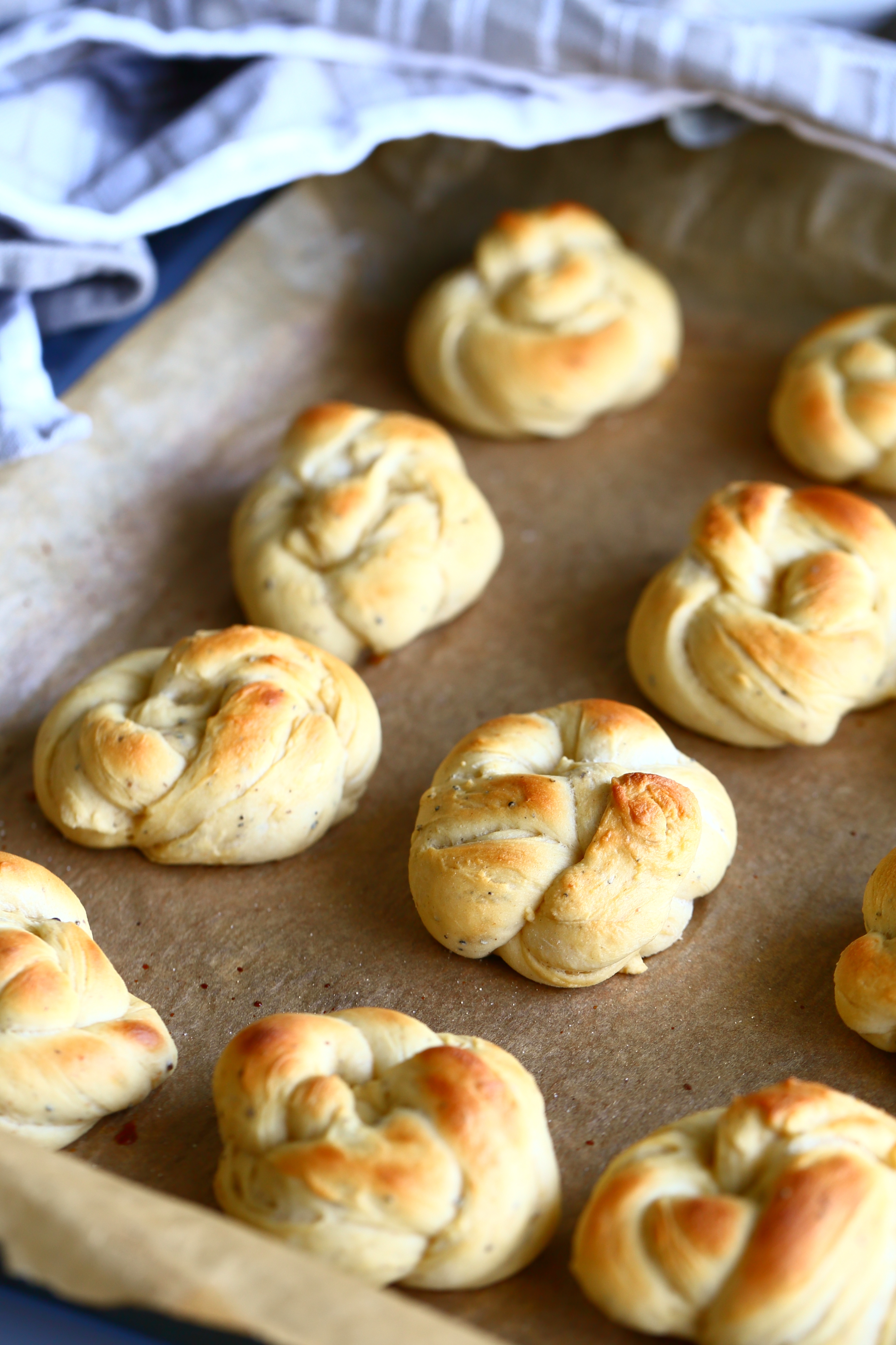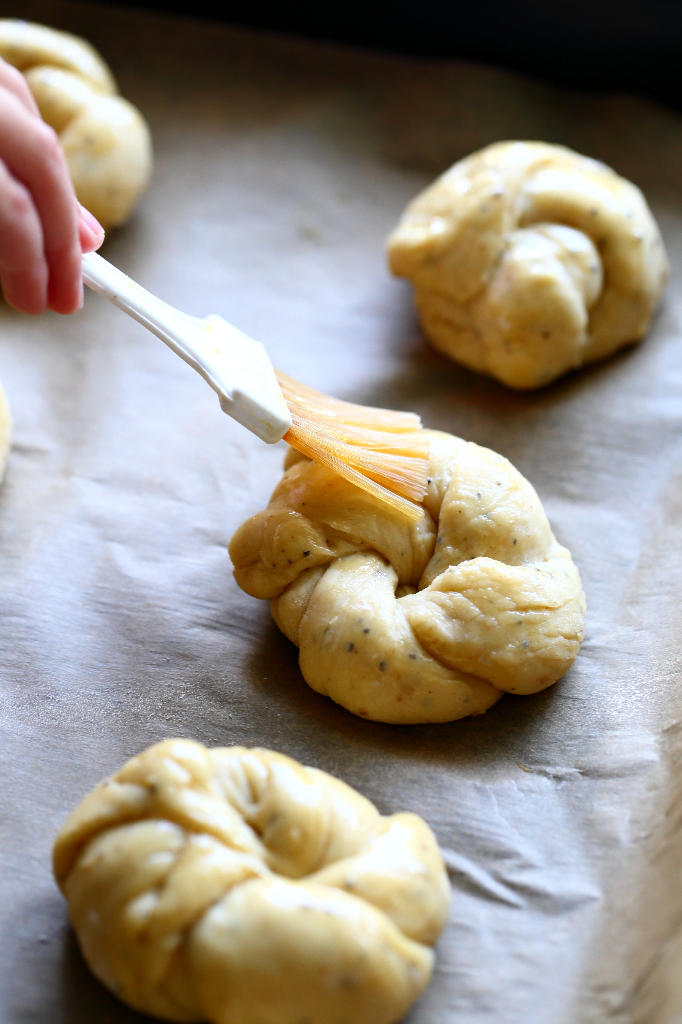 Nosta solmus uunipellille leivinpaperin päälle ja anna kohota liinan alla n. 45 minuuttia tai kunnes ne ovat hyvin kohonneet. Laita uuni lämpenemään 225 asteeseen.