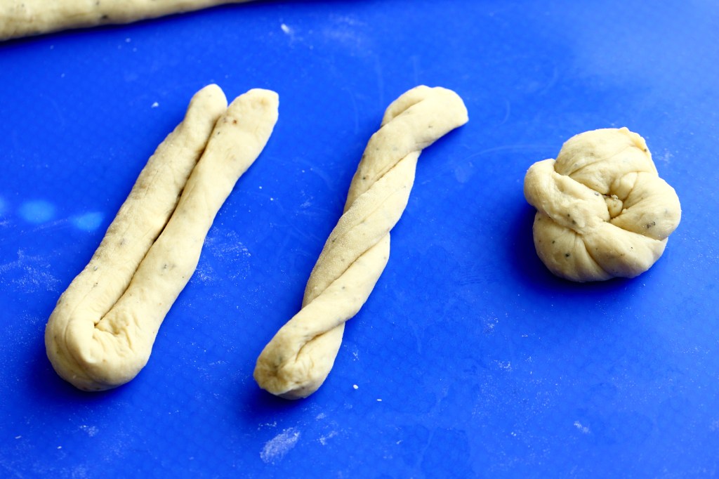 Rullaa palat pitkiksi, n. 40 cm pötköksi. Taita pötköt puoliksi, kierrä itsensä ympäri muutama kerta ja tee lopuksi solmu. Tähän tyyliin. (ks. myös vinkki-osio alempaa).