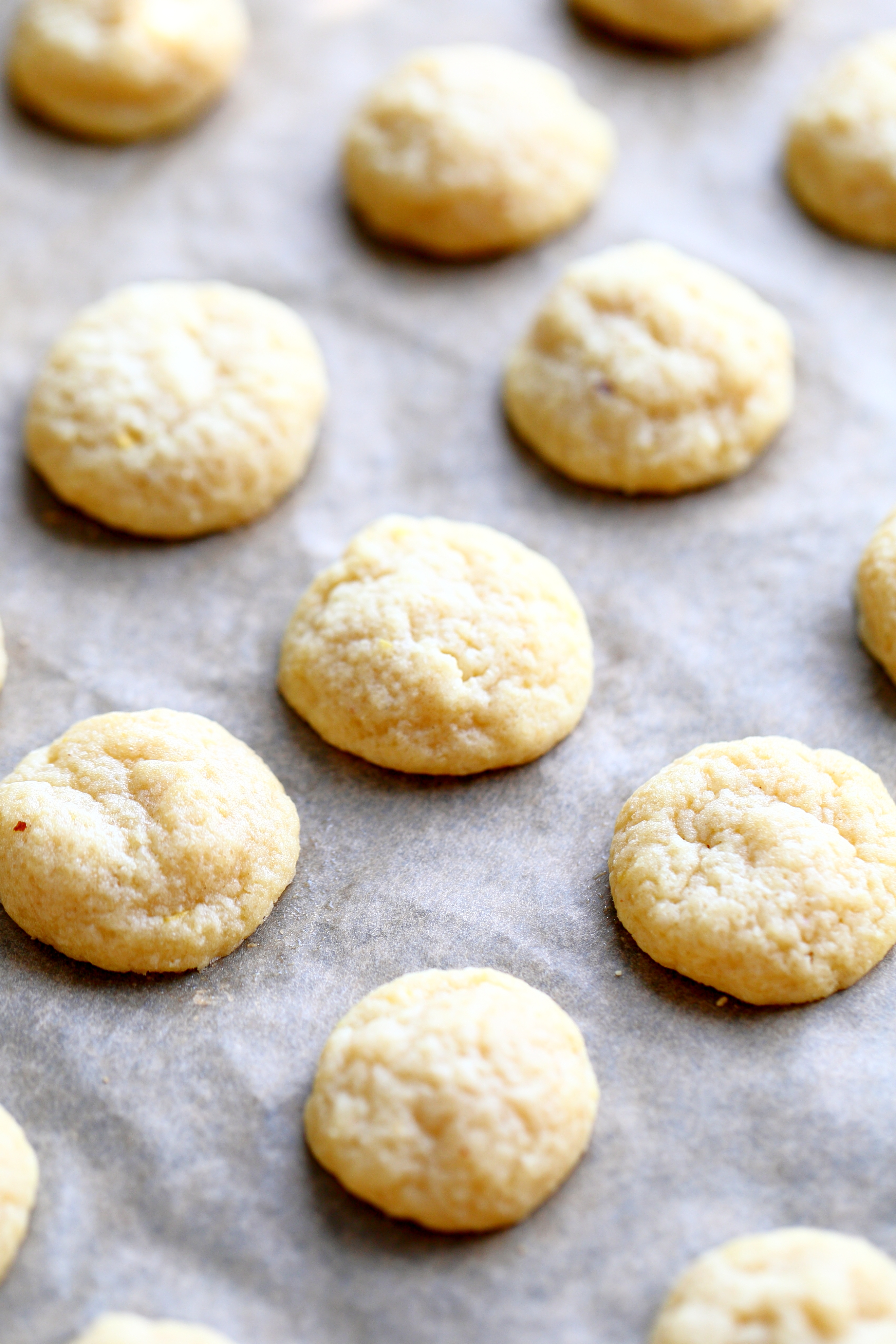 Maistelin töissä kevään aikana useampaankin otteeseen herkullisia sitruunaisia, rapeita keksejä. Joka kerta maistaessa haaveilin tekeväni samantapaisia sitruunakeksejä itsekin, mutta vain pehmeinä versioina. Lasten synttäreiden lähestyessä tajusin hetken olevan käsillä. Kaivoin esille maukkaiden mantelikeksien ohjeen, johon ihastuin jo muutama vuosi sitten ja muovasin siitä vain sitruunaisen. Ja kyllä kannatti! Näistä tuli ihania! Siis niin pehmoisia, suussasulavia, meheviä ja miedon sitruunaisia, että nams! Onneksi koko annoksesta keksejä syntyi noin 50, sillä jo maisteluvaiheessa näistä aika monet katosivat jälkiäjättämättä… Loput jäivät juhlatarjottaviksi. Tai ainakin miltei kaikki. Myös osa jäljelle jääneistä hävisi ennen juhlapäivää, hups!