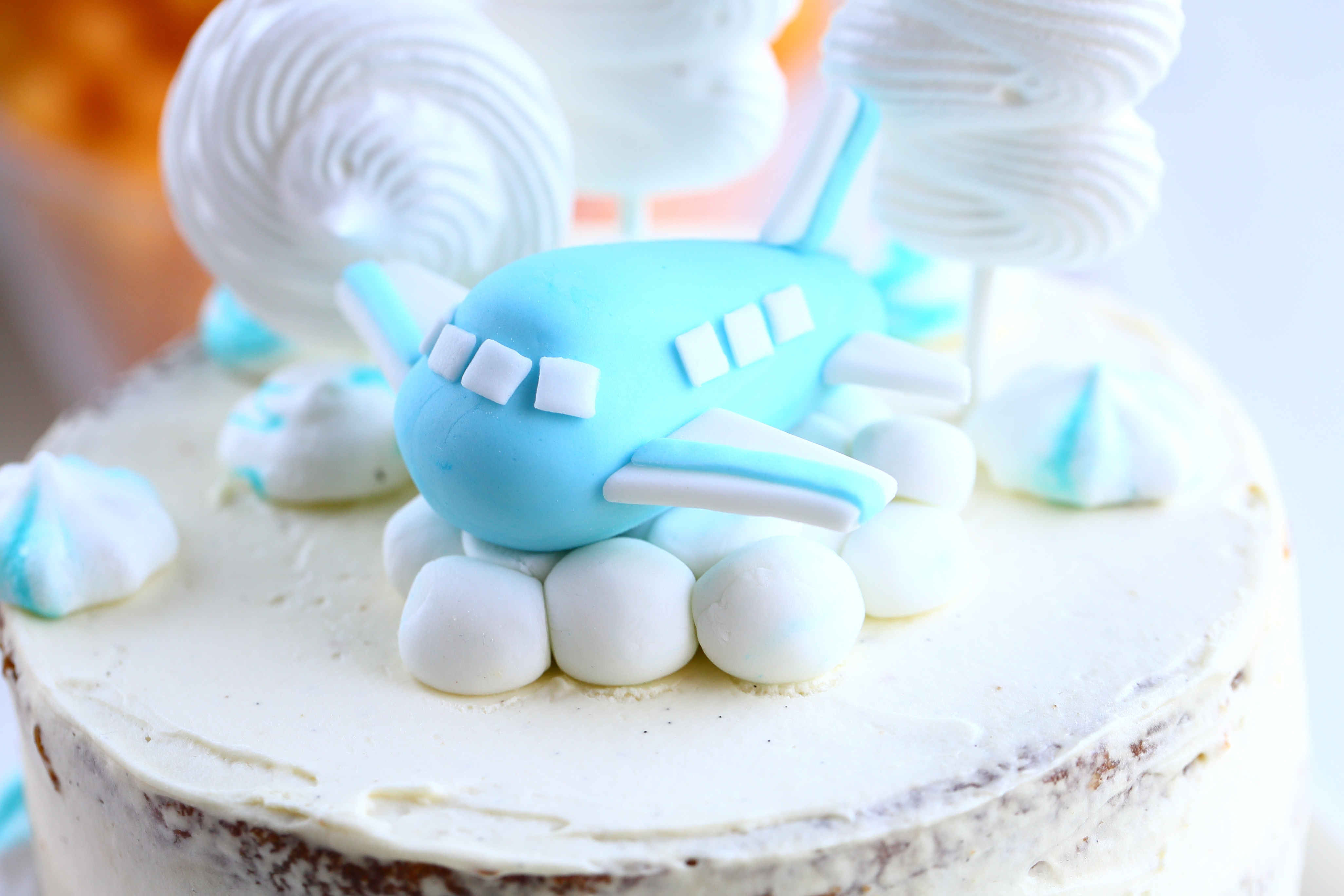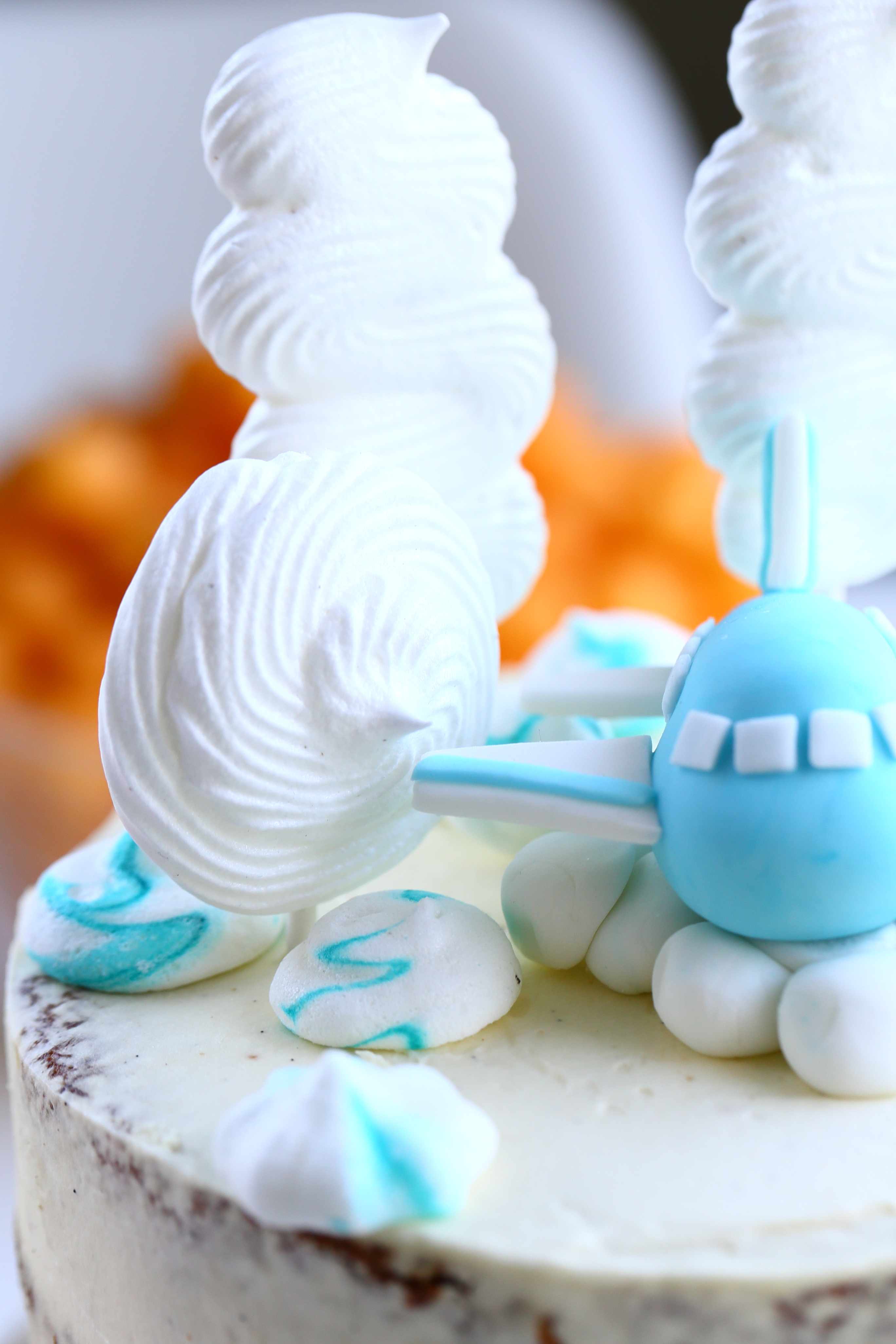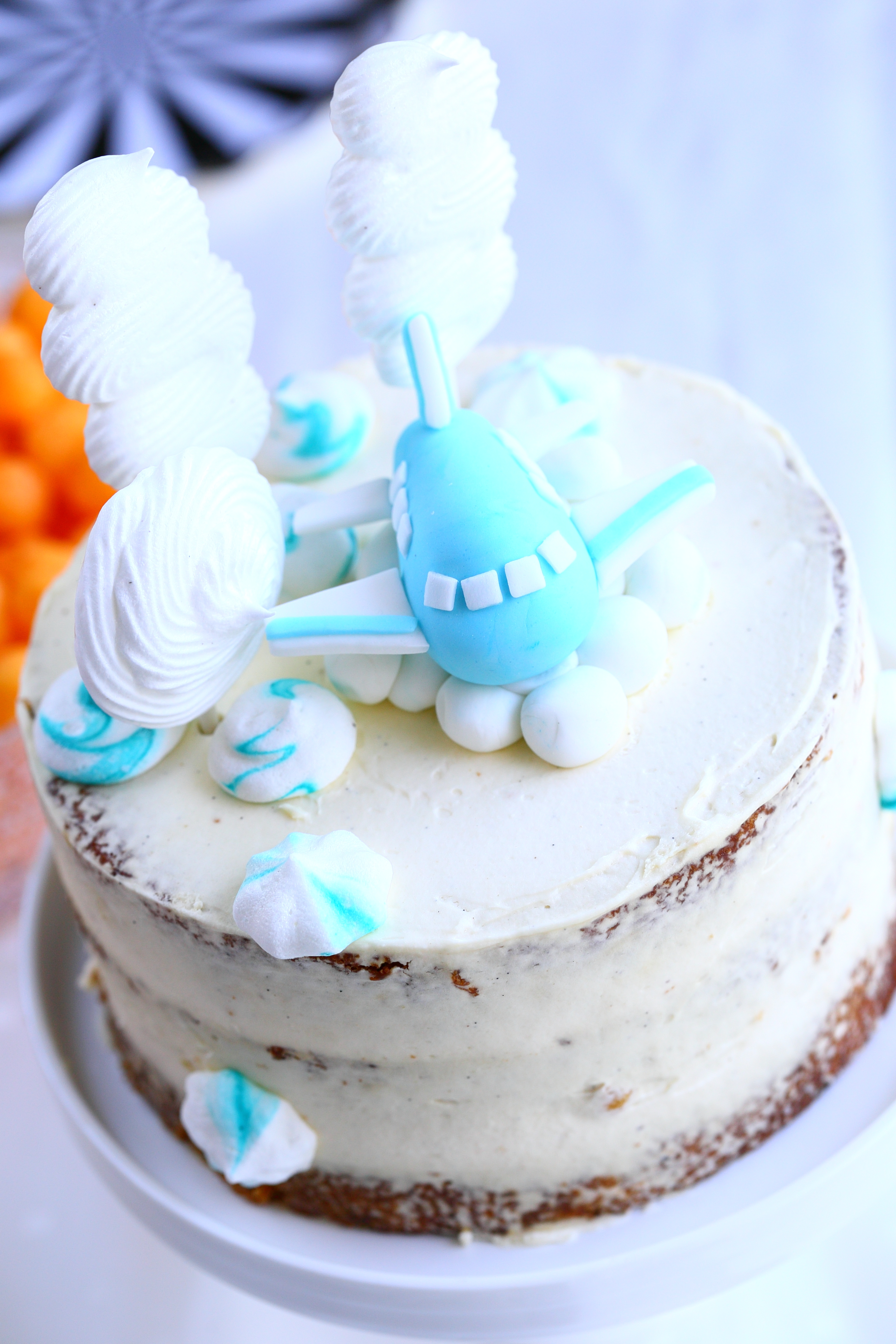 Heittelin kakun päälle koristeeksi lentokoneen lisäksi aiemmin tekemiäni munattomia marenkeja sekä uusia marenkeja, jotka tein tikun päähän. Nuo uudet marengit eivät vain tahtoneet onnistua niin hienosti kuin aiemmin tekemäni. Valmis marenkimassa toimi ensalkuun hienosti, mutta alkoi tosi nopsaan ”sulaa” pidellessäni pursotinpussia kädessa. Lieneekö lämpimillä keleillä tai lämpimillä käsillä ollut osuutta asiaan, vai olikohan kikherneliemessä jotain muuta häikkää… No, vaikka en saanut kakun päälle aivan niin paljon marenkeja kuin aikomukseni, niin tuli niitä muutama ihan onnistunut. Tosin kakku jäi mielestäni hieman liiankin paljaaksi, mutta näin tällä kertaa.