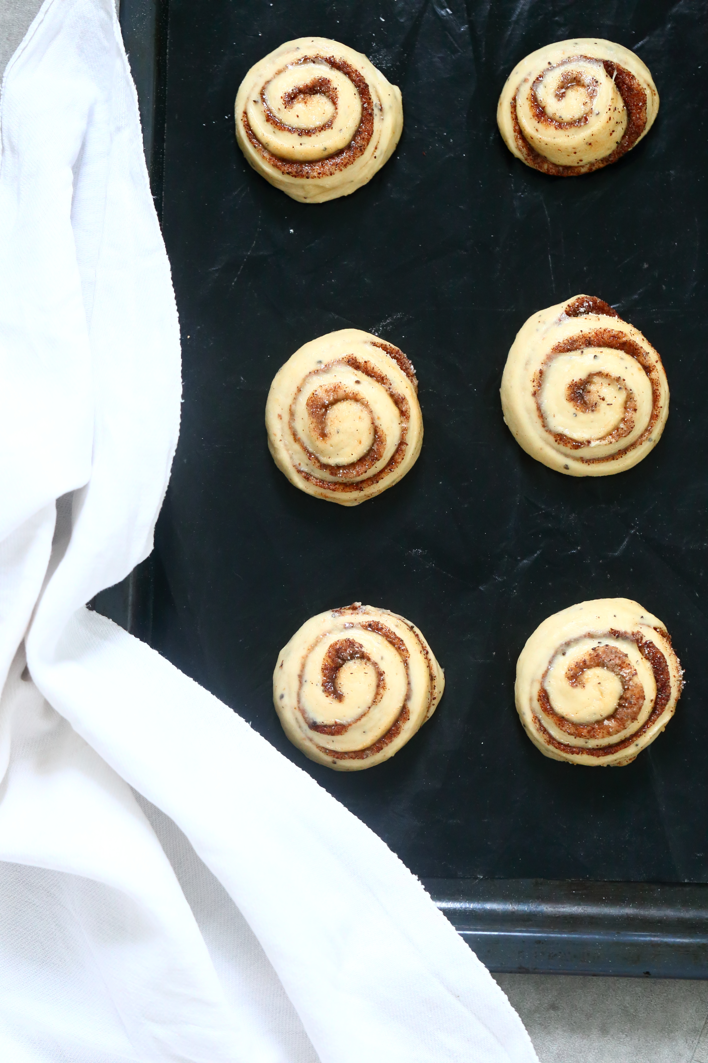 Kääri rullalle, jätä saumapuoli rullan alapuolelle. Leikkaa rulla noin 15 osaan. Asettele rullan ”häntä” pullan alapuolelle, jotta pulla pysyy muodossaan myös uunissa. Nosta palat joko suoraan pellille tai muffinssivuoan koloihin. Tee toiselle levylle sama juttu eli kaulitse, täytä, rullaa ja leikkaa.