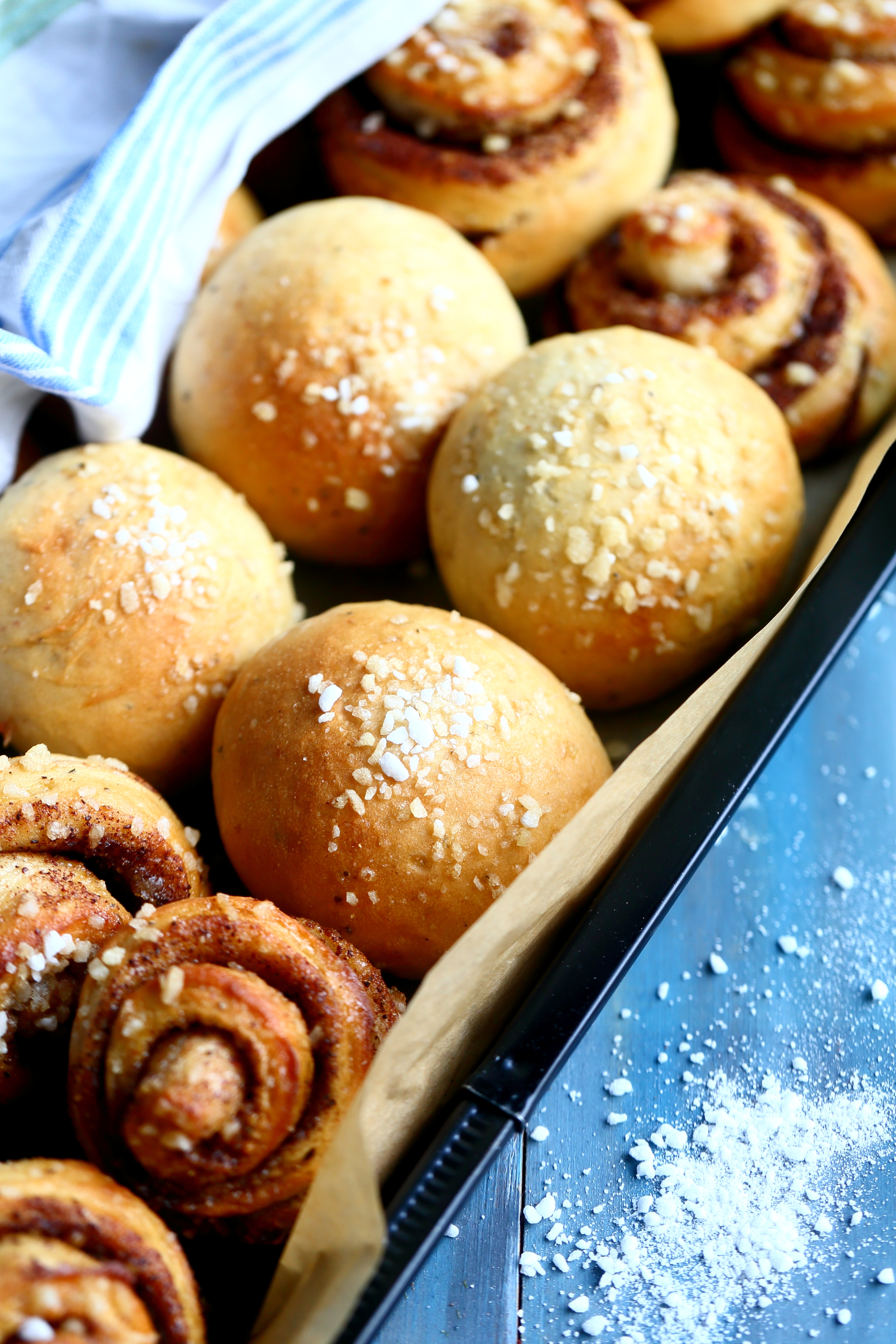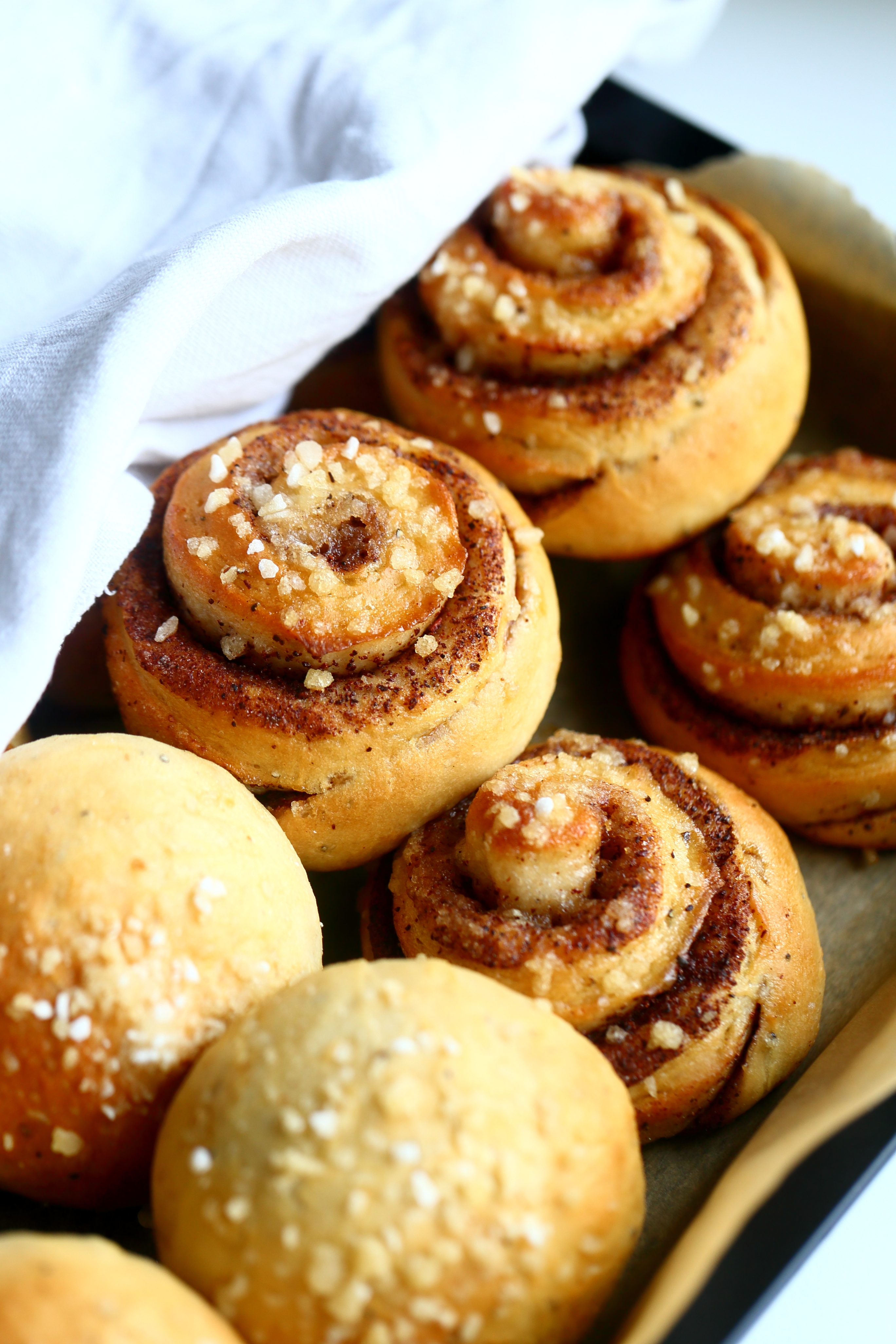 Olen tainnut jo usein kertoa, etten ole kovin hyvä pullanvääntäjä. Korvapuustit ovat onnistuneet ehkä kerran, mutta yleensä ne muistuttavat enemmän sammakoita kuin pullia… Tytön jalkkisjoukkueella oli vähän aikaa sitten myyntivuoro ja sain jostain syystä päähäni tehdä sinne pullia. Miltei kaduin tuota lupausta heti sen tehtyäni. Pullat ovat kuitenkin olleet jostain syystä näin aikuisiällä niin hankalia, että haluan käyttää kaikki mahdolliset pullien leipomismahdollisuudet harjoitellakseni niiden tekoa. Ja kyllä, tarkoitin aikuisiällä, sillä lapsena tuli tehtyä pullaa vaikka kuinka, ja silloin ne onnistuivat. Tai ehkä lapsena ei tullut katsottua pullan ulkomuotoa samalla tavalla kuin nykyään, vaan maku oli tärkein. Niin kuin se on tietenkin nykyäänkin. Se maun takia uskalsinkin leipoa pullia buffettiin tarjolle, vaikka ne eivät olisikaan aivan täydellisen näköisiä. Eikä niistä kauniita tullutkaan. Kameraankaan ei tarttunut yhtään julkaisukelpoista kuvaa. Ja tuohan harmitti sen verran, että päätin tehdä mahdollisimman pian uudestaan niitä. Tällä kertaa testasin pehmoisen rahkapullataikinan sijasta vegaanisesta taikinasta ja tein myös korvapuustien sijasta pyöreinä peruspullina ja peruskierrepullina. Ja nyt tuli mielestäni kivoja 🙂