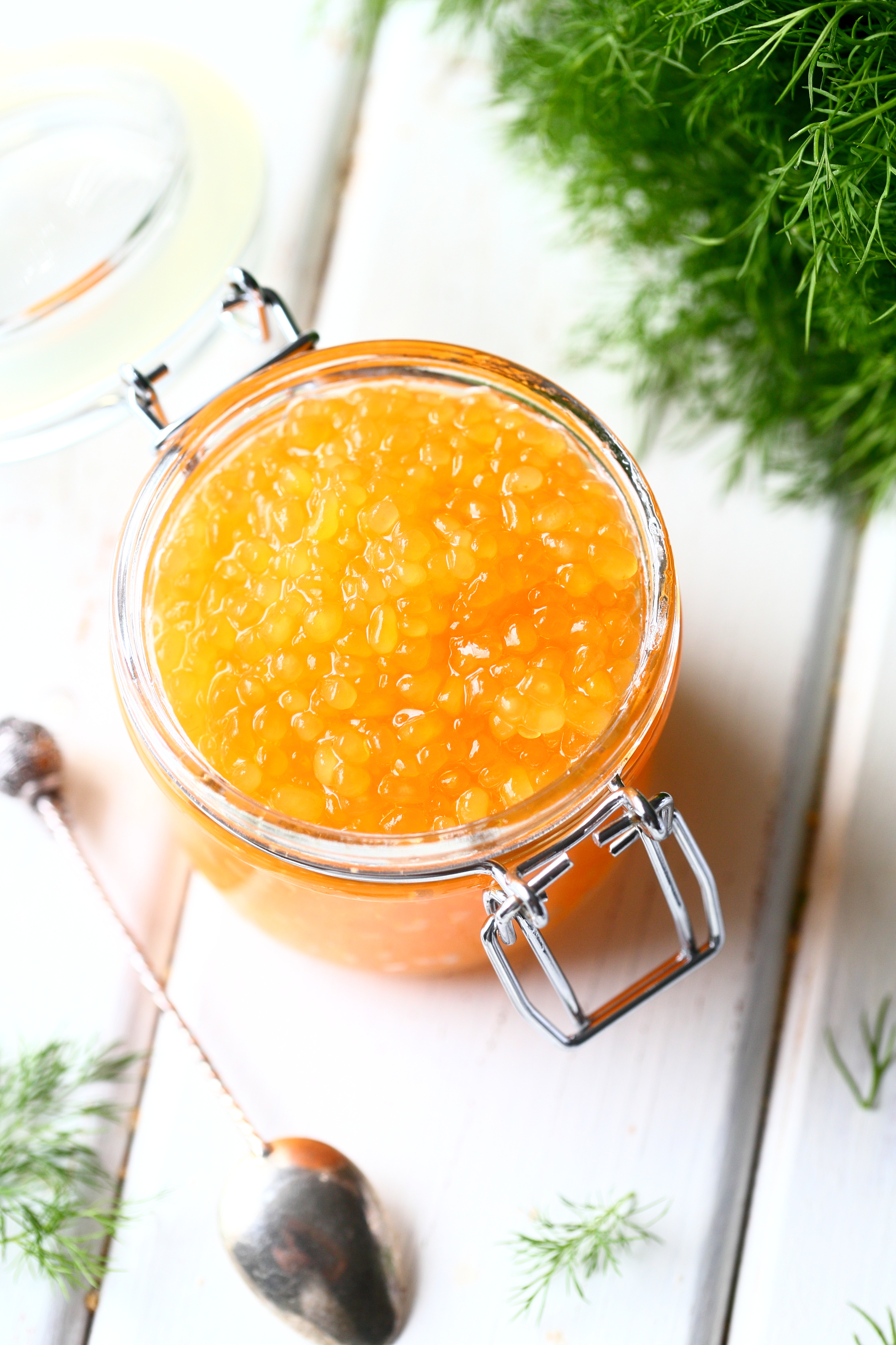 Vegaaninen mäti tai vegaari, kuten Perinneruokaaprkl-blogissa sanotaan, syntyy porkkanamehusta, perunasuurimoista, öljystä ja suolasta. Yksinkertaista ja helppoa. Ja nyt teitä varmaan jo kiinnostaa vastaukset yllä oleviin kysymyksiin, saako noilla aineksilla tehtyä vegaanista mätiä. Kyllä saa! Vegaari toimii mielestäni oikein mainiosti aidon mädin korvikkeena. Mielestäni tämä oli hyvin lähellä aitoa mätiä, kun miettii ulkonäköä. Koostumuskin oli hyvin likellä, vaikka olikin hieman pehmeämpi kuin aitossa mädissä. Pelkiltään maisteltuna maussa oli tunnistettavissa mieto porkkanamehun maku, mutta kun vegaaria nautiskeli ruisleivän ja sen päälle levitetyn kylmäsavulohituorejuuston kanssa, ei totuttaa välttämättä pystynyt maistamaan helposti. Juhlissakin tämä vegaaninen mäti upposi kuin väärä raha ja huijasin sillä (tahtomattani) juhlijoita 🙂