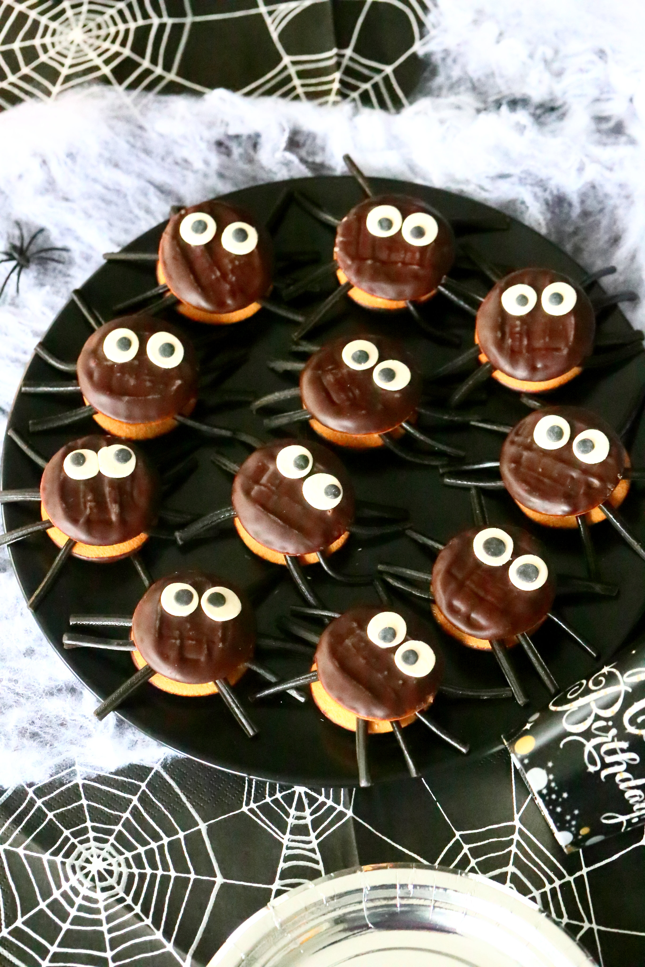 Levitä silmien takapuolelle ohuen ohut kerros tuorejuustoa tarttumapinnaksi ja aseta 2 silmää aina yhden hämähäkkikeksin päälle silmiksi. Ja eikun tarjoilemaan!