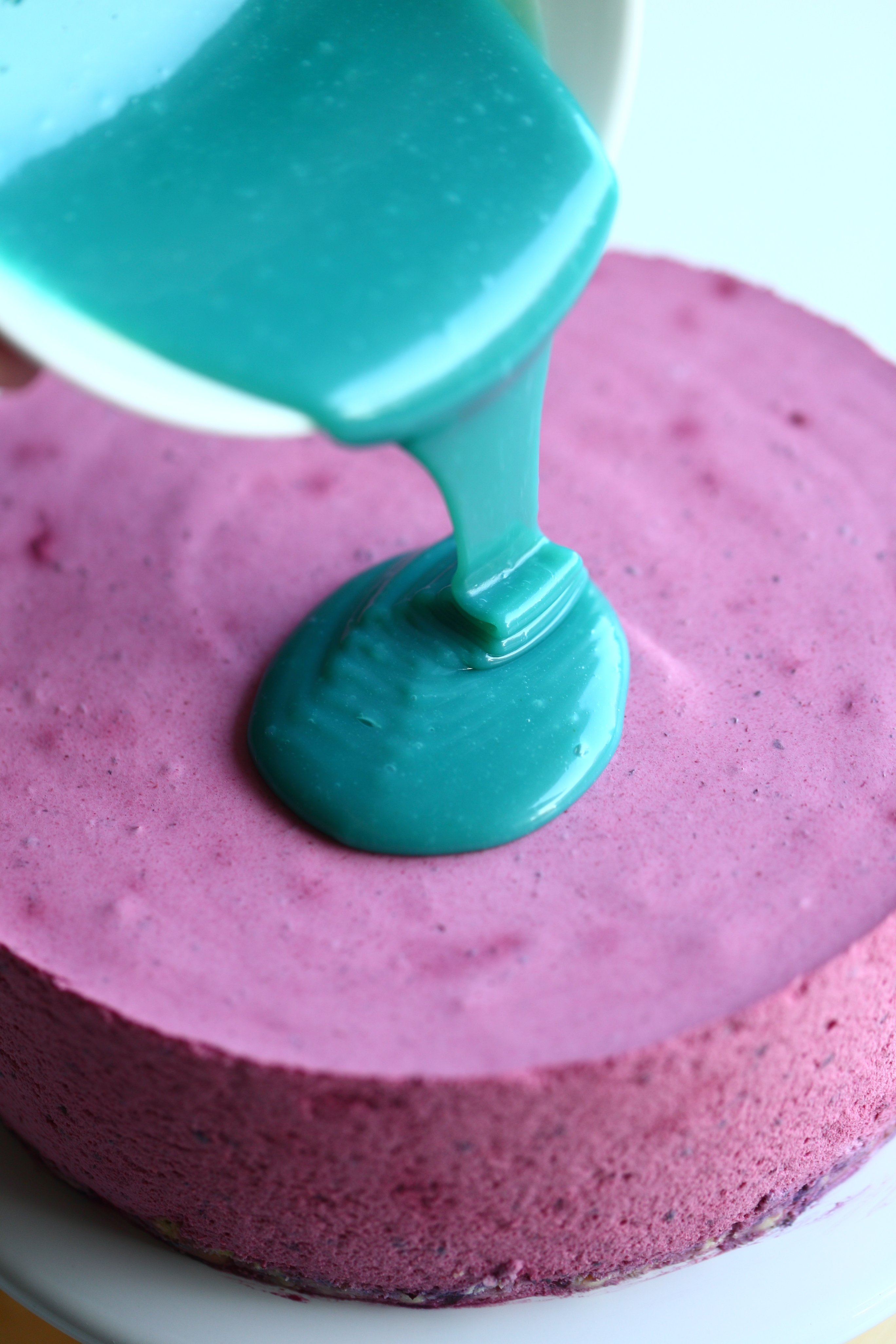 Tee kuorrutus. Pilko valkosuklaa mikron kestävään kulhoon ja kaada joukkoon kuohukerma. Kuumessa mikrossa välillä sekoitellen n. 10-15 sekunnin erissä, kunnes kaikki suklaa on kokonaan sulanut. Värjää valkosuklaaganache sinisellä pastavärillä. Odota, että ganache on melko paksua, mutta edelleen juoksevaa. Kaada kuorrute kylmän kakun päälle ja levitä varovasti esim. palettiveitsellä kakun päälle. Anna kuorrutteen valua hieman reunoilta alas. Laita kakku jääkaappiin