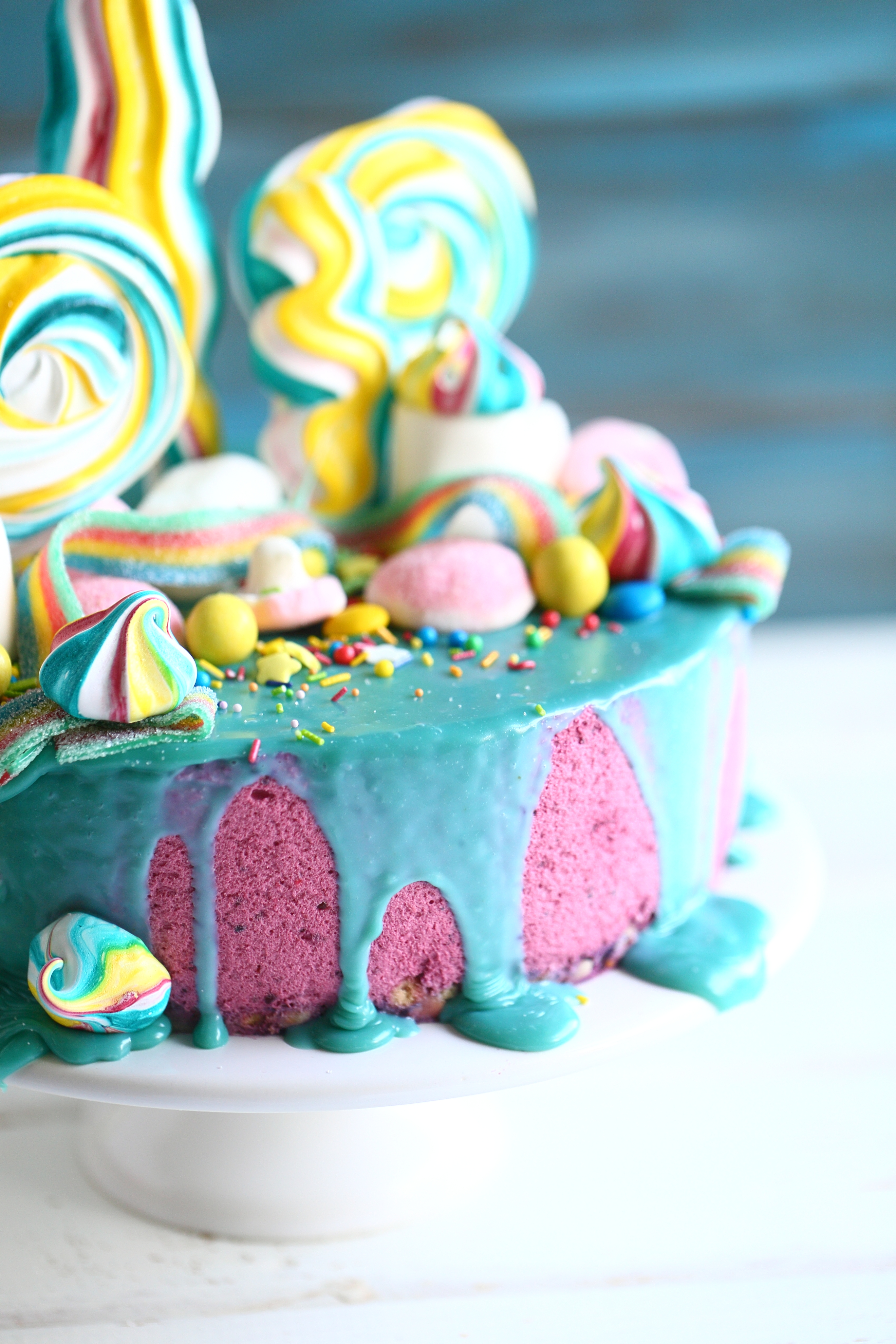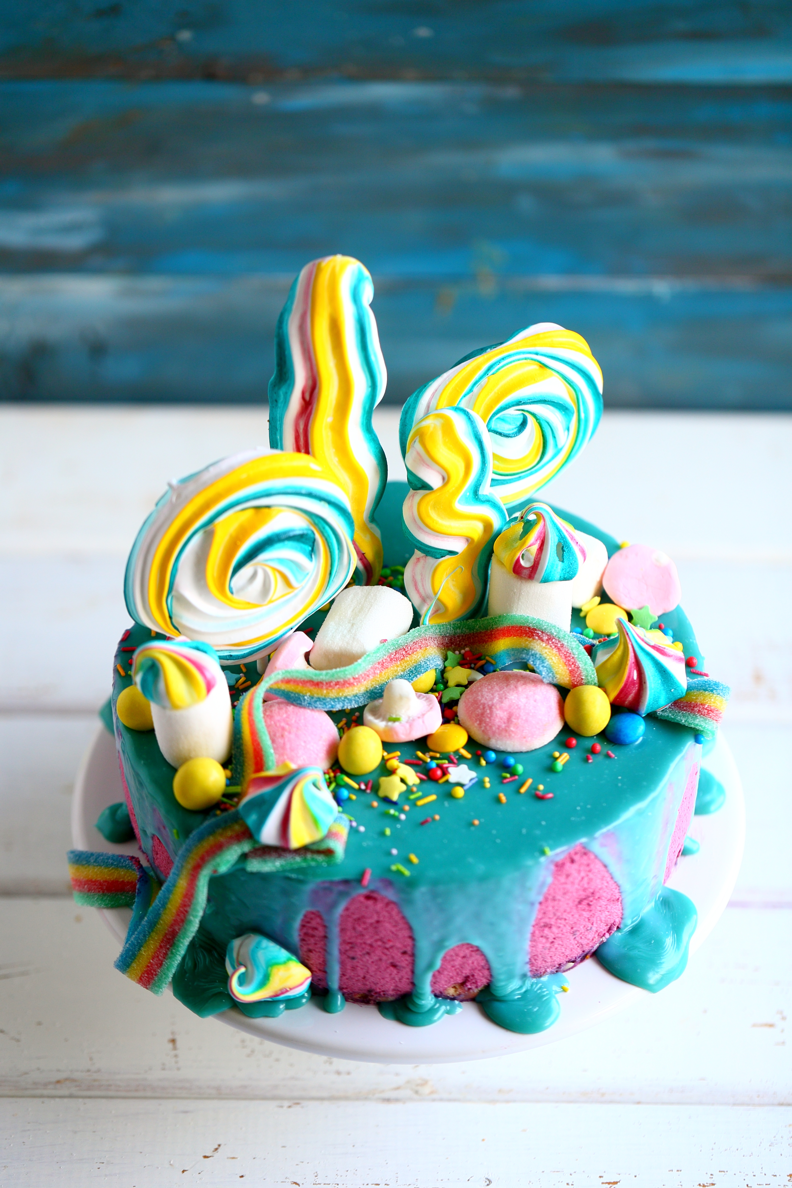 Tämä kakku päätyi 3 lapsemme yhteissynttäreille, jota juhlittiin lähisukuni kanssa jokin viikko sitten. Koska kakun piti sopia sekä tytöille että pojalle, toteutin koristelupuolen molemmille sopivana, sinisellä kuorrutteella, värikkäillä itsetehdyillä marengeilla ja karkkilaarista haalituilla karkeilla. Vähän kuin sirkusteemalla. Itse kakkuosa oli luonnostaan tuollainen kauniin pinkki. Tytöt tykästyivät kakkuun heti sen nähtyään ja huokailivat ääneen ihastuksesta. Ihania lapsia 🙂