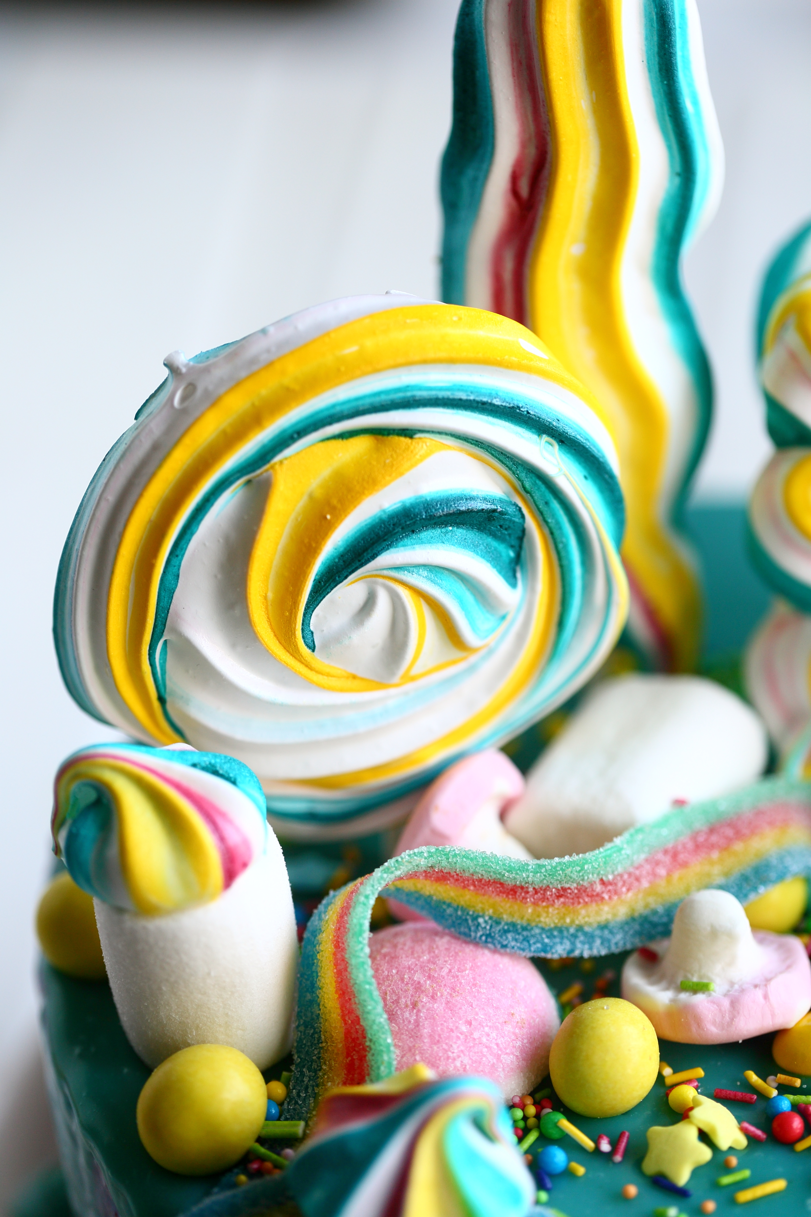 Koristele kakku hieman ennen tarjoilua marengeilla ja karkeilla.