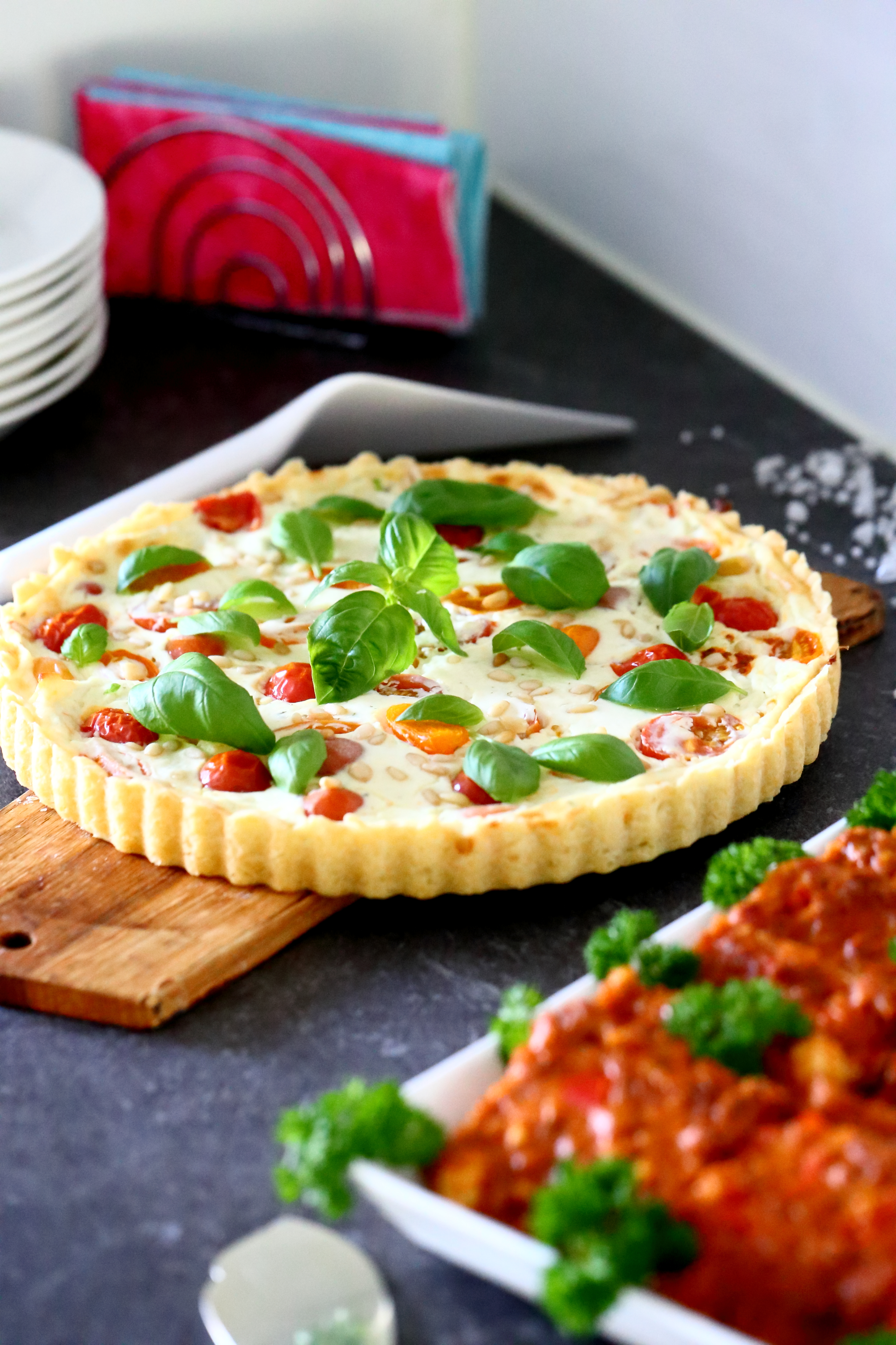 Tomaatti-vuohenjuustopiirakka (munaton) onnistui vihdoinkin, kun vaihdoin piirakan pohjan helppoon kolmen aineen pohjaan, jolla saa sopivan rapean ja mehevän pohjan samalla kertaa. Jopa ilman esipaistamista. Vuohenjuusto ja tomaatti yhdessä tzatzikityyppisen täytteen kanssa oli ihana makuelämys, johon myös mm. vanhempi tytöistä ihastui.