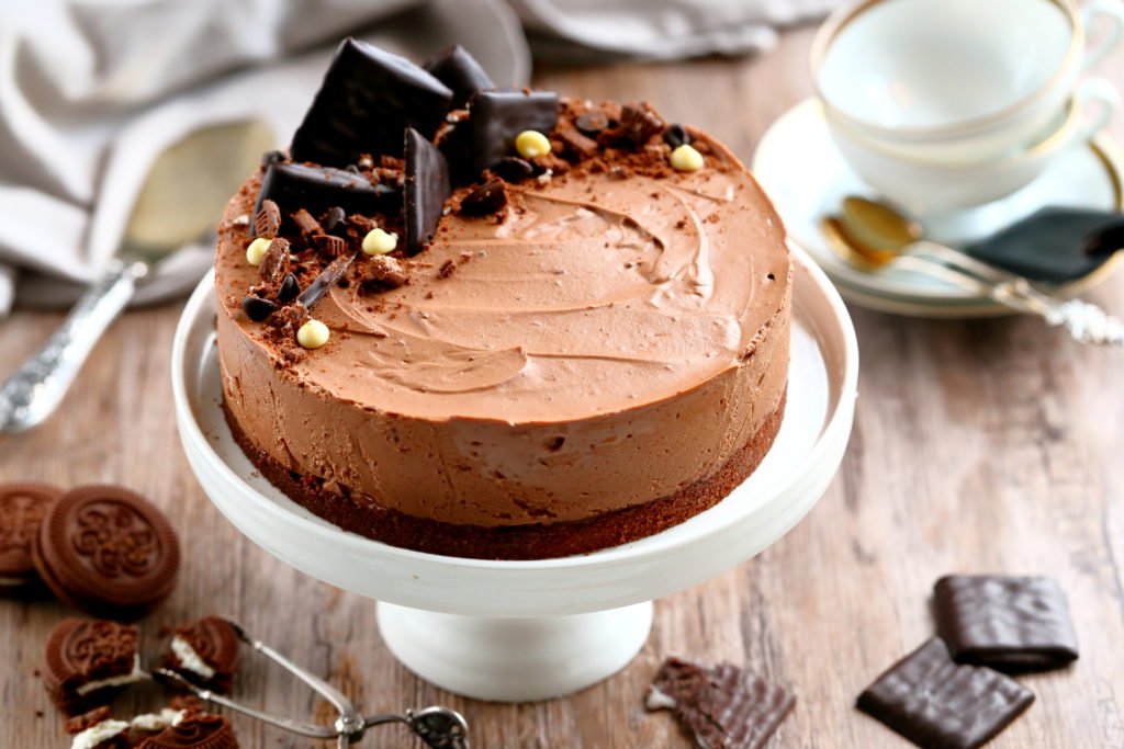Vietävän hyvä After eight-juustokakku valmistuu ilman liivatetta vain muutamasta aineesta. Kakku on raikas ja suklainen ja sanoisinkos, melko täyteläinen, joten myös pieni pala riittää. Ohjeessa käytetään tummaa after eightejä, mutta jos niitä ei satu löytymään, voi kakun tehdä mainiosti myös tavallisista versioista korvaamalla osan after eighteistä tummalla suklaalla.